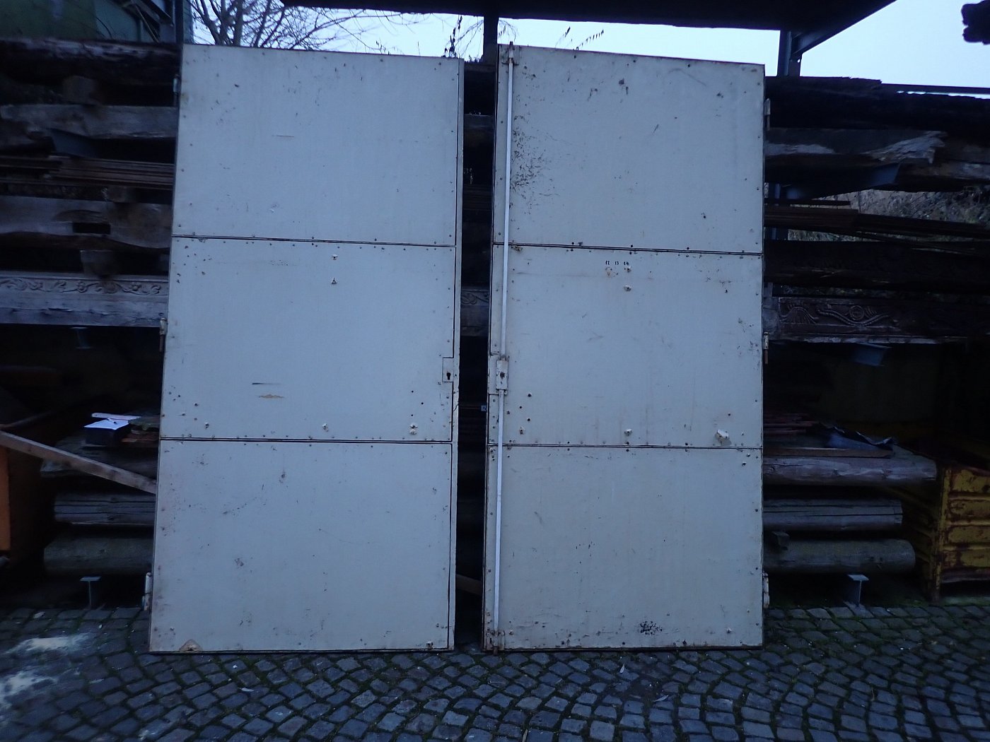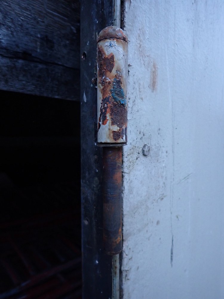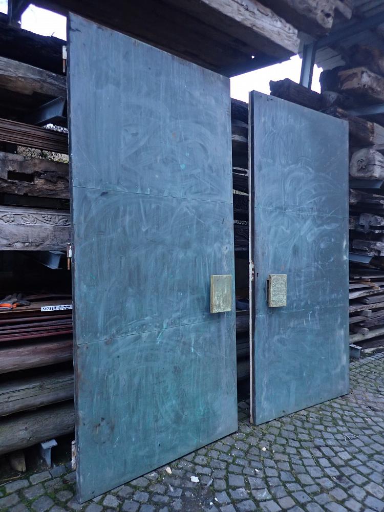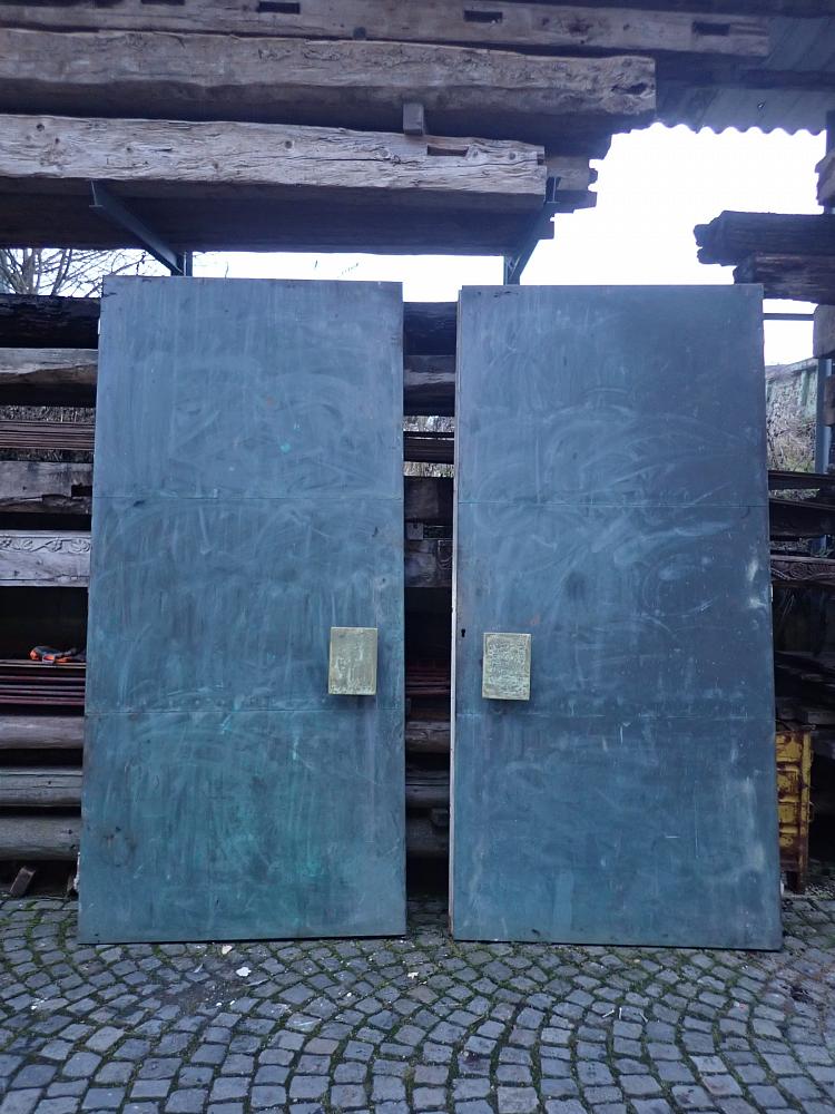 Die Tür besteht aus einem Metallgestell, welches auf der Außenseite komplett mit Kupferplatten verkleidet wurde. Auf der Innenseite wurden Holzspanplatten angebracht. Die Türgriffe sind aus Keramik und wurden von Schäffencker für diese Tür gefertigt. Die Türkloben sind innen angebracht, somit geht gehen beide Türflügel nach innen auf.
