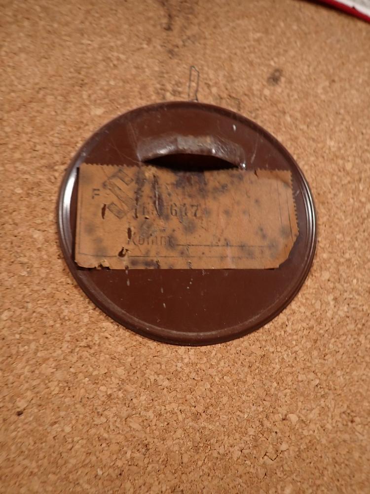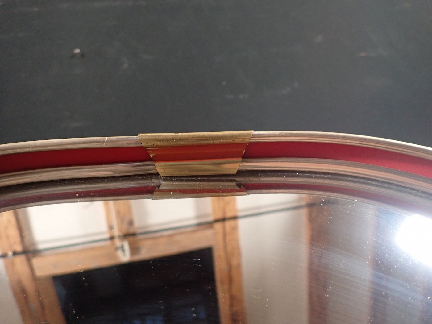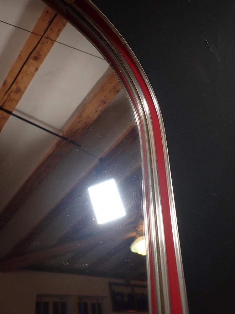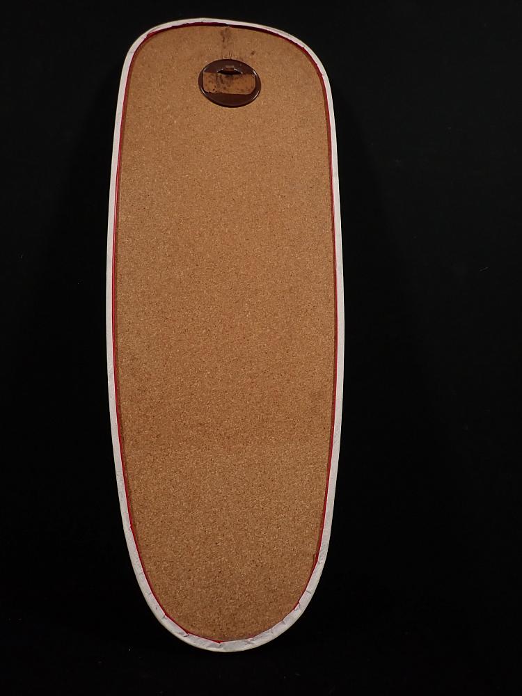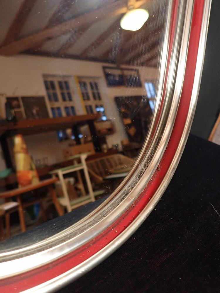 DetailansichtDer Spiegel ist mit einem rot-weißen Kunststoffrand umrandet. Die Rückwand besteht aus Kork und hat eine Kunststoffaufhängung zum an die Wand hängen.