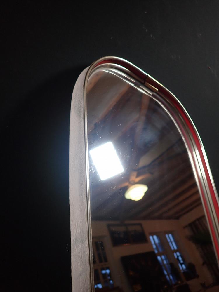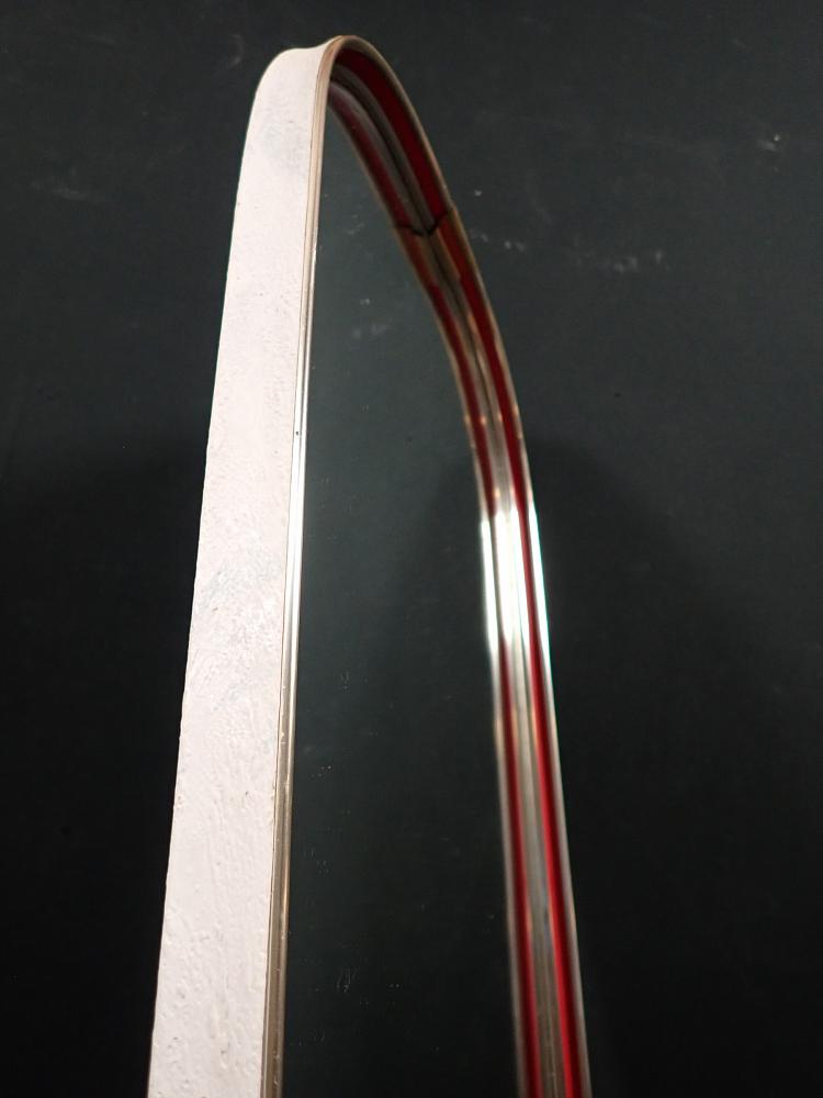 DetailansichtSpiegel auf Kupfer-Emaille Platte. Die Platte besteht aus mehreren kleinen Kupferplatten, die mit einem orange-braunen Regenbogen verlauf Emailliert sind. Die Platten...