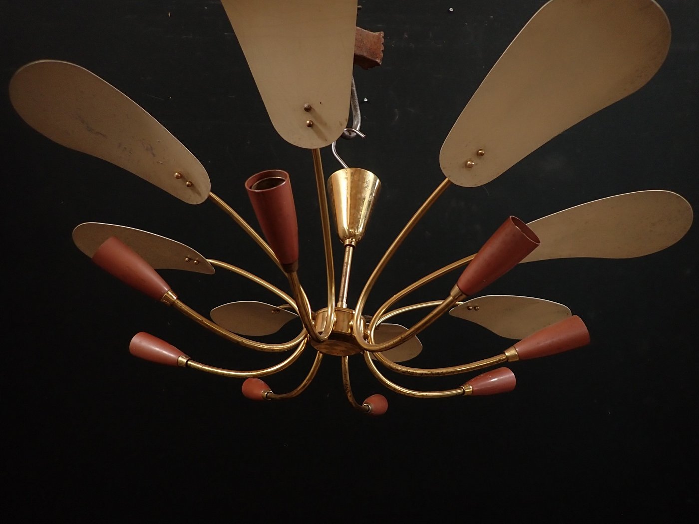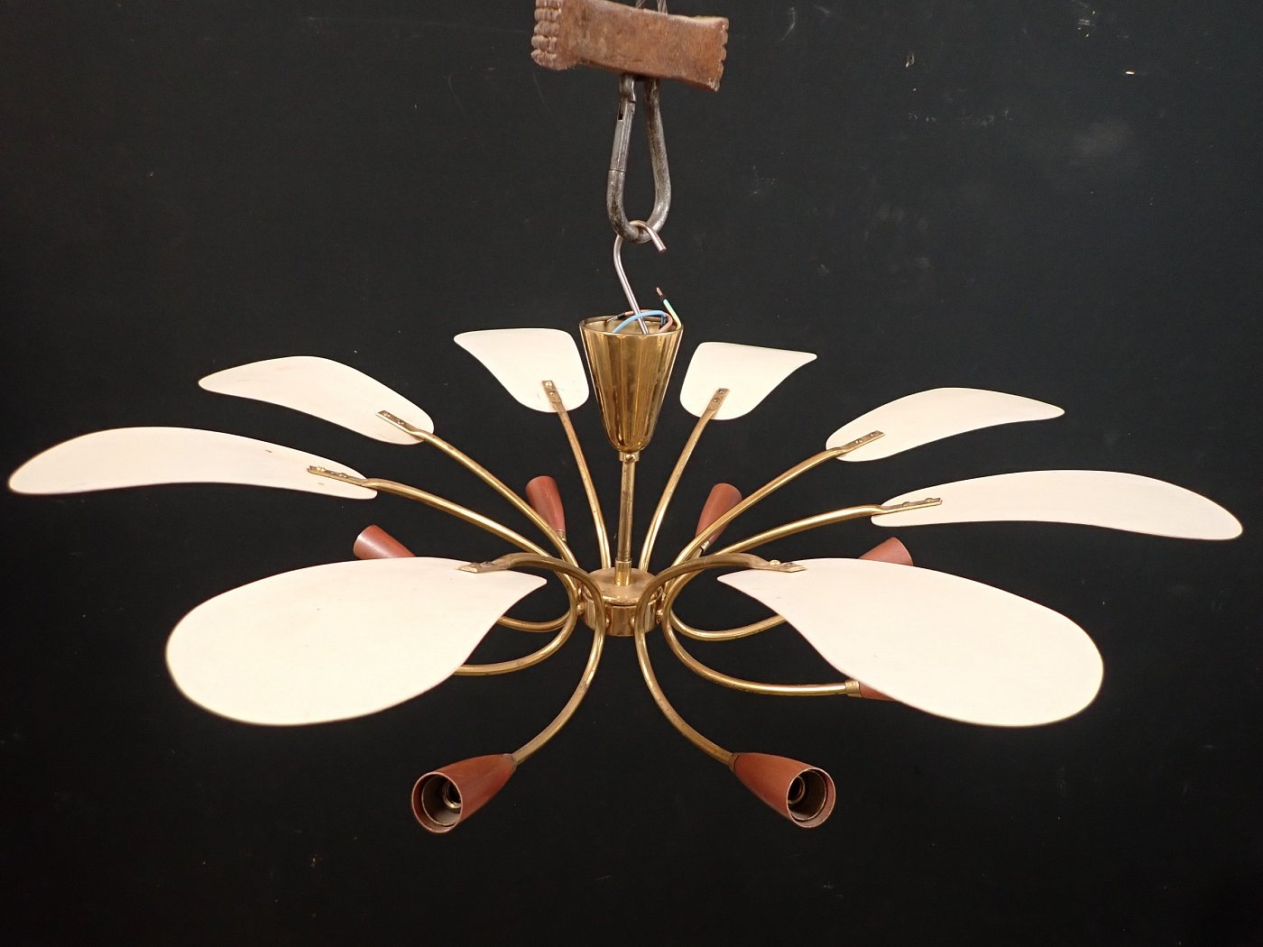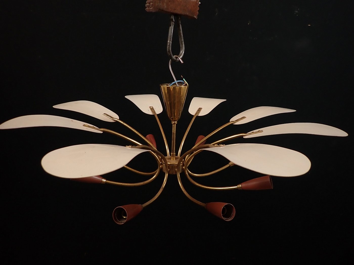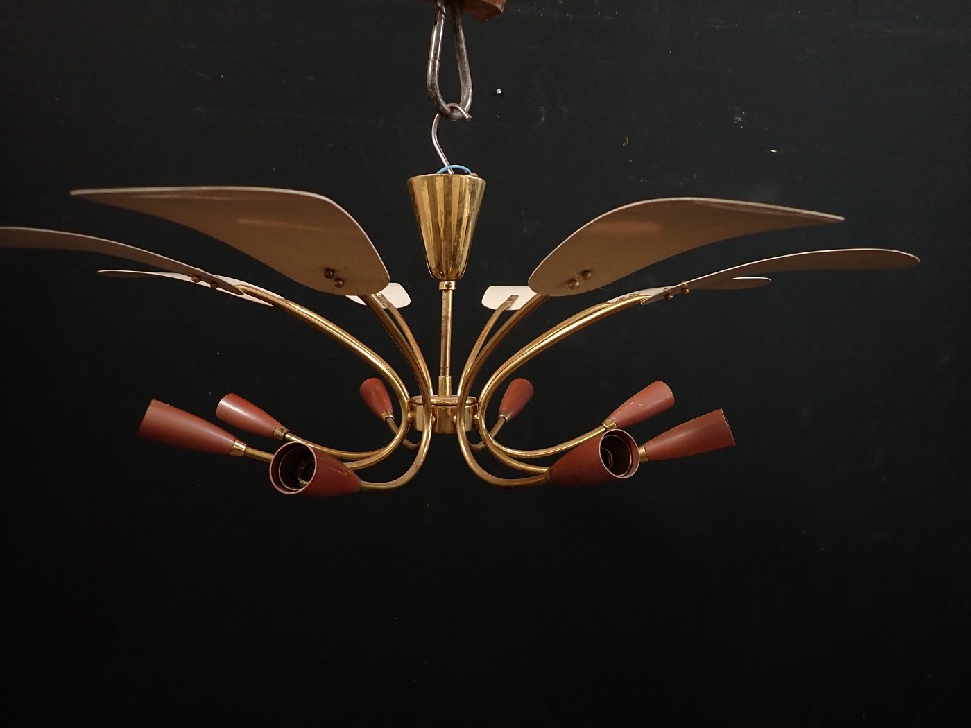 DetailansichtDie Leuchte besteht aus einem Messing, Baldachin und gebogenen Leuchtenarmen, an denen unten Metallfassungen und oben kleine Metallschirme, die die Fassungen bedecken, angebracht sind. Die Leuchte ist neu verkabelt.