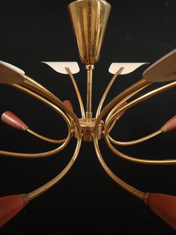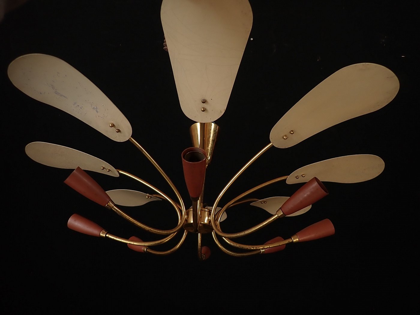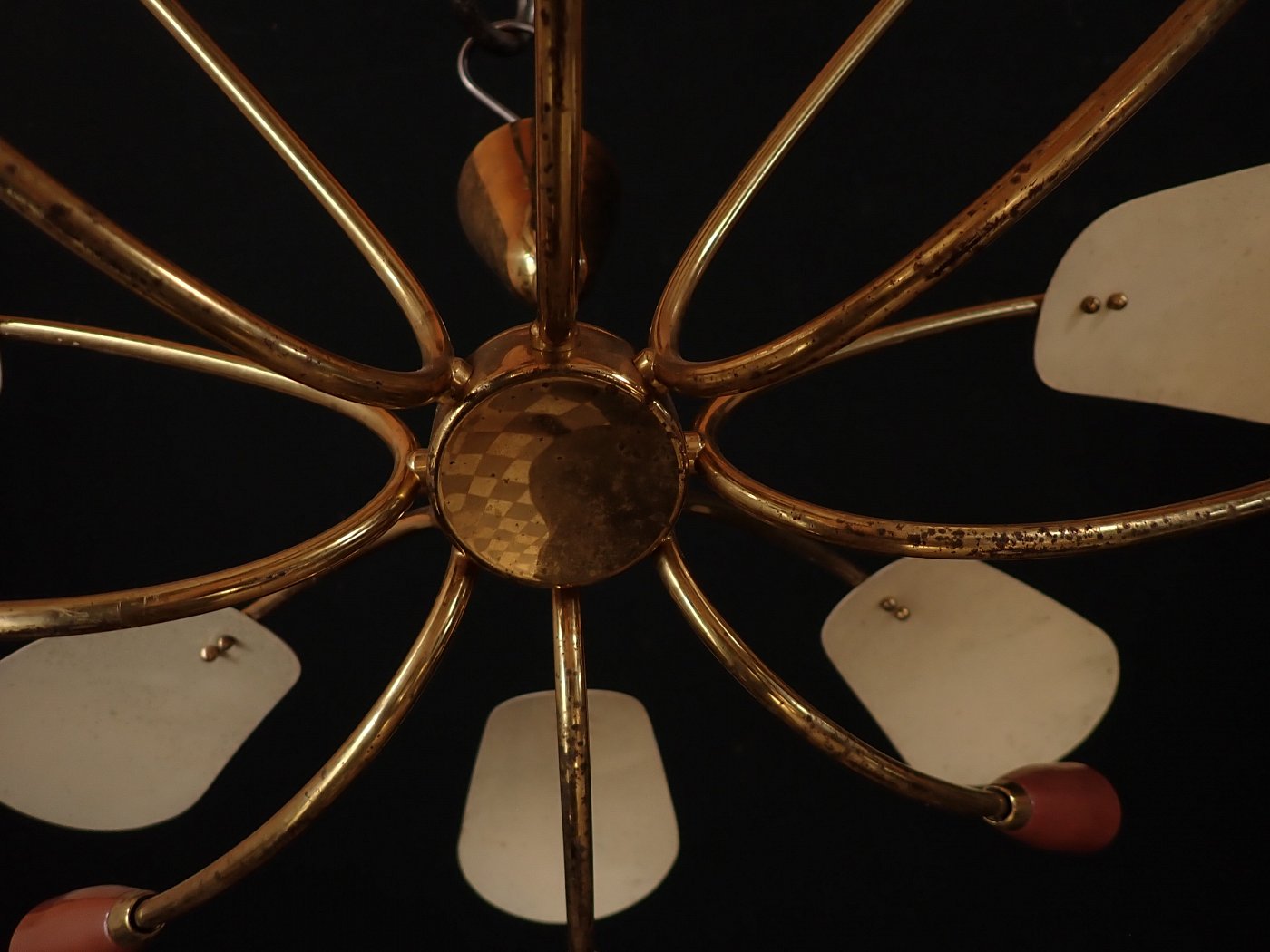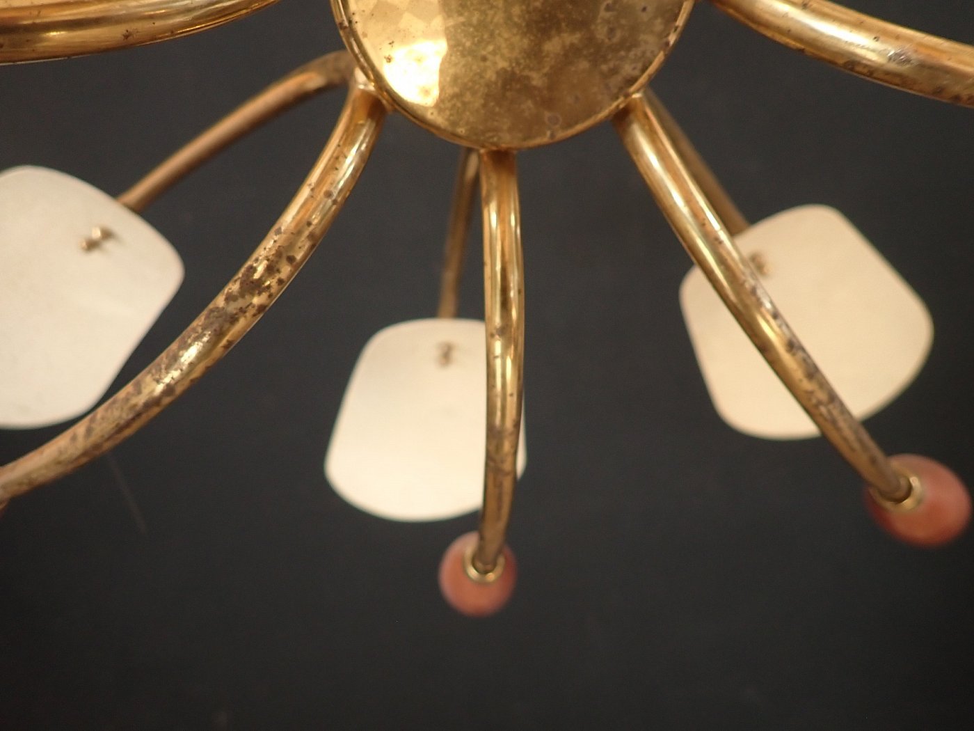 DetailansichtDie Leuchte besteht aus einem Messing, Baldachin und gebogenen Leuchtenarmen, an denen unten Metallfassungen und oben kleine Metallschirme, die die Fassungen bedecken, angebracht sind. Die Leuchte ist neu verkabelt.