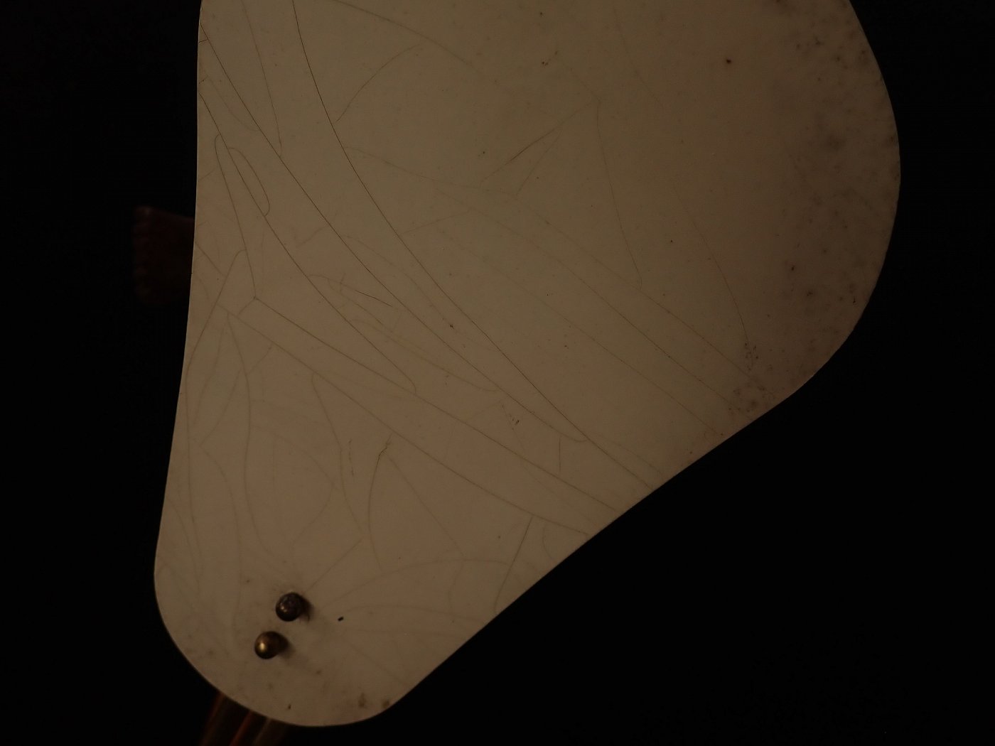 Detailansicht50er-Jahre Tischleuchte. Der Fuß der Leuchte besteht aus einer Kunststoffplatte, die von drei Messingfüßen getragen wird. An der Platte ist der Leuchten Arm...
