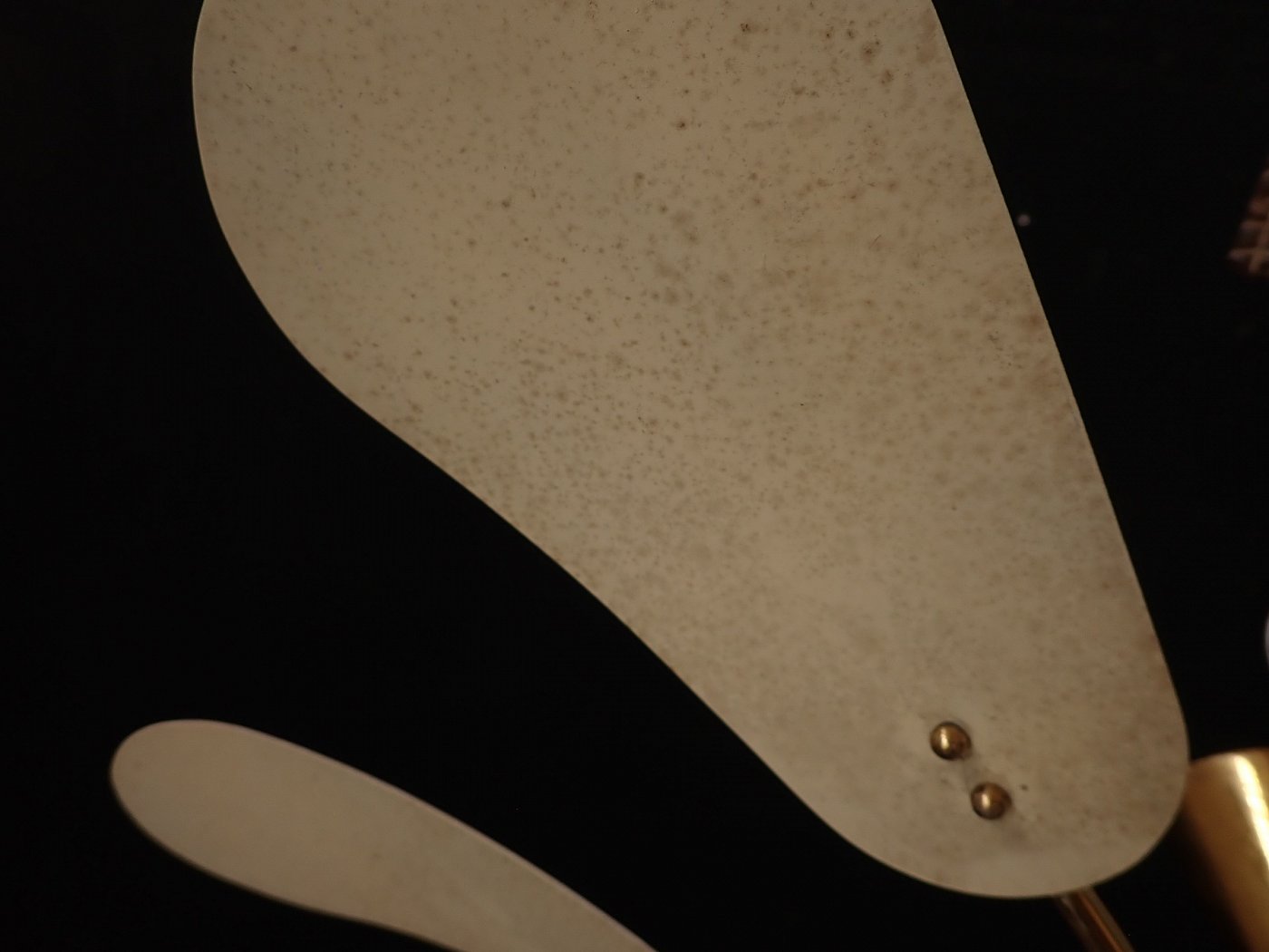 DetailansichtDie Leuchte besteht aus einem Messing, Baldachin und gebogenen Leuchtenarmen, an denen unten Metallfassungen und oben kleine Metallschirme, die die Fassungen bedecken,...