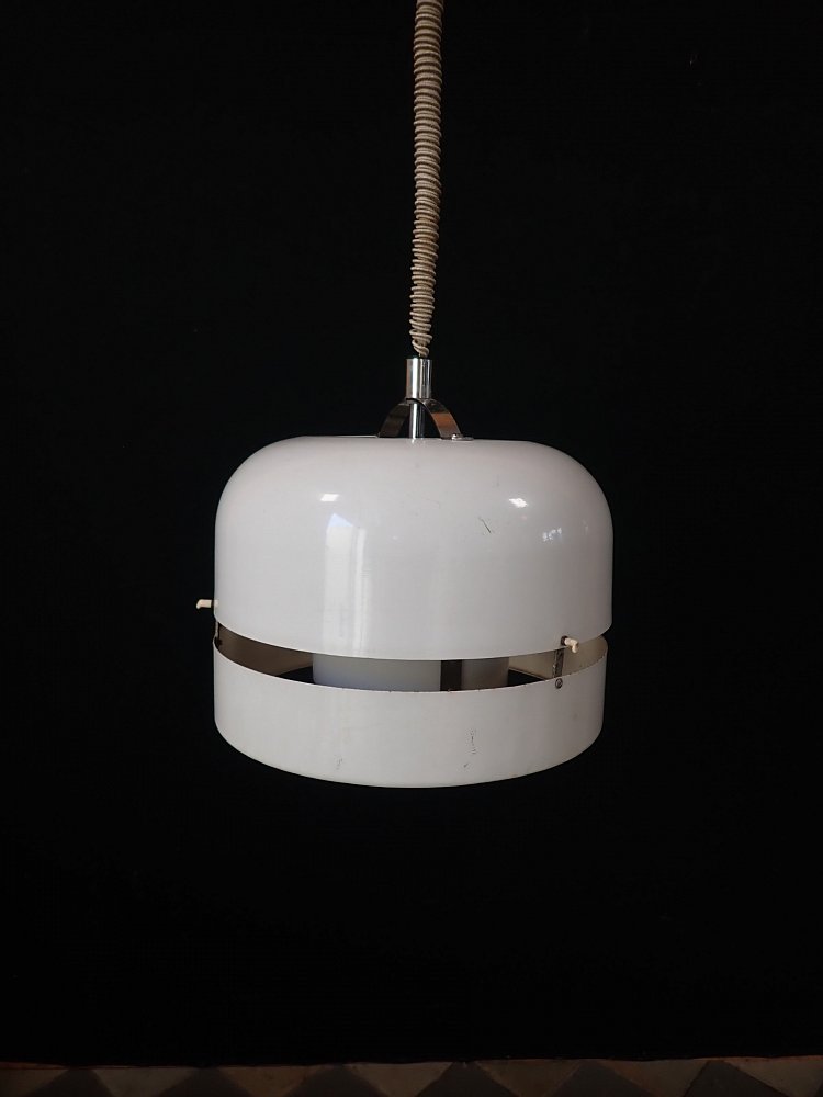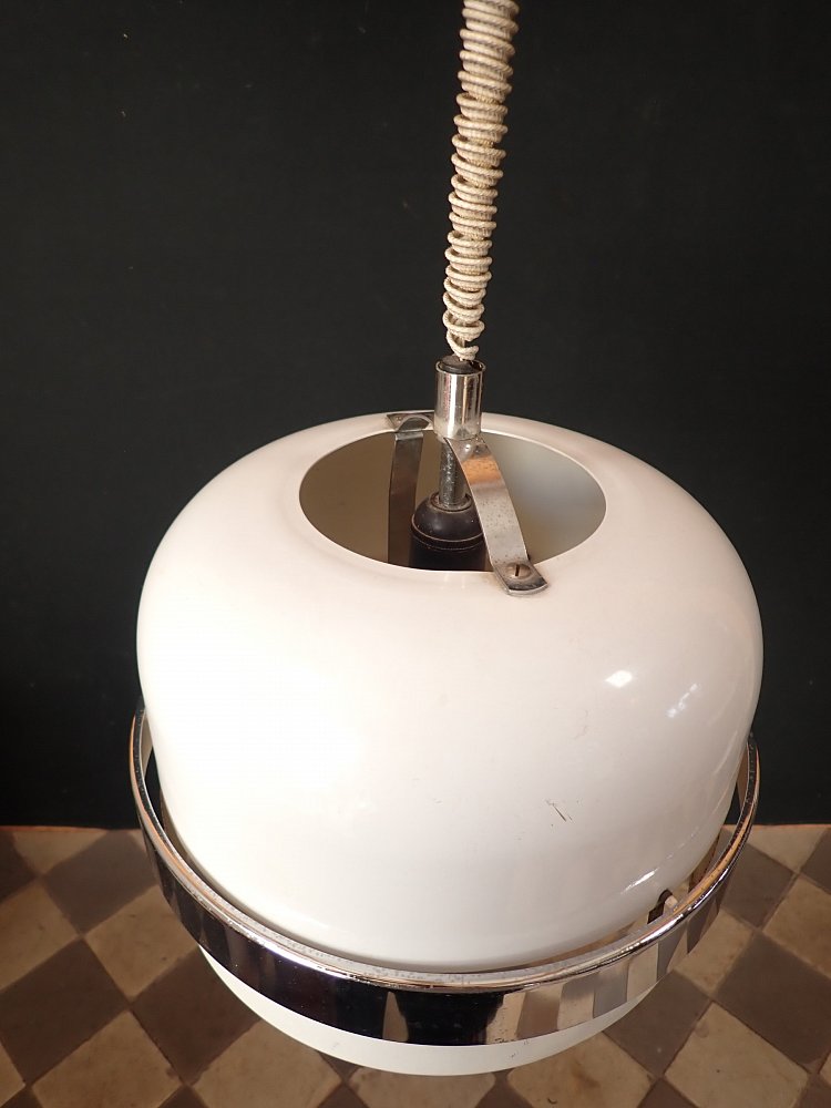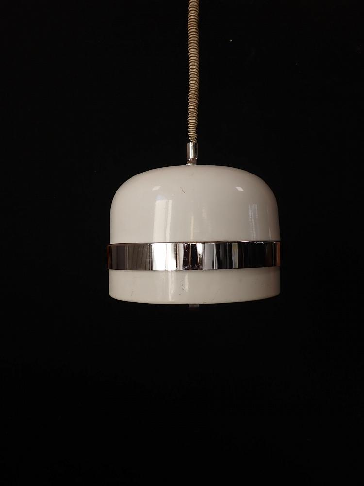 Die Hängeleuchte ist mit einem großen Blechschirm sowie weiteren unterschiedlich großen und breiten Ringen ausgestattet. Einen schönen Kontrast zu den weiß lackierten Elementen bildet der verchromte Ring, der einfach außen aufgelegt wird.