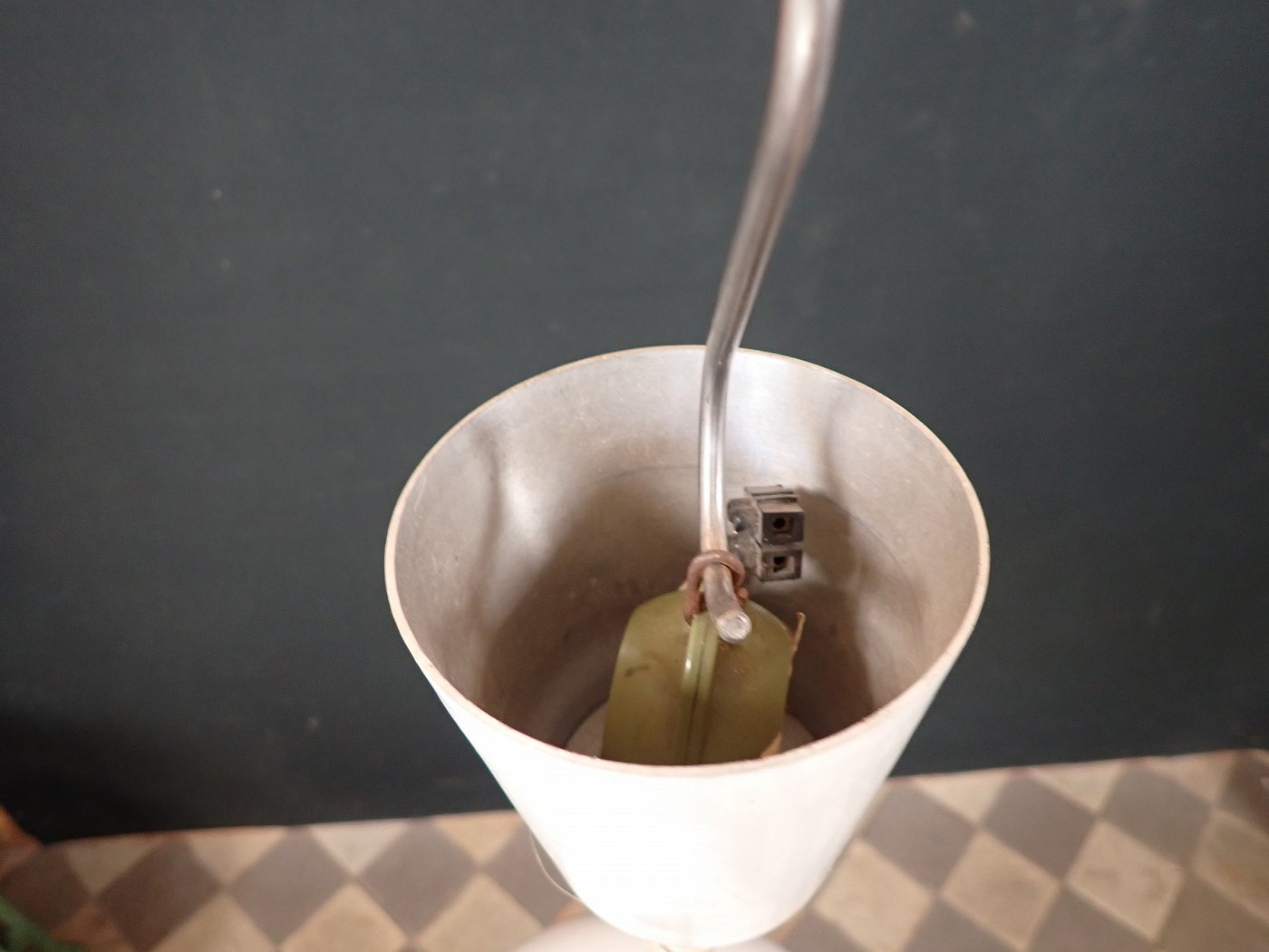 DetailansichtSchreibtischleuchte oder Tischleuchte aus den 50-er Jahren. Die waren schon sehr schick, die kleinen Tischlampen mit dem hutförmigen Metallschirm. Und praktisch...