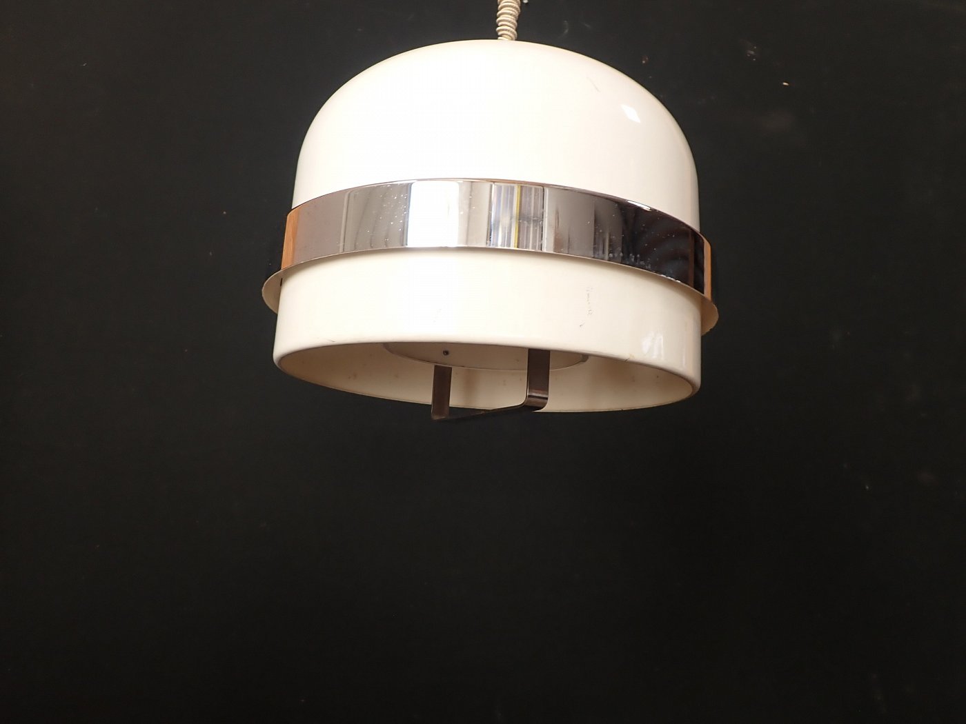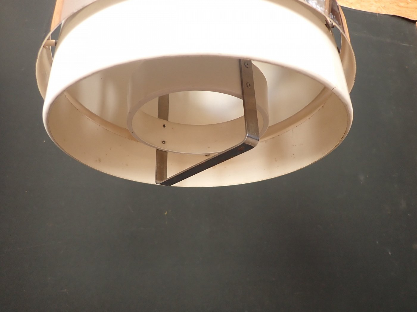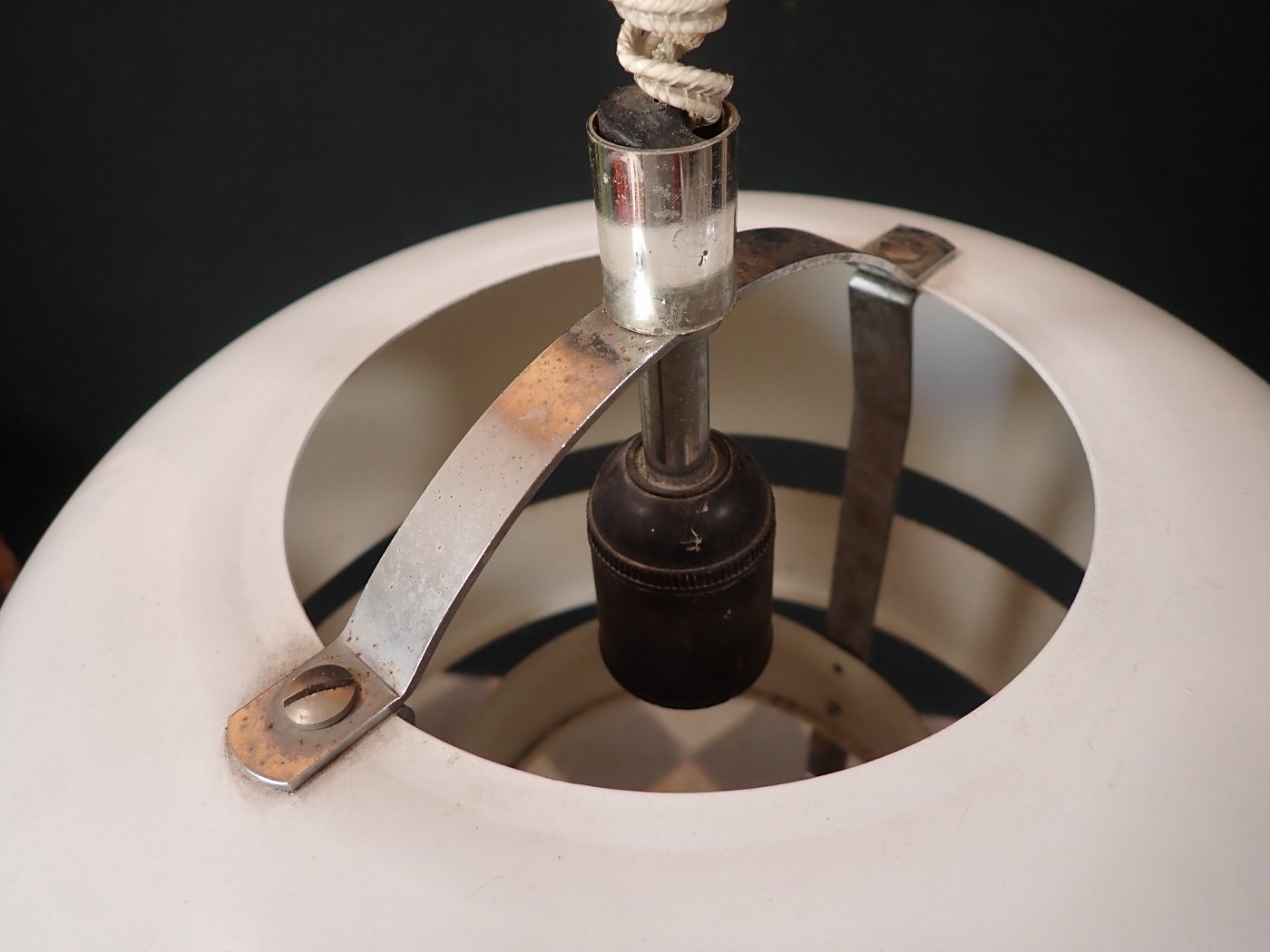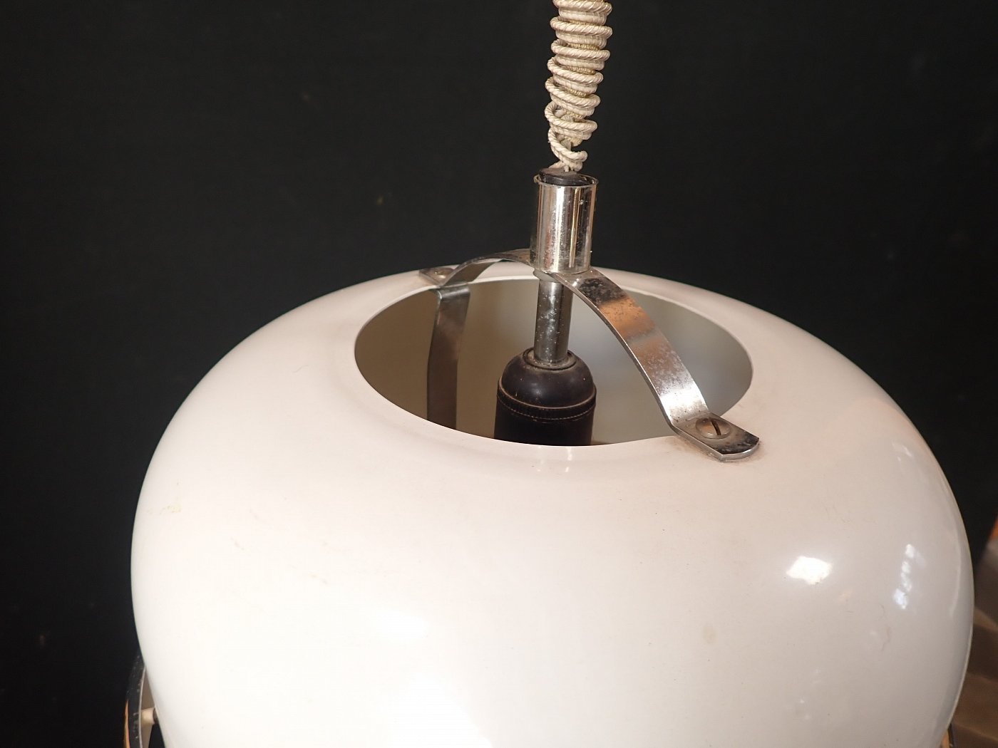 Detailansicht70er-Jahre Hängeleuchte. Die Leuchte ist durch Ihre außergewöhnliche Form ein Hingucker. Zuerst fragt man sich, ob die Leuchte nicht eine Tischleuchte sei, aber...