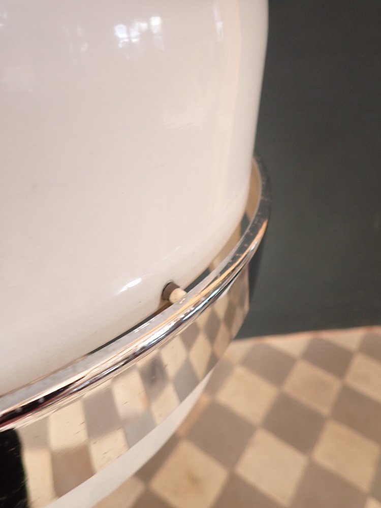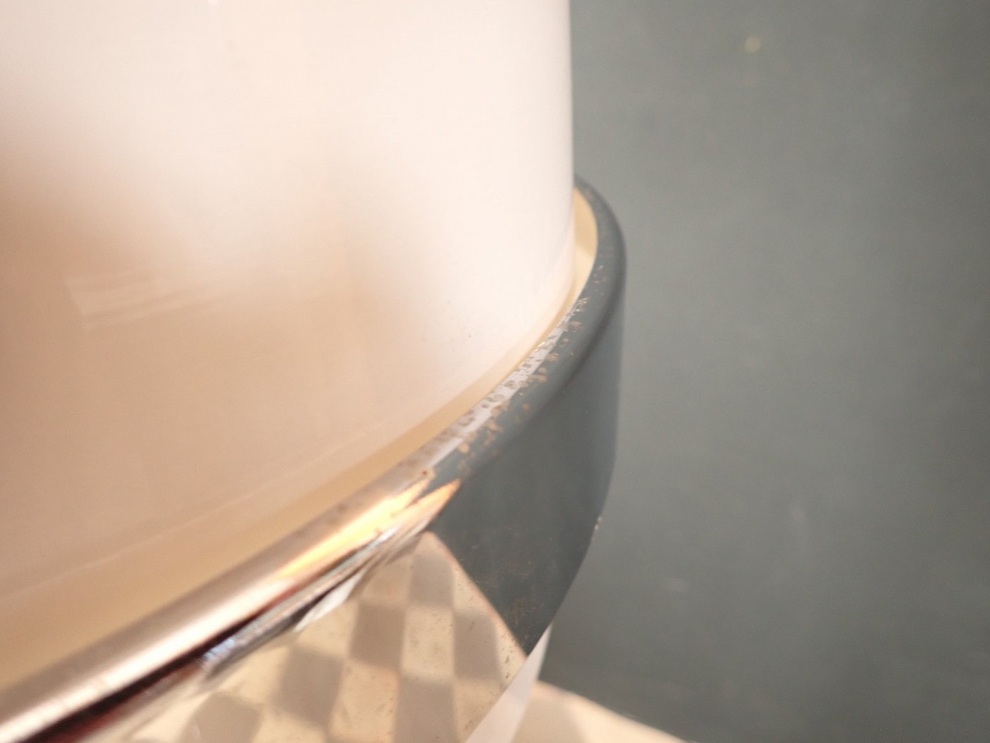 DetailansichtDie Tischleuchte besteht aus drei verchromten Metallfüßen, die mit zwei verchromten Platten verbunden sind. Der große Leuchtenschirm besteht aus Kunststoff und...