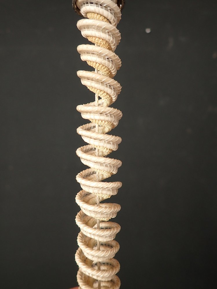 DetailansichtStehleuchte aus den 50er-Jahren. Die Leuchte besteht aus einem Metallgestell mit drei Füßen. Um das Gestell wurde als Schirmoptik Kunststoffbänder umgewickelt....