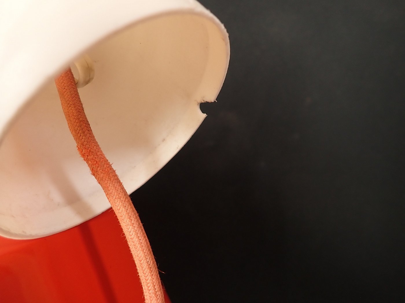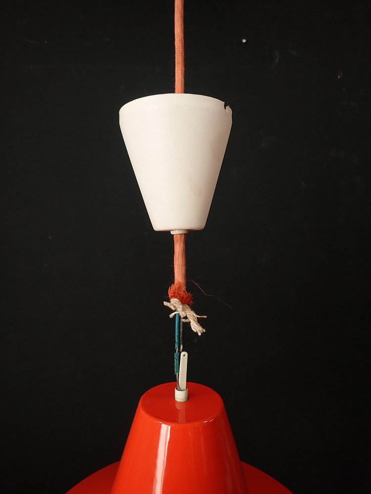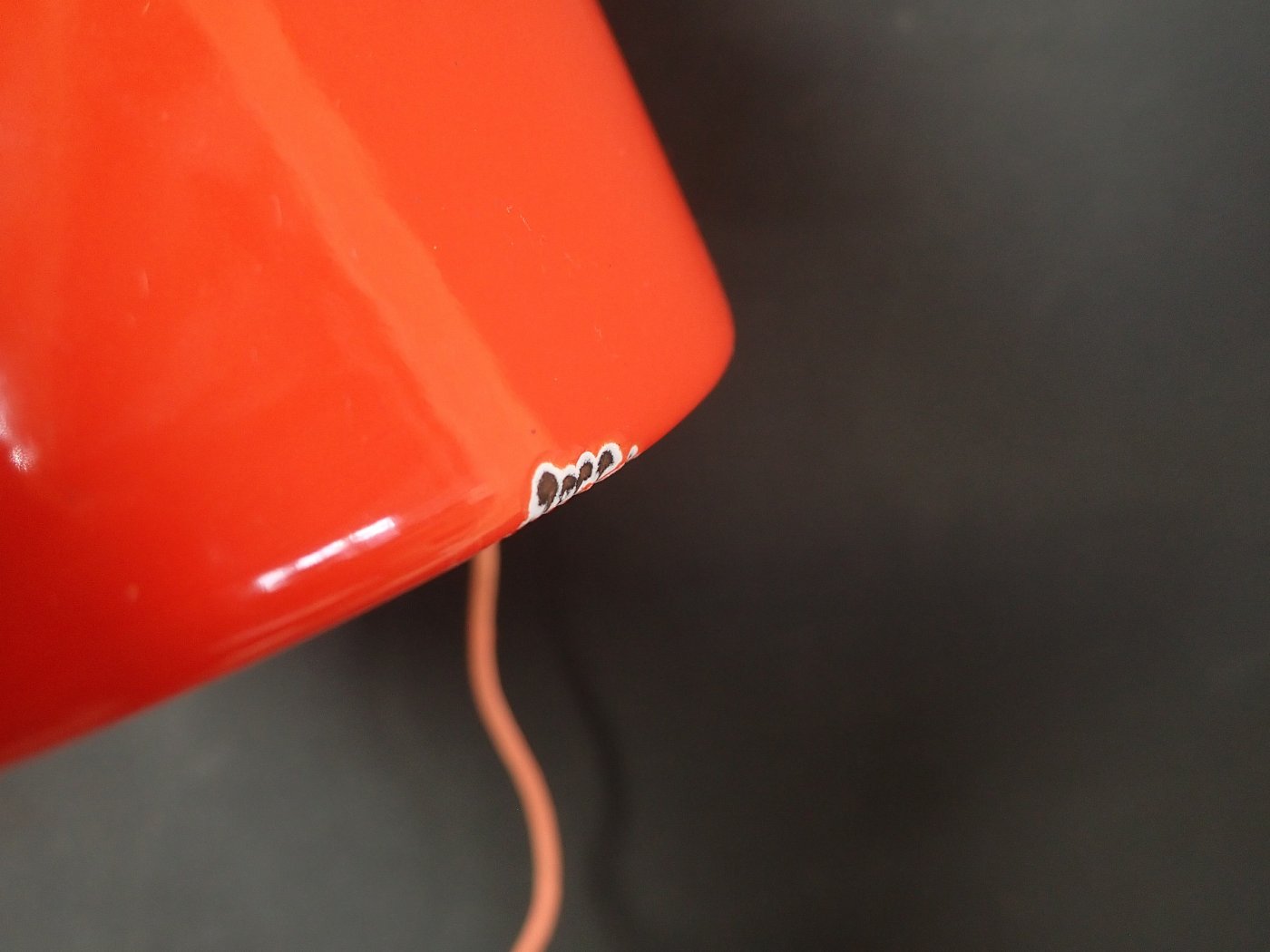 DetailansichtDesignhängeleuchte in kräftigem Orange. Leider hat die 70er Jahre Leuchte keine Markung, doch Form und Größe sprechen eindeutig die Handschrift des Designers...