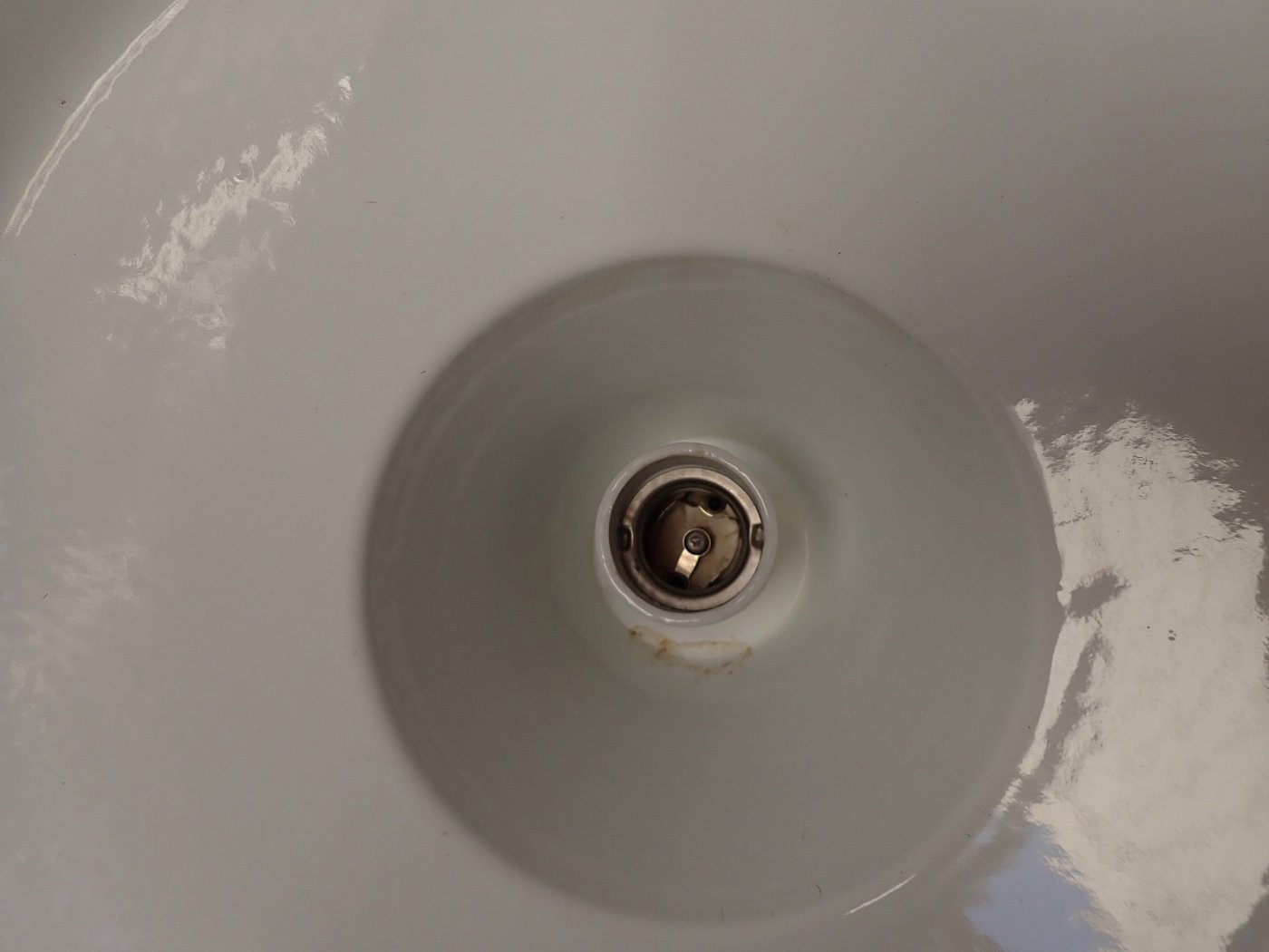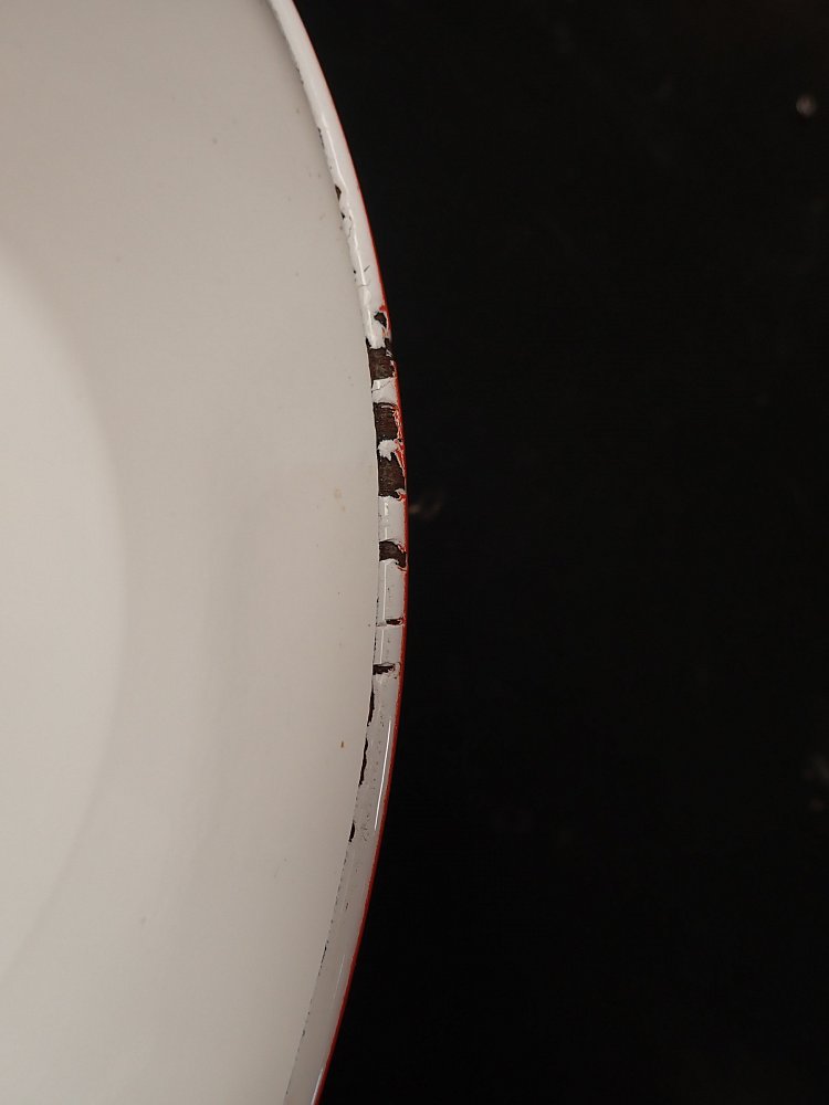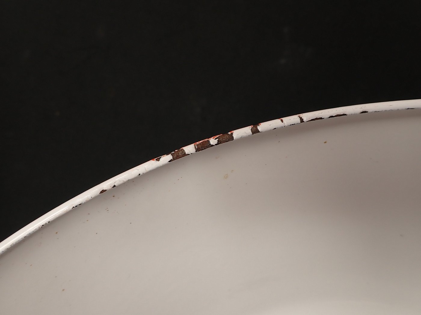 Insgesamt befindet sich die emaillierte Leuchte in einem guten Zustand, auch wenn sie am Rand einige kleine Abplatzer hat.