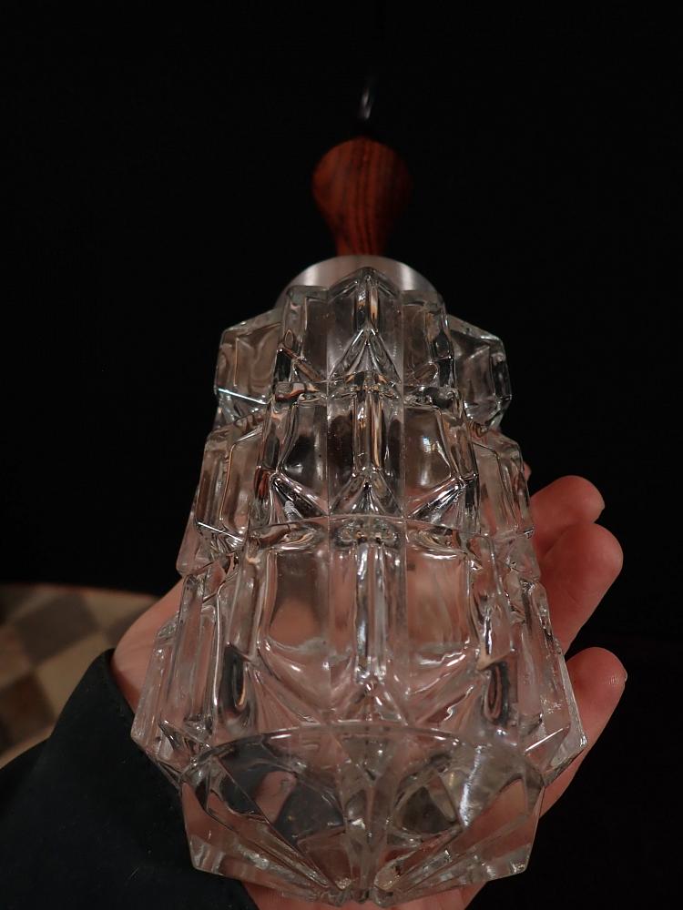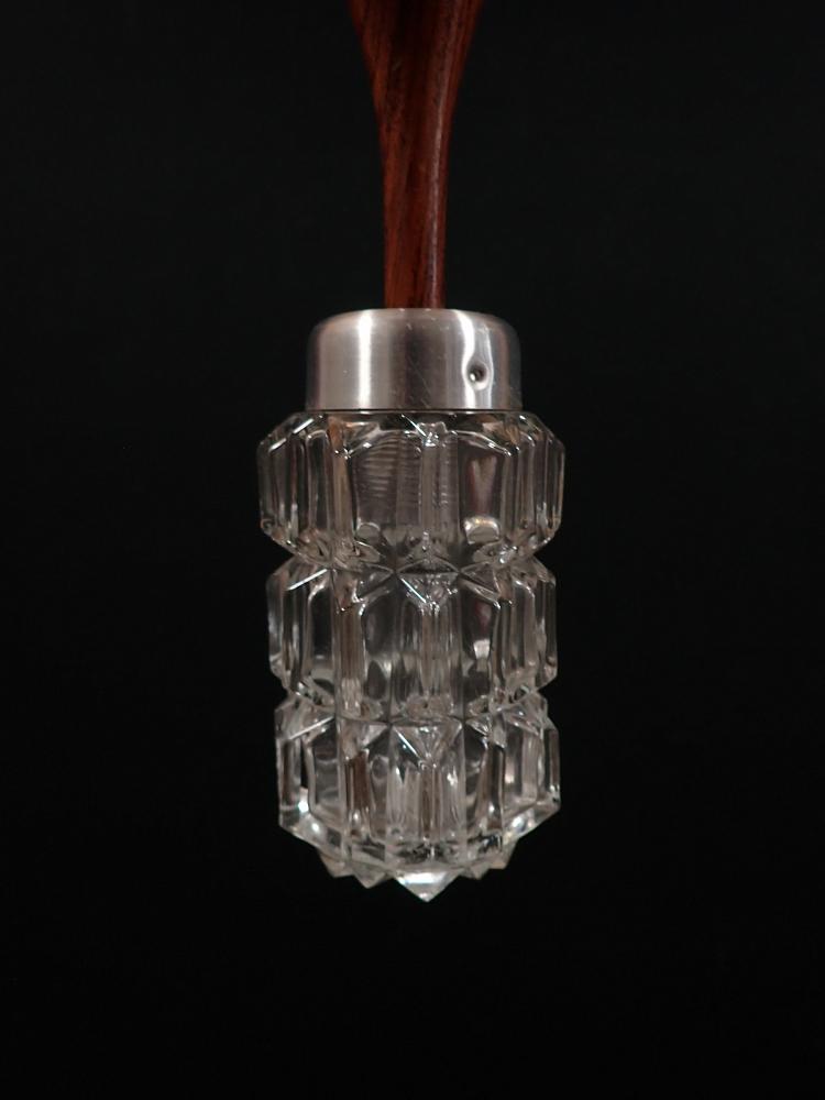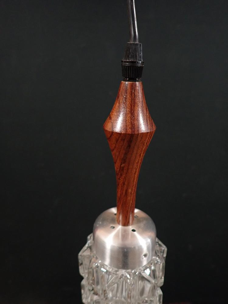 Die Leuchte besteht aus einem Kristall Leuchtenglas und einem gedrechseltem Holz. Aufgehängt wird die Leuchte am Kabel an der Decke.