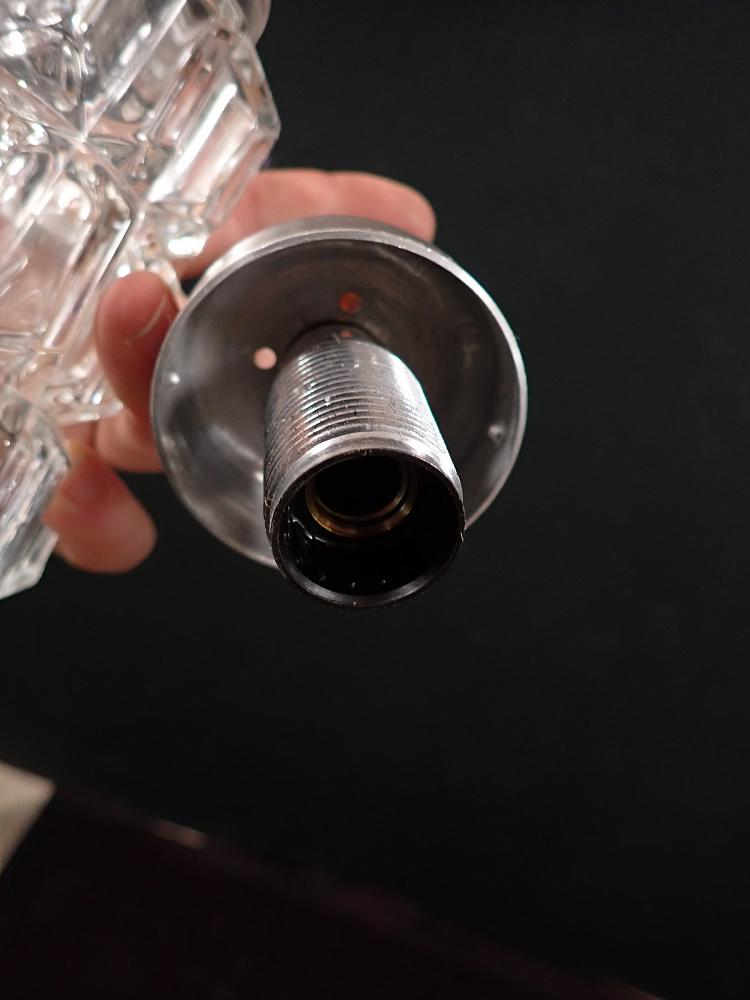 Die Tischleuchte besteht aus Glas und hat eine Kunststofffassung. Auf dem Gewinde der Fassung ist ein Ring, mit dem man ein Leuchtenschirm festdrehen könnte. Die...