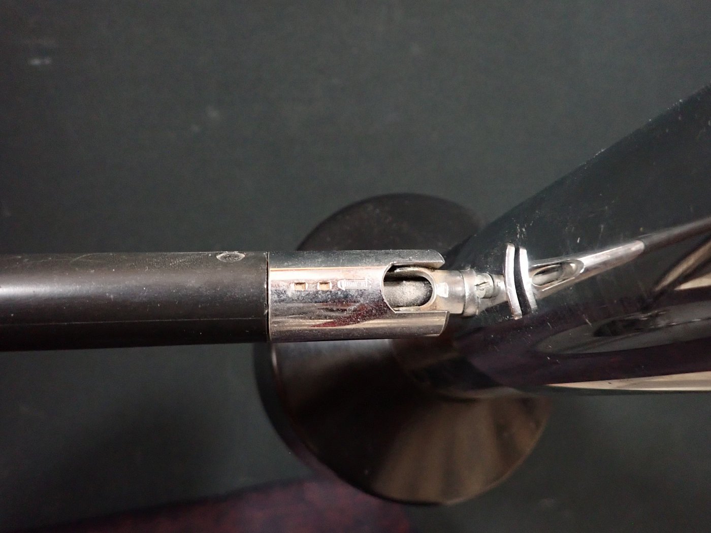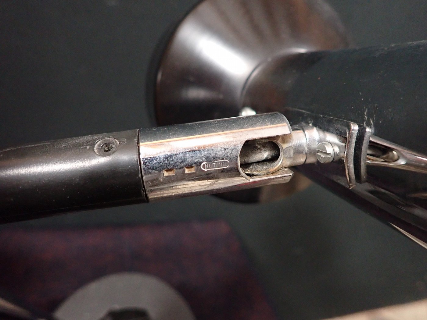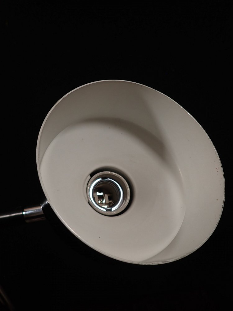 Der Blechschirm der Leuchte ist außen schwarz und innen weiß lackiert und lässt sich über einen Bajonettverschluss in den verchromten Zylinder eindrehen.