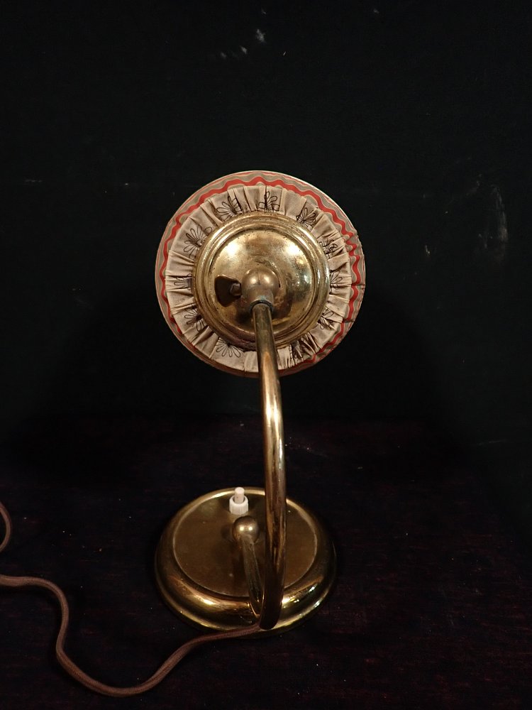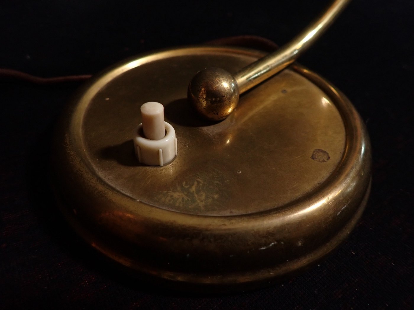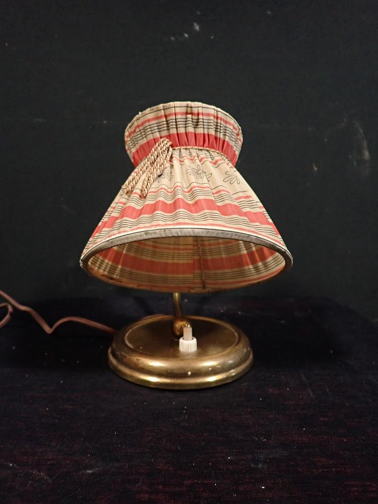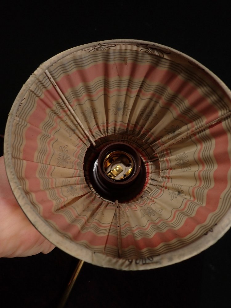 Die Messingarmatur des Lämpchens ist mit einem textilbespanntem Schirm ausgestattet. Über eine Flügelschraube am Arm ist der Schirm in der gewünschten Neigung einstellbar.