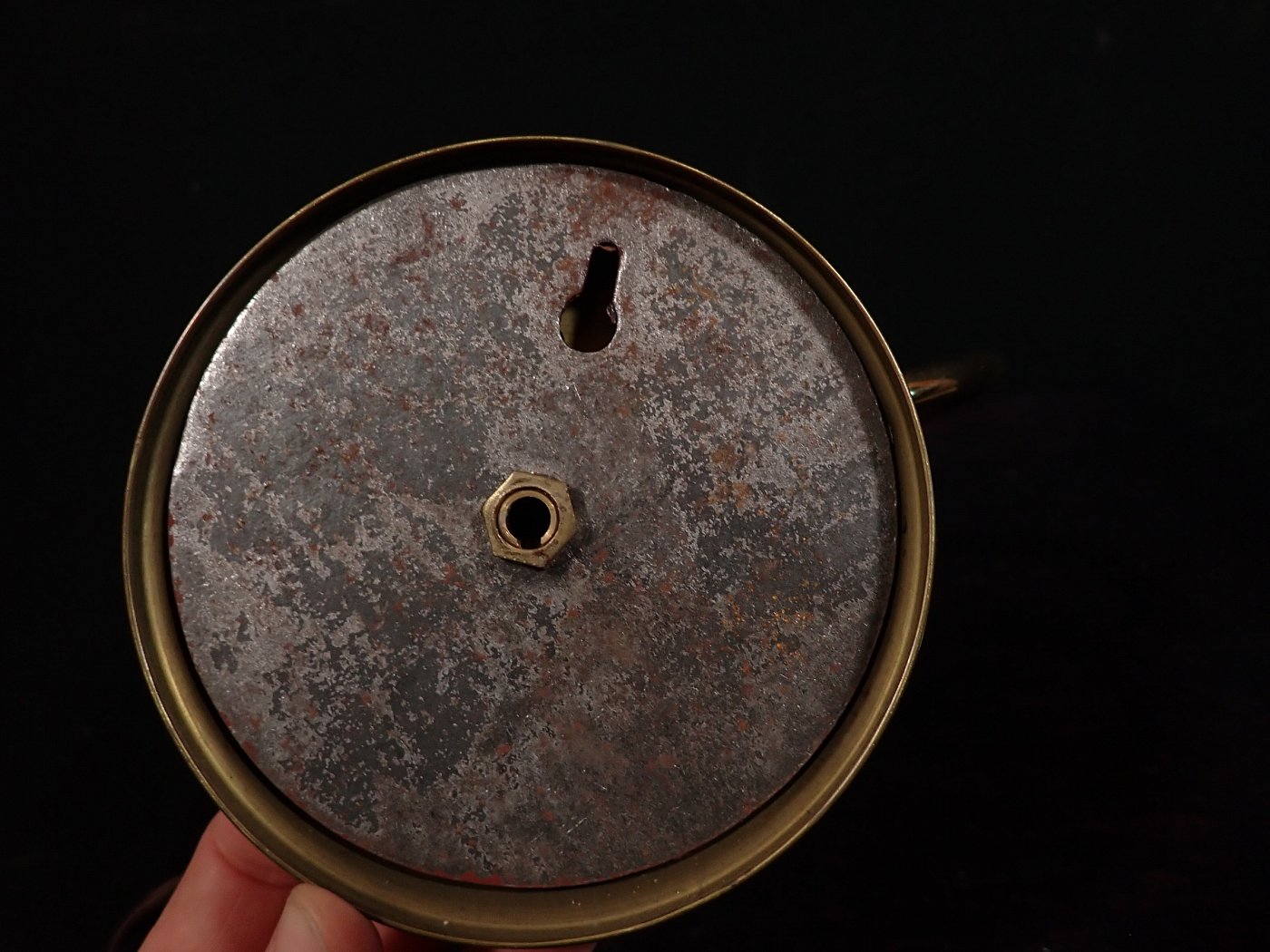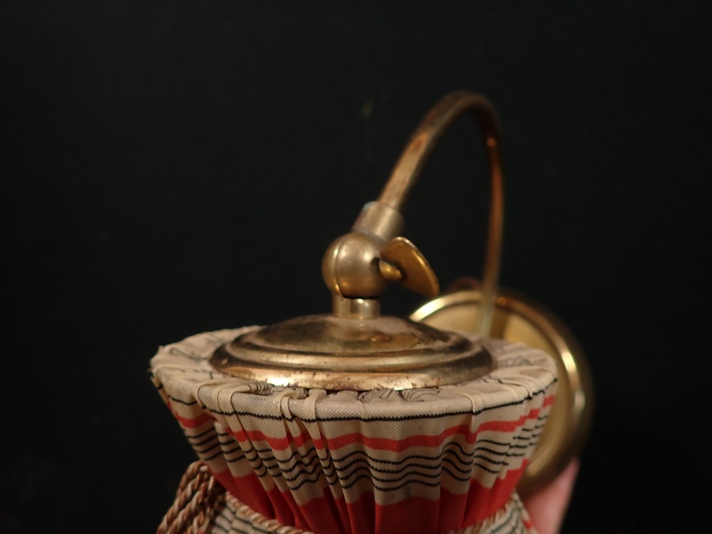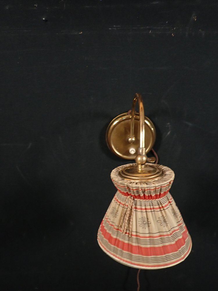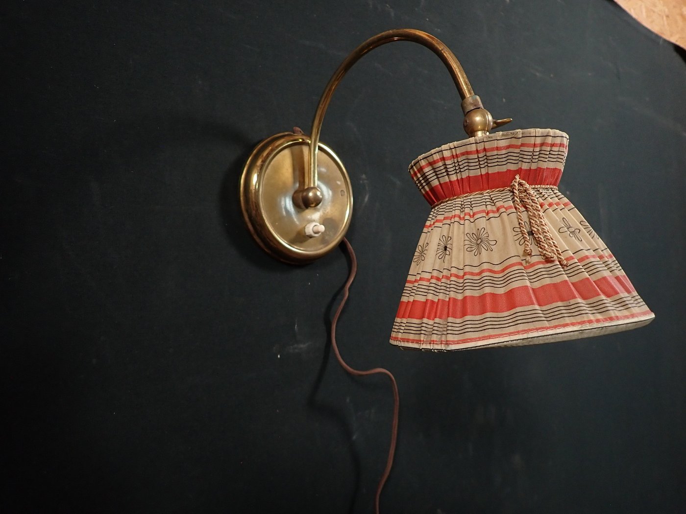 Die Messingarmatur des Lämpchens ist mit einem textilbespanntem Schirm ausgestattet. Über eine Flügelschraube am Arm ist der Schirm in der gewünschten Neigung einstellbar.