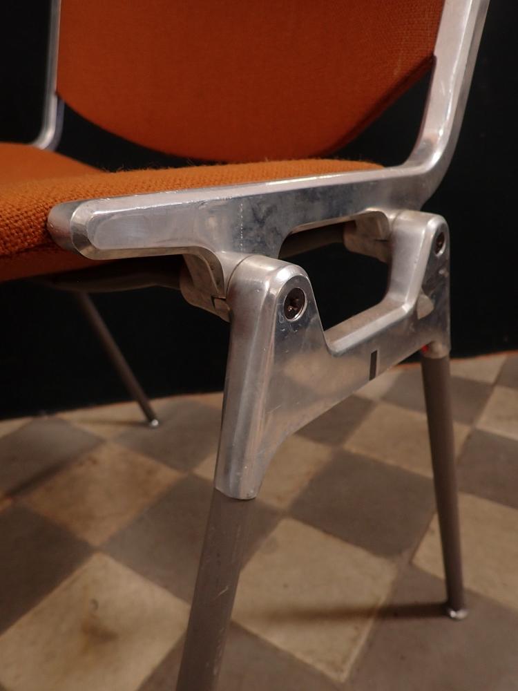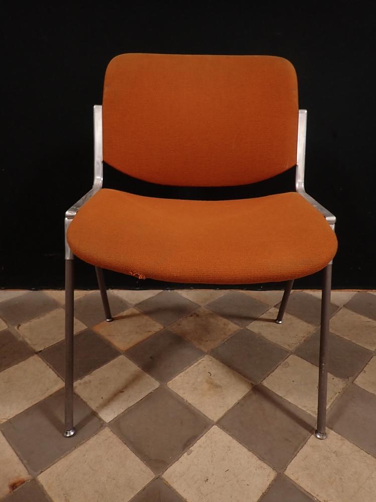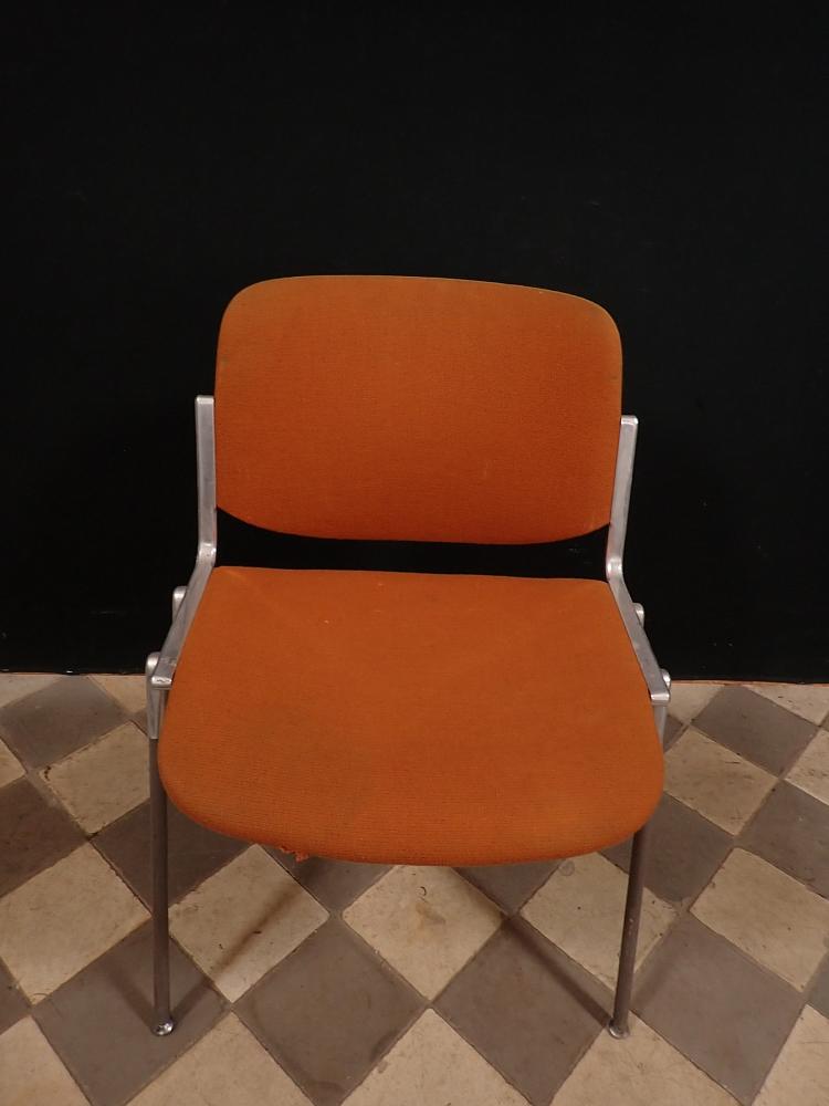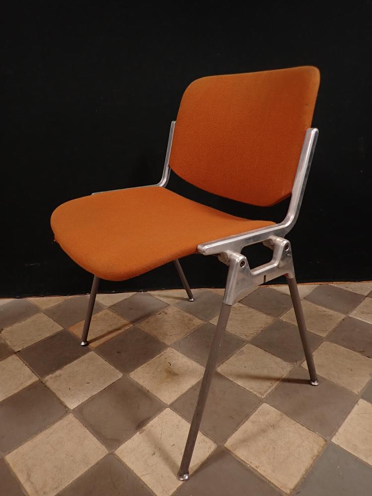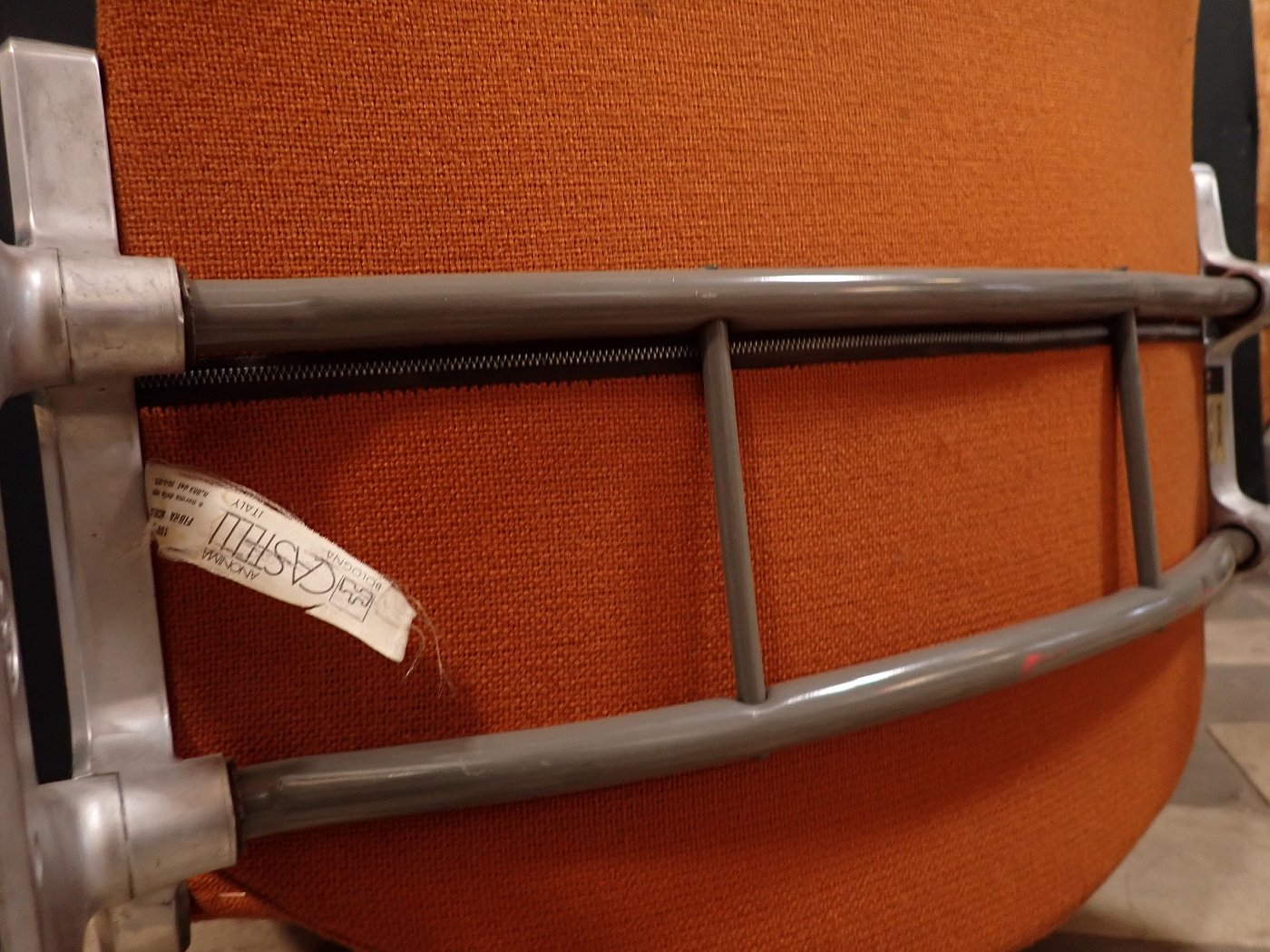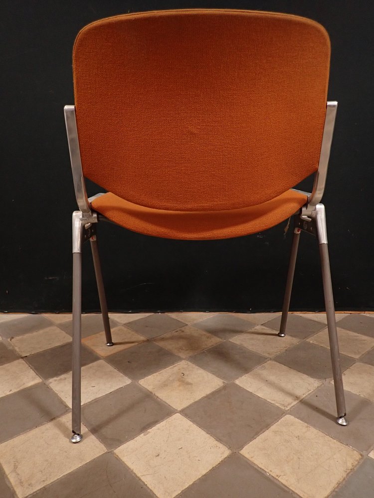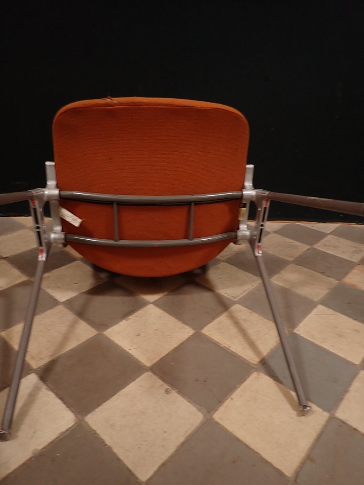 Das Stuhlgestell besteht aus Aluminium und die Sitzlehne und Sitzfläche aus Holz, welches mit einem gepolsterten orangenen Stoff überzogen ist. Der Stuhl zählt als Klassiker des italienischen Mid-Century-Designs.
