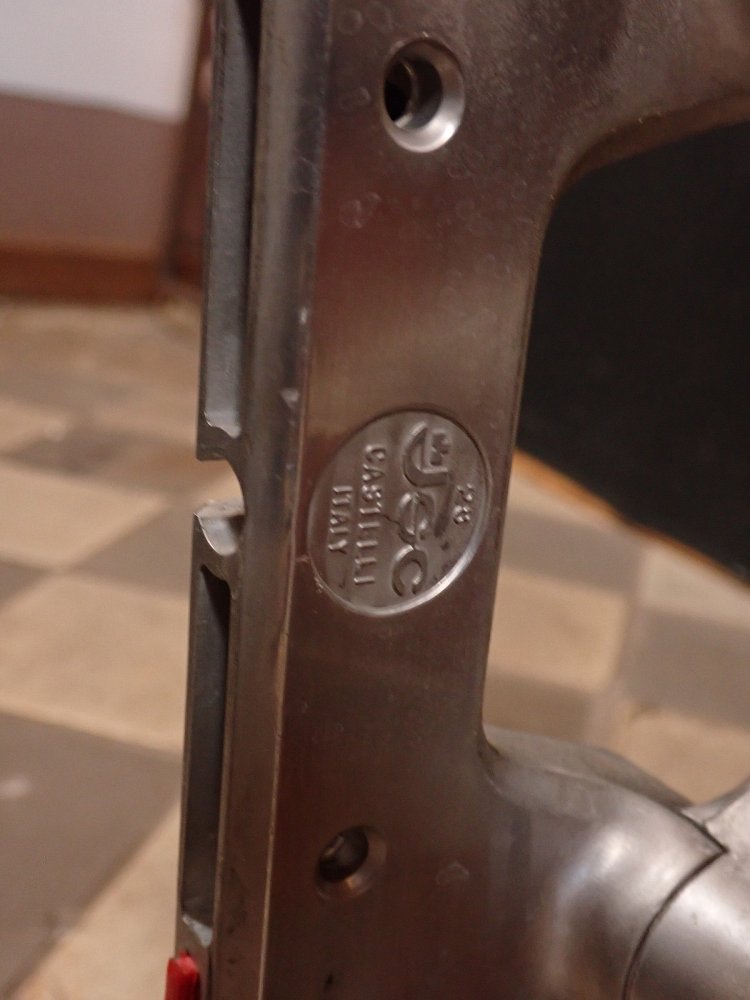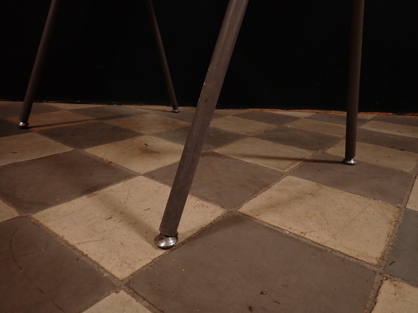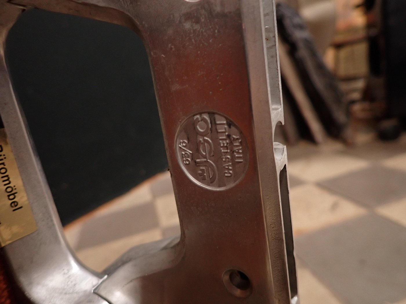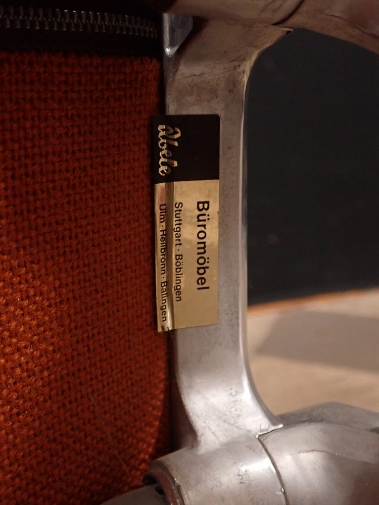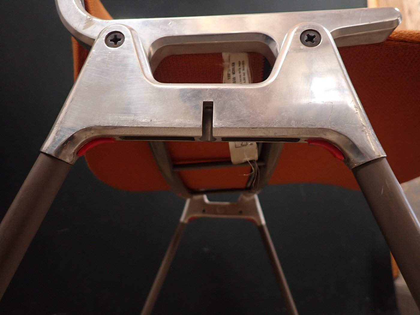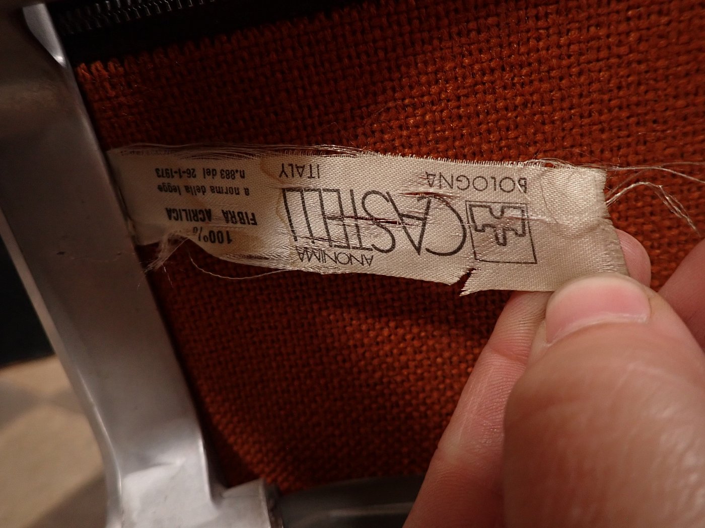 Das Stuhlgestell besteht aus Aluminium und die Sitzlehne und Sitzfläche aus Holz, welches mit einem gepolsterten orangenen Stoff überzogen ist. Der Stuhl zählt als Klassiker des italienischen Mid-Century-Designs.