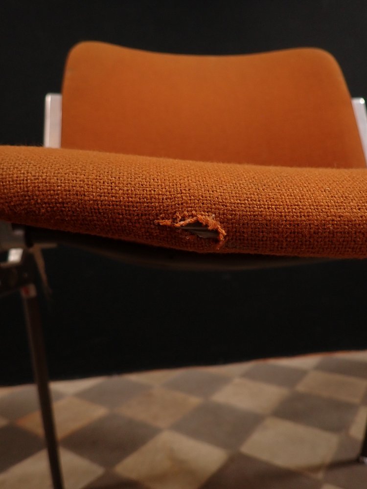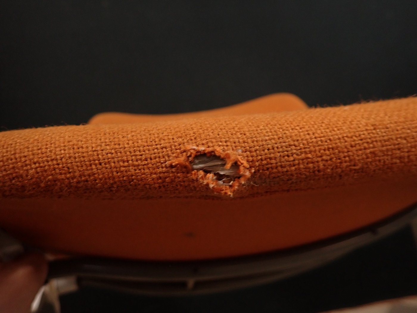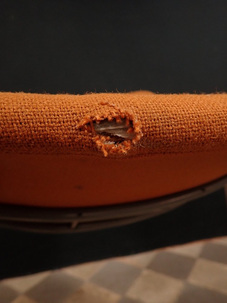 Auf der Sitzfläche ist eine beschädigung am Stoff zu erkennen. Auf der unterseite des Stuhls sind mehrere Markungen.