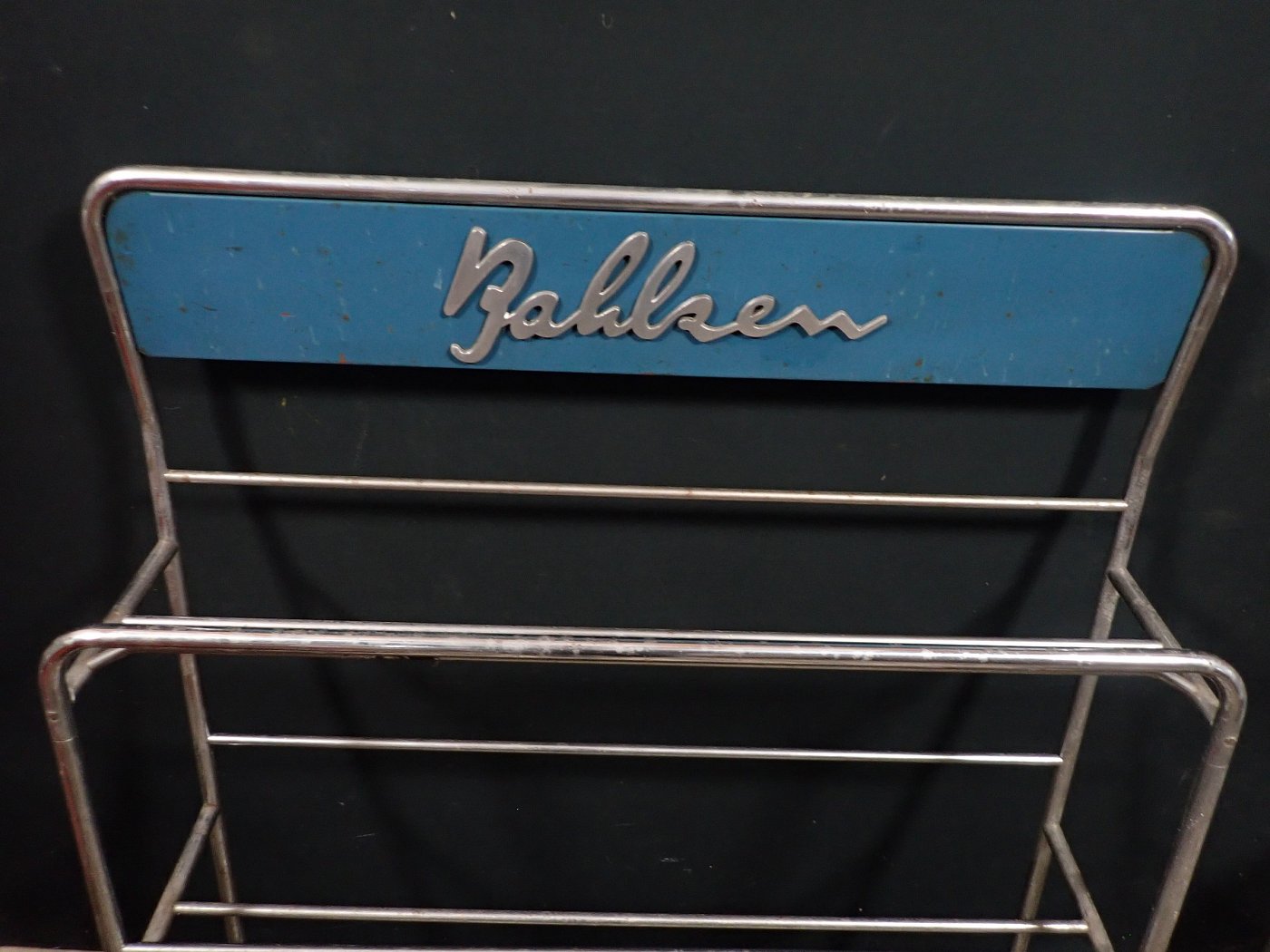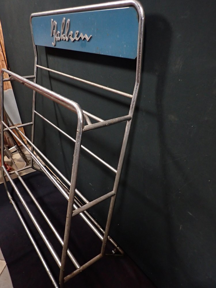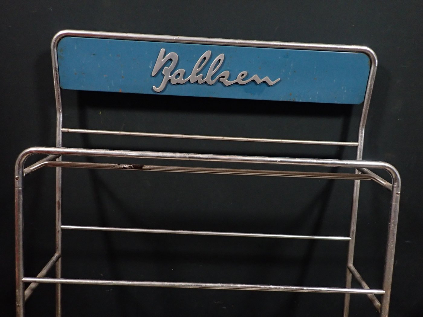 Das Regal besteht aus Metall und hat eine Werbeplatte mit der Aufschrift Bahlsen auch aus Metall. In den 90er-Jahren waren in dem Regal vermutlich die Kekspackungen von Bahlsen zum Verkauf ausgestellt, heute kann man das Regal z.B. als Schuhregal verwenden.
