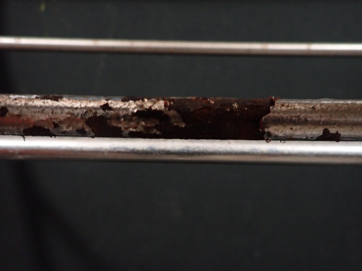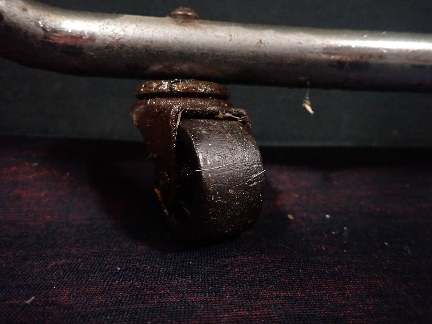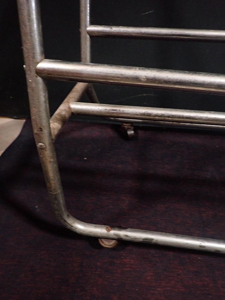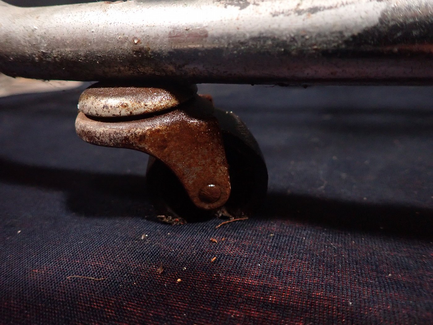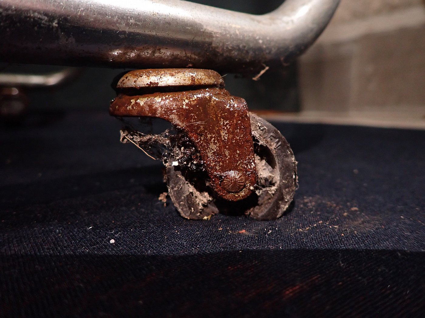 Es sind Roststellen an dem Regal zu erkennen, zwei der vier Rollen sind zur Hälfte ab und auch sehr rostig.