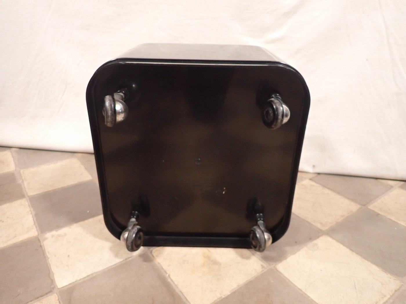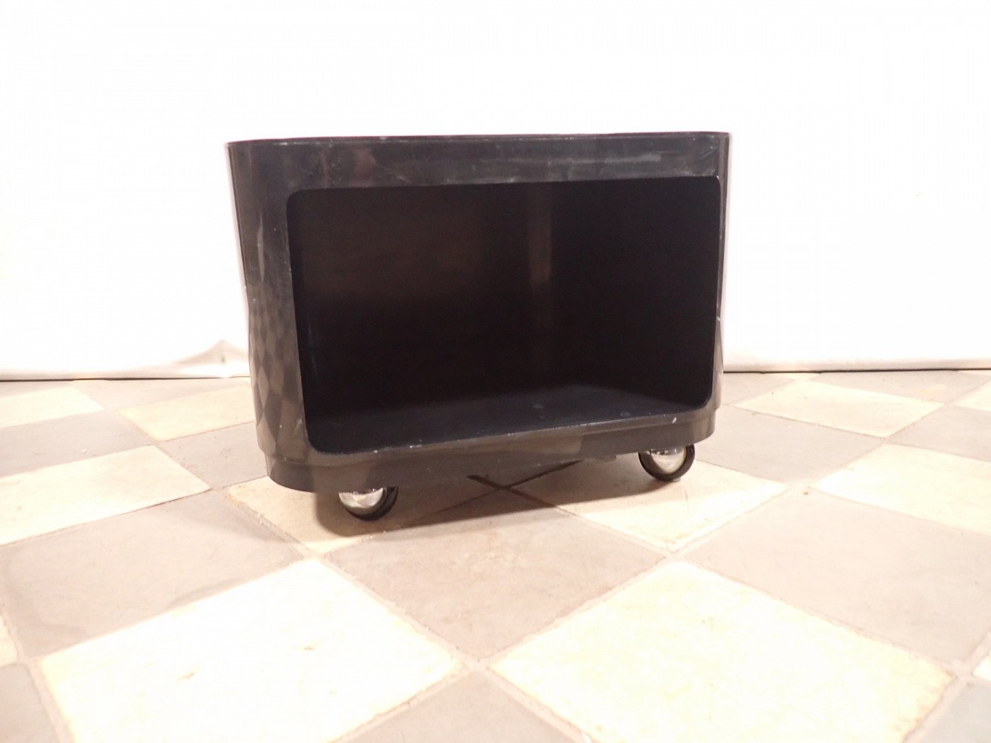 DetailansichtKleiner Beistelltisch auf Rollen. Bei dem schwarzen Kunststoffwürfel handelt es sich um den Beistelltisch Modell 4970 von Kartell, welcher von der Designerin Anna...