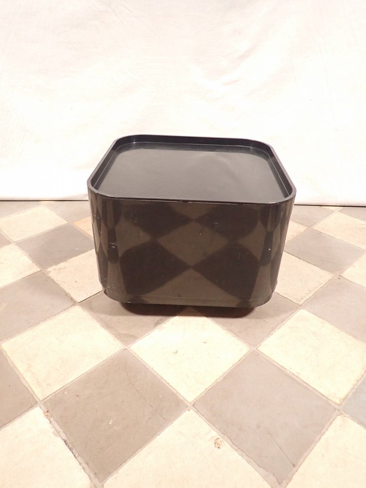 Bei dem schwarzen Kunststoffwürfel handelt es sich um den Beistelltisch Modell 4970 von Kartell, welcher von der Designerin Anna Castelli entworfen wurde.