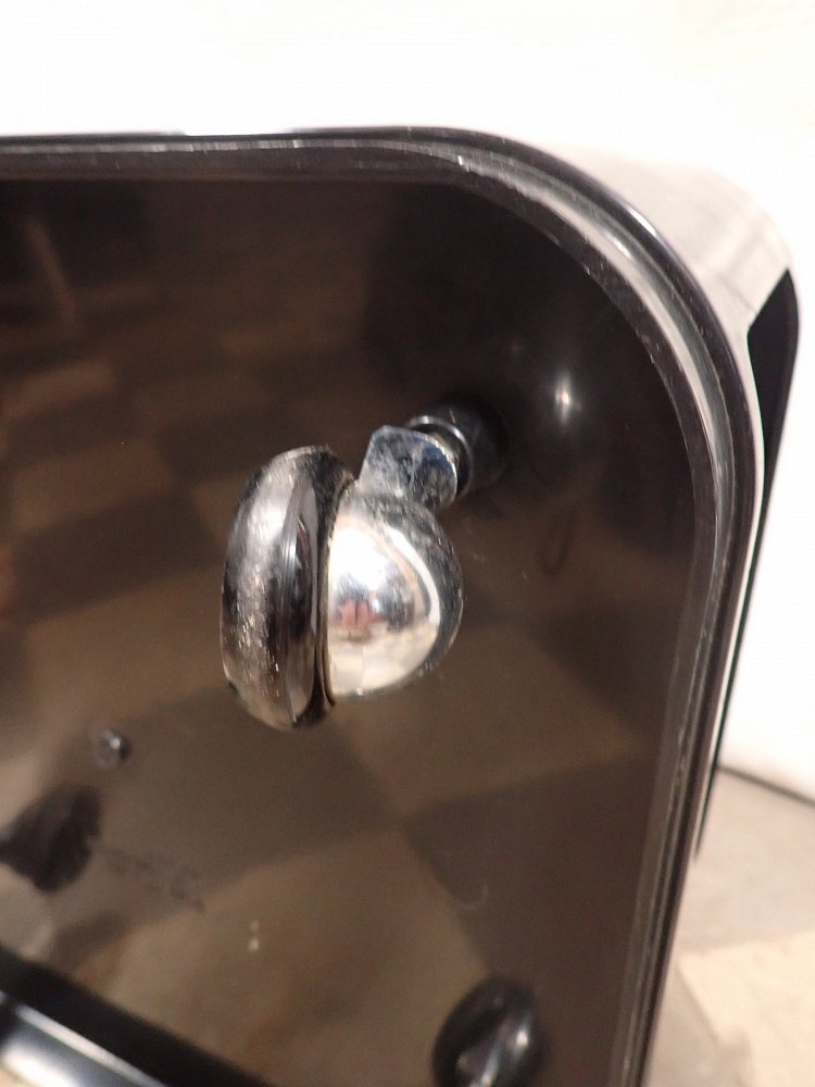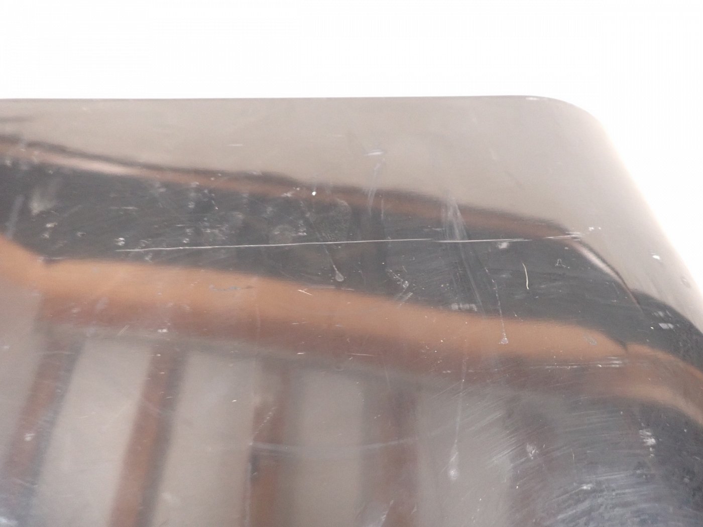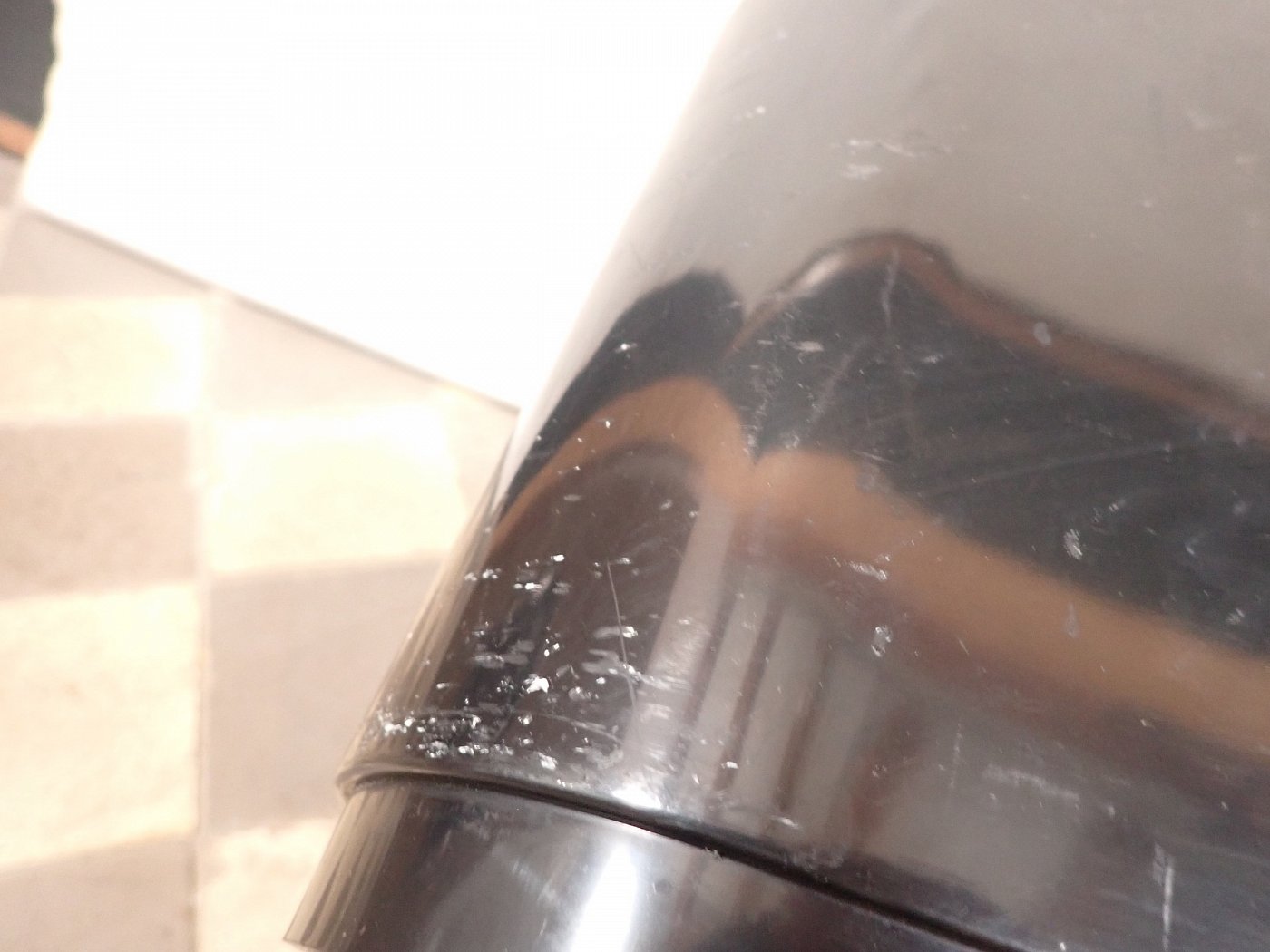 Die schwarze Kunststoffoberfläche hat deutliche Gebrauchsspuren in Form von feinen Kratzern.