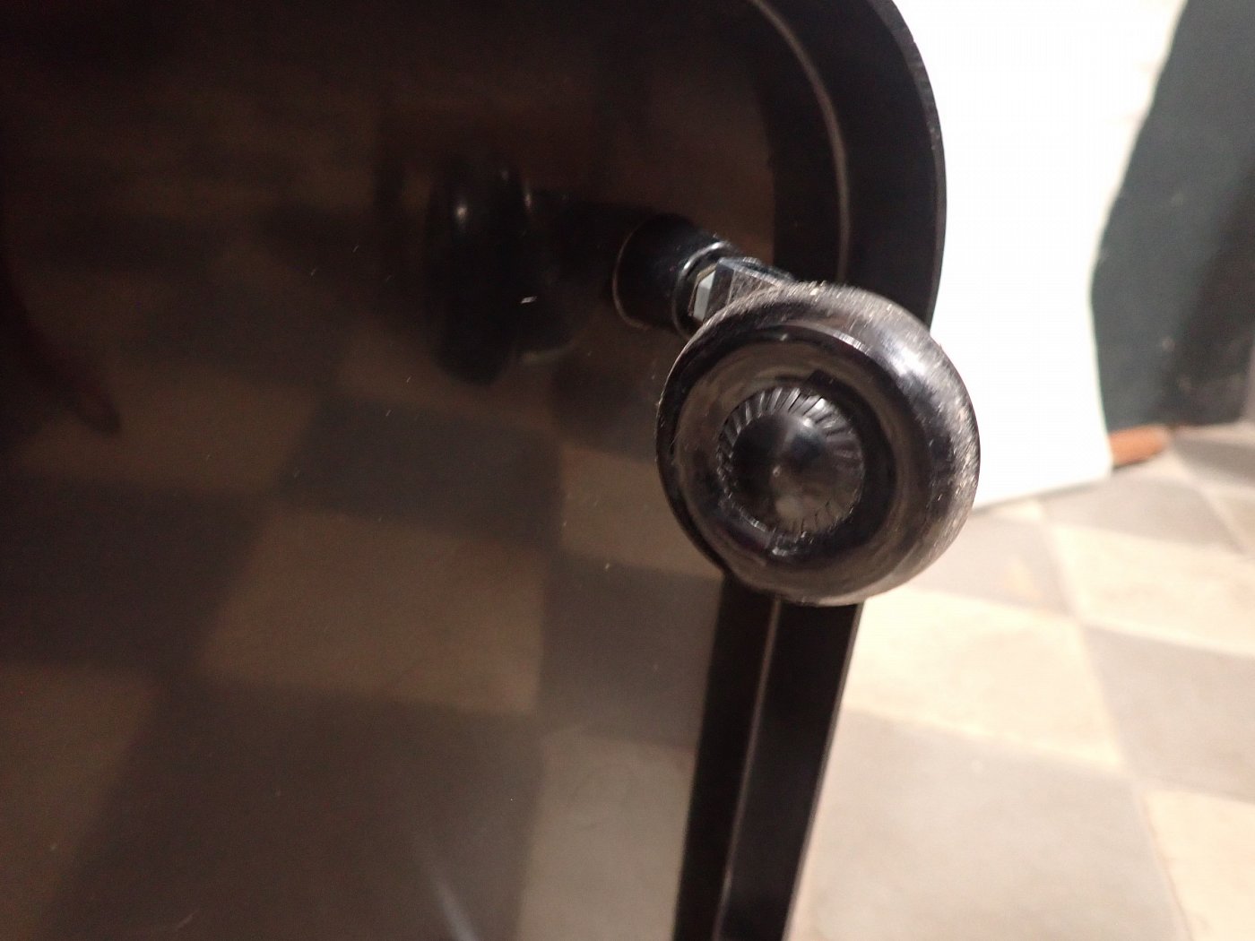 DetailansichtServierwagen mit Rollen. Der Servierwagen hat zwei Etagen, die als Ablagefläche dienen. Am Metallgestell ist ein Zeitungshalter aus Metall. Der Zustand des...