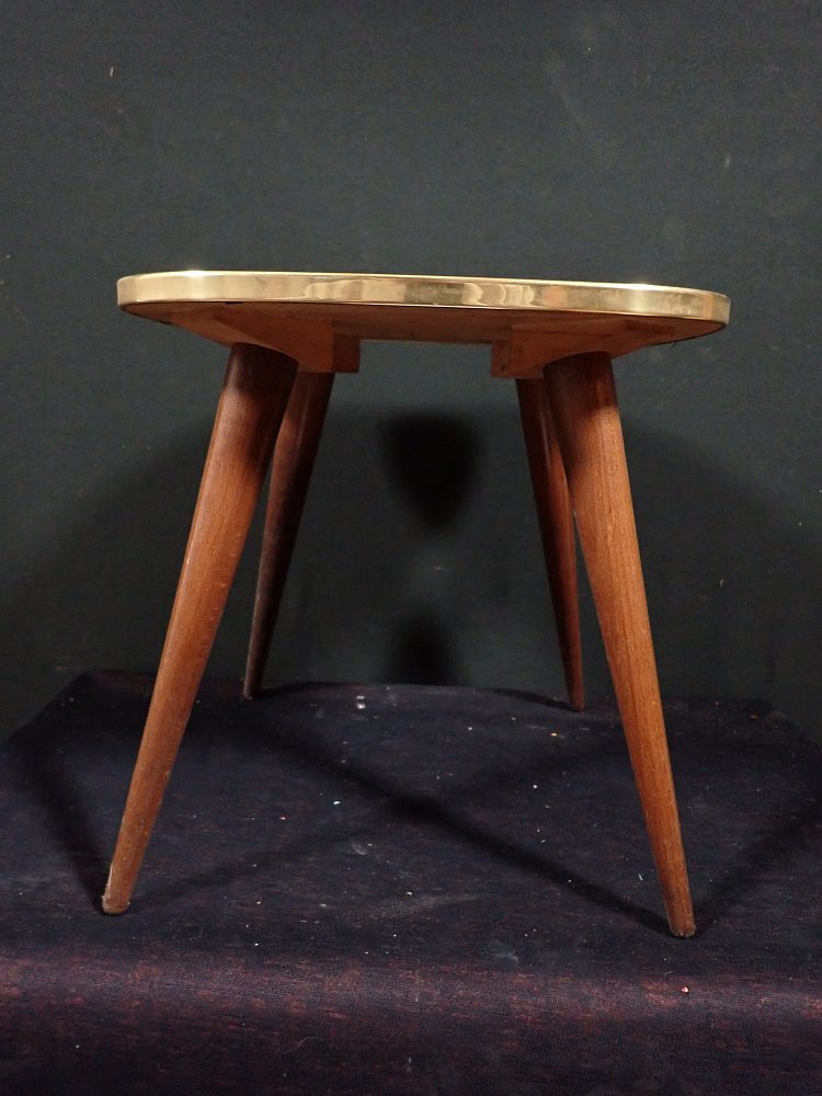 Detailansicht50 er - Jahre Couchtisch. Die Tischplatte hat ein schlichtes Muster, umrandet ist die Tischplatte mit einem Messingstreifen. Die Holzbeine sind unten mit Messingfüßen...