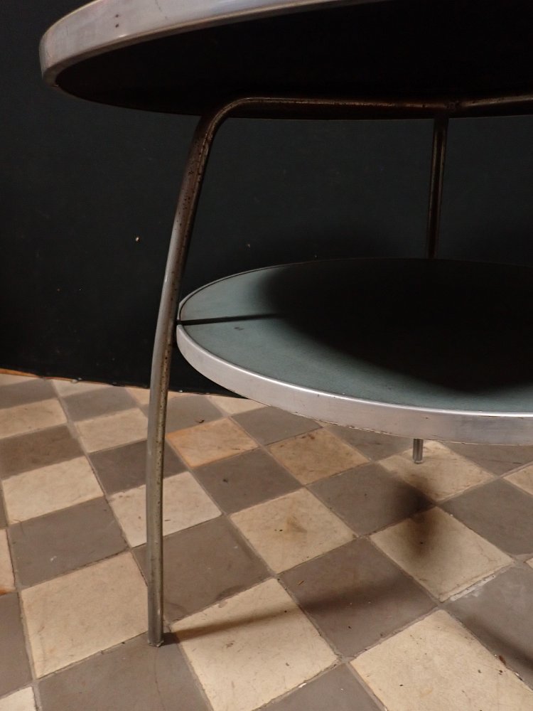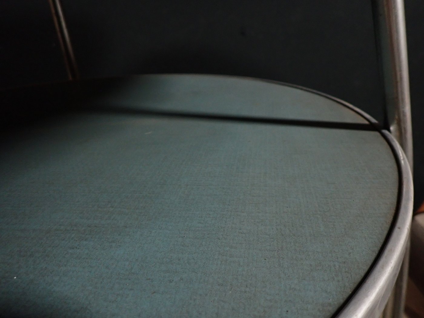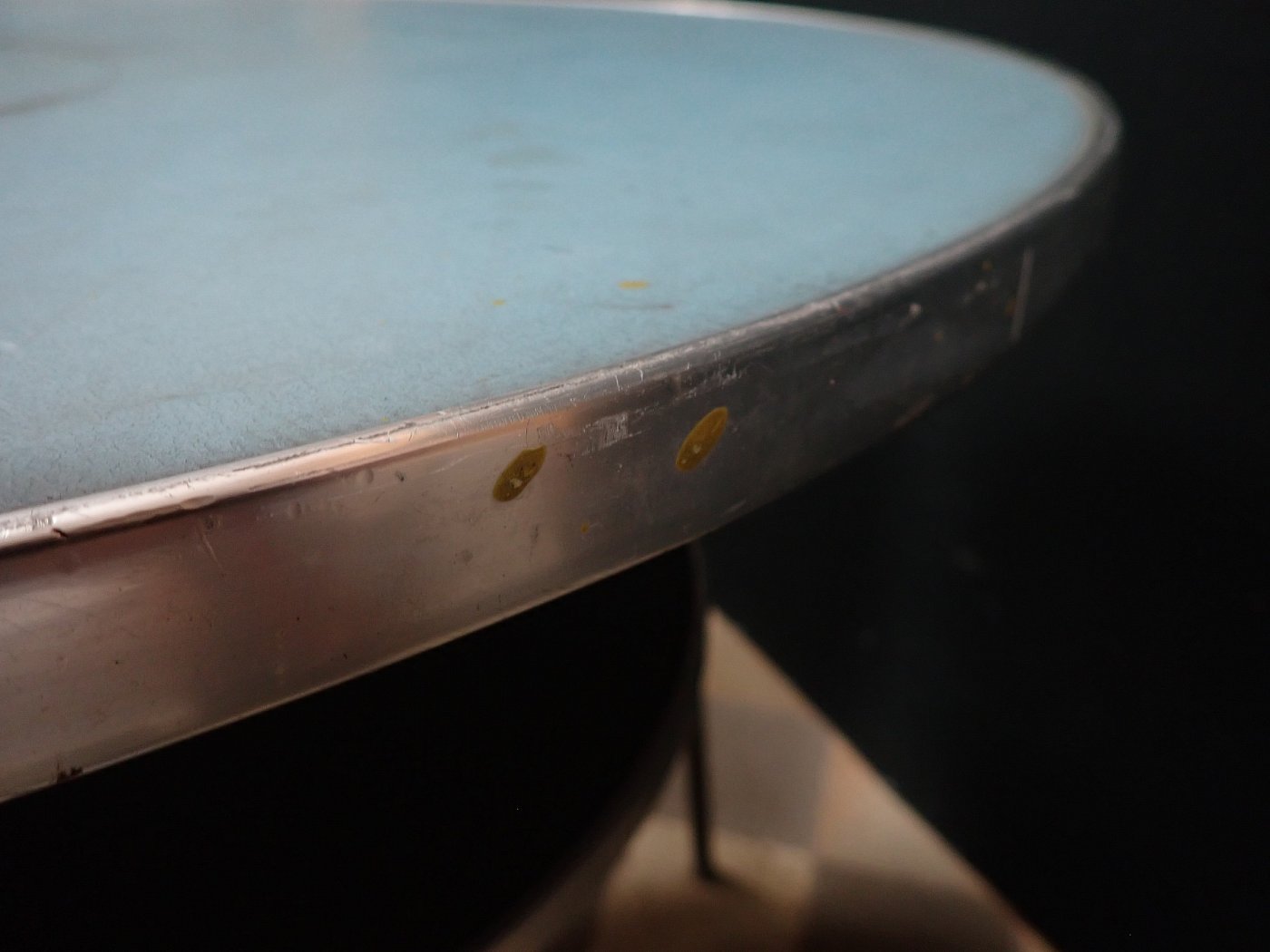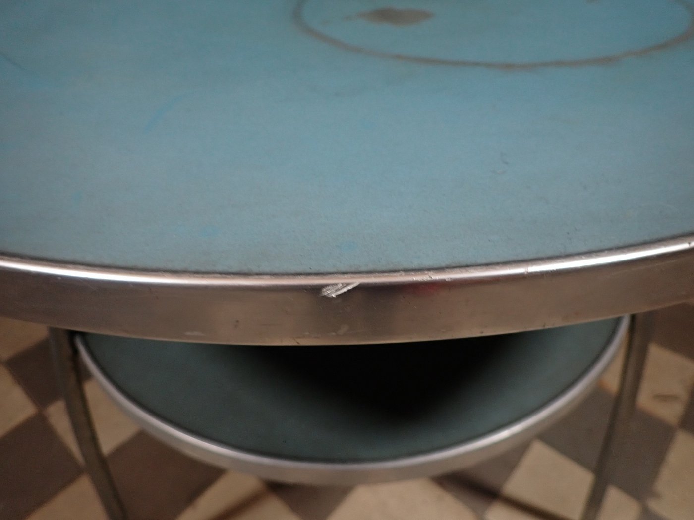 Die beiden Holzplatten des Tischchens sind mit hellblauem Linoleum belegt und von Chromleisten eingefasst. Im Gegensatz zu der großen Platte, die auf dem dreibeinigen Gestell aufliegt, ist die kleinere Platte zwischen den verchromten Beinen befestigt.