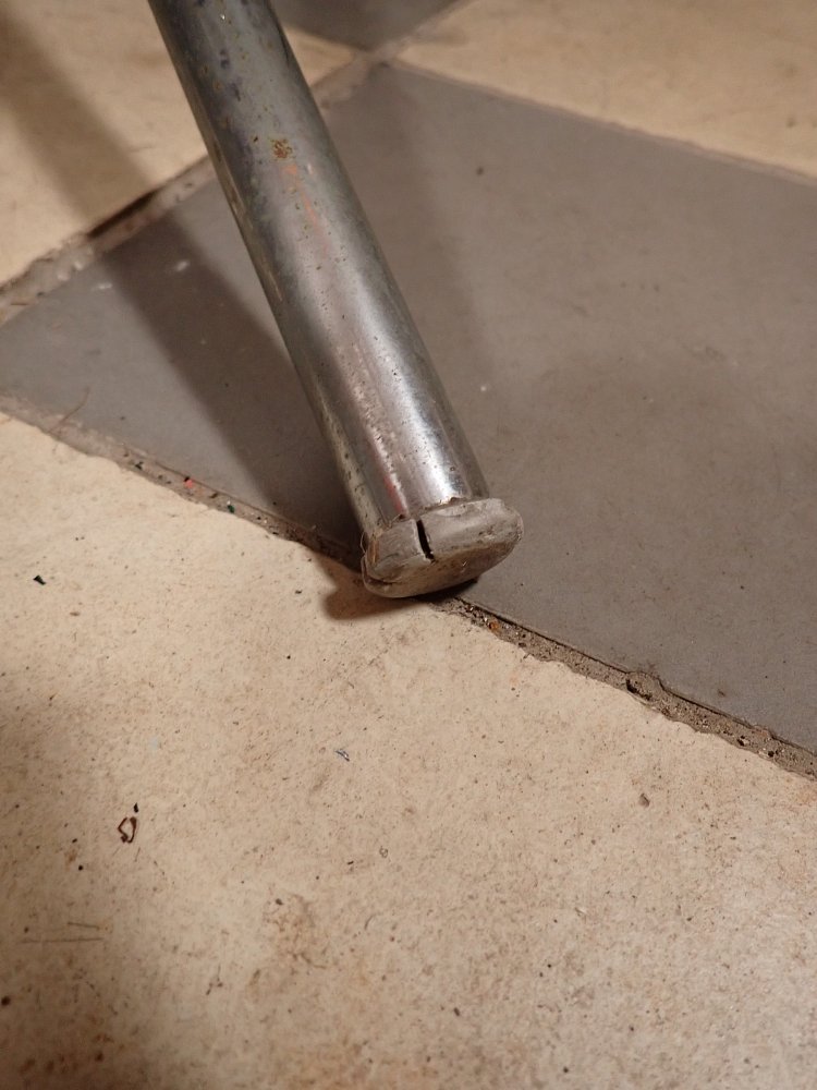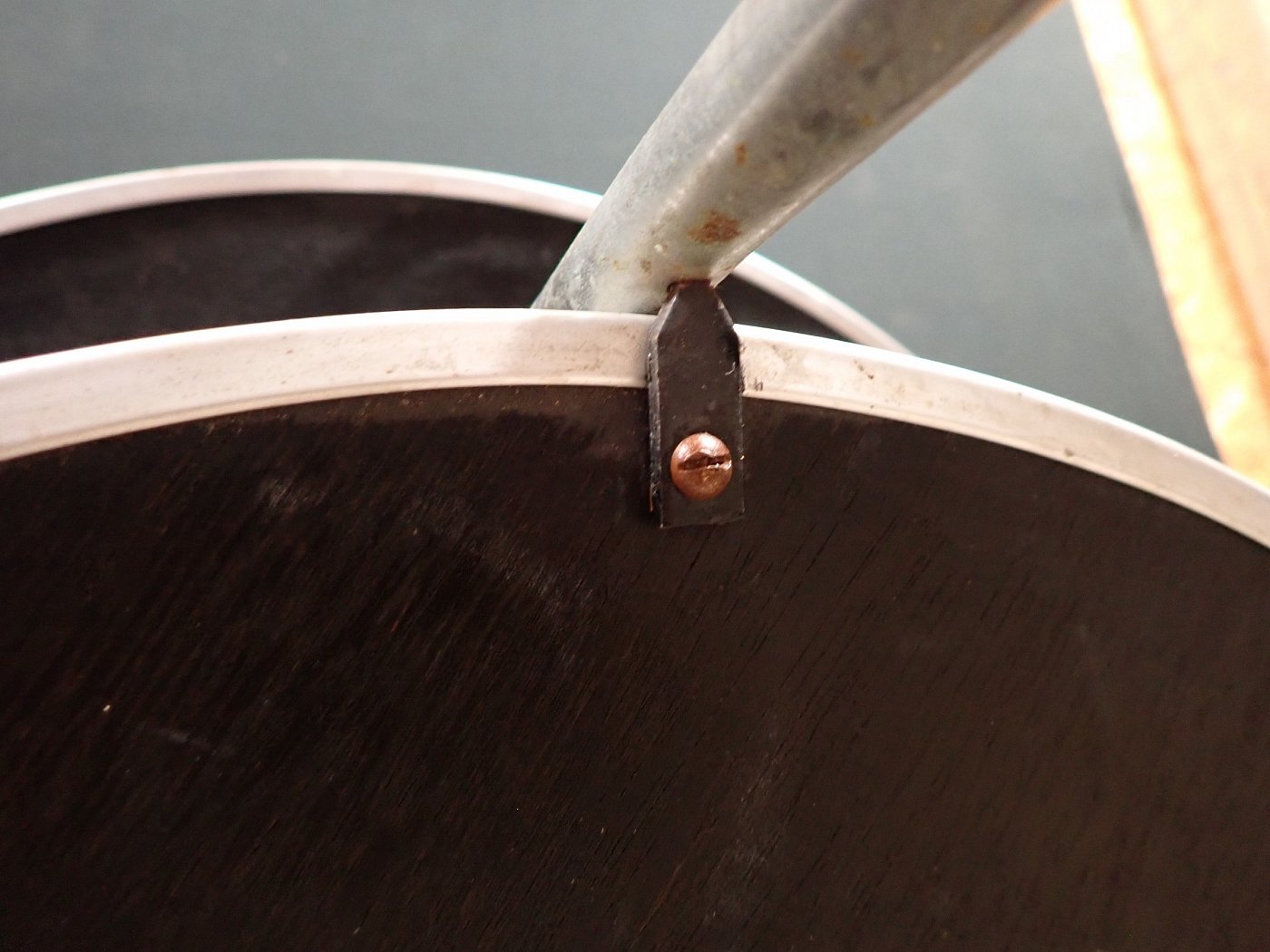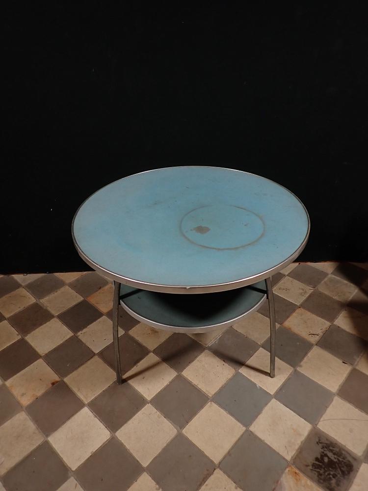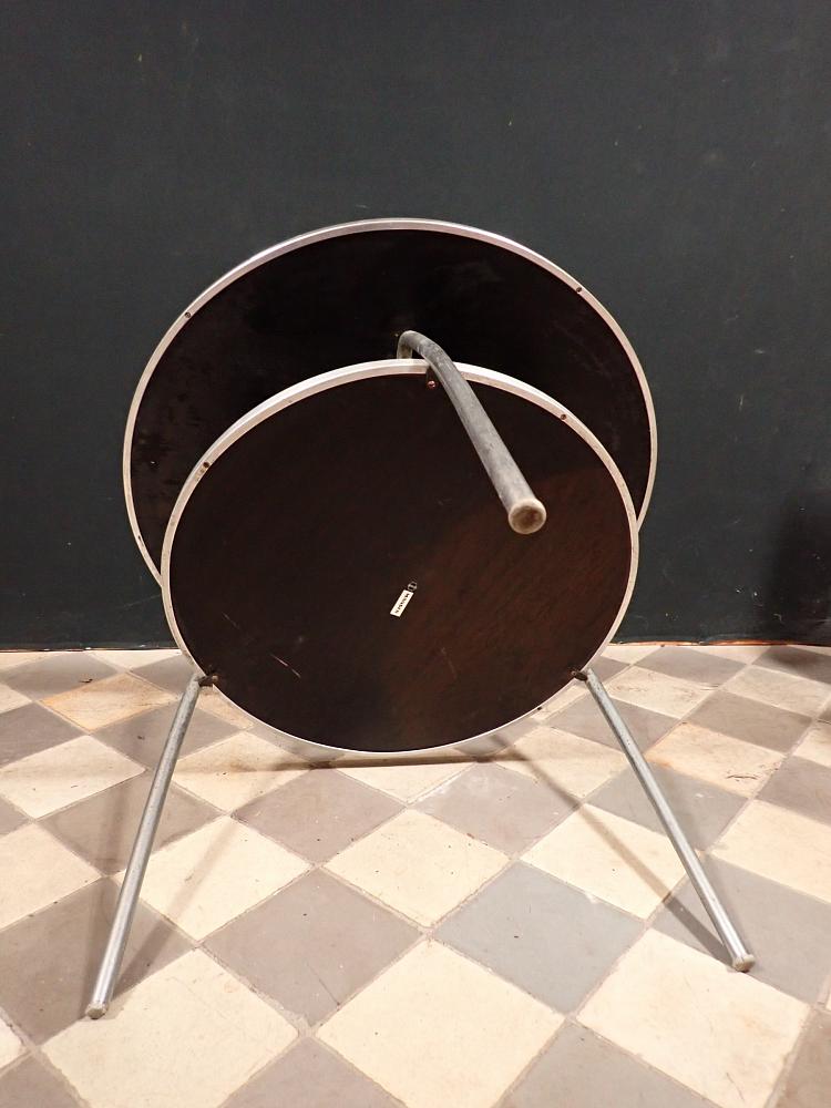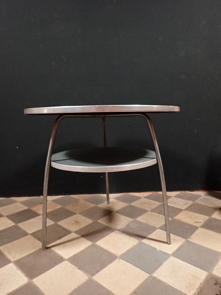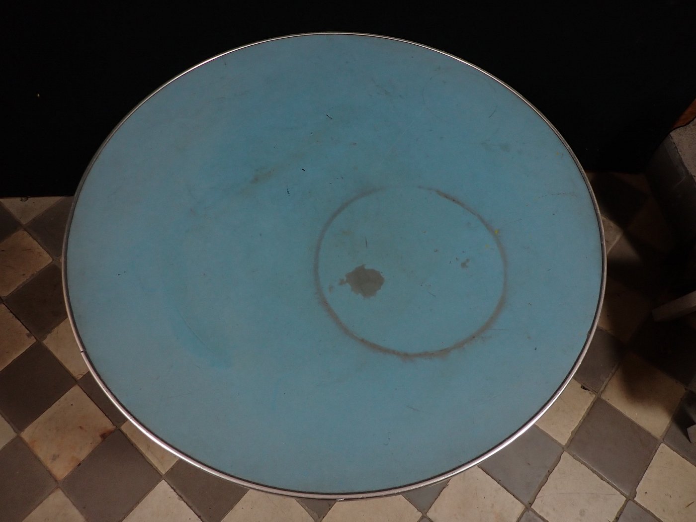 Die beiden Holzplatten des Tischchens sind mit hellblauem Linoleum belegt und von Chromleisten eingefasst. Im Gegensatz zu der großen Platte, die auf dem dreibeinigen Gestell aufliegt, ist die kleinere Platte zwischen den verchromten Beinen befestigt.