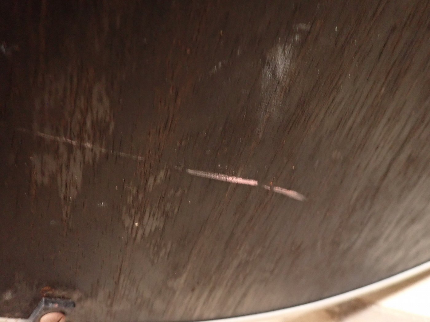 DetailansichtDer Couchtisch ist aus dunklem Teak holz. Unter der großen Tischplatte befindet sich eine gitterartige Ablage. Es sind leichte Gebrauchspuren wie kleine Kratzer...