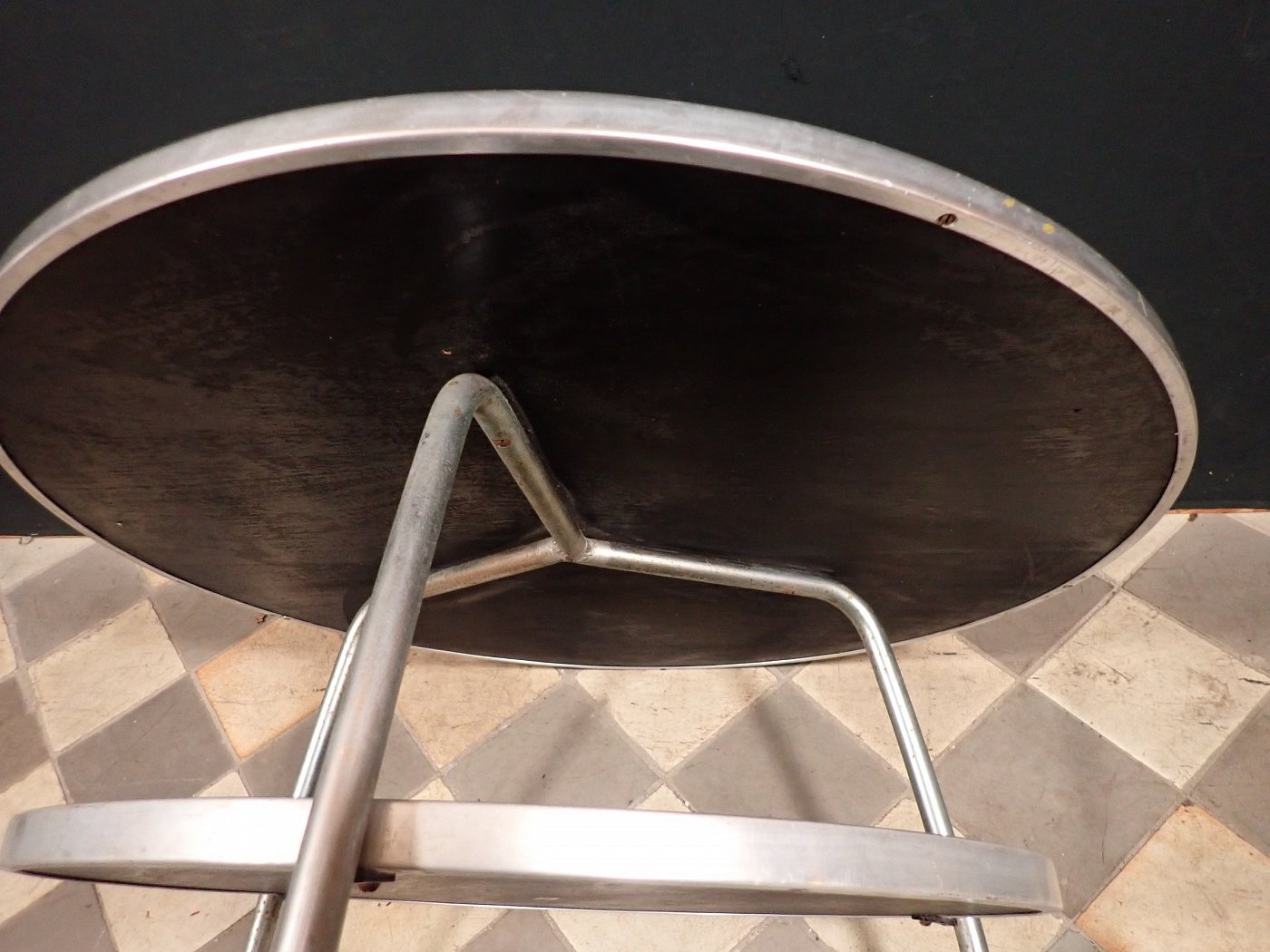 DetailansichtNierentisch mit schwarz beschichteter Tischplatte. Die nierenförmige Tischplatte ist auf einem dreibeinigen Stahlrohrgestell befestigt und mit einer Chromleiste...