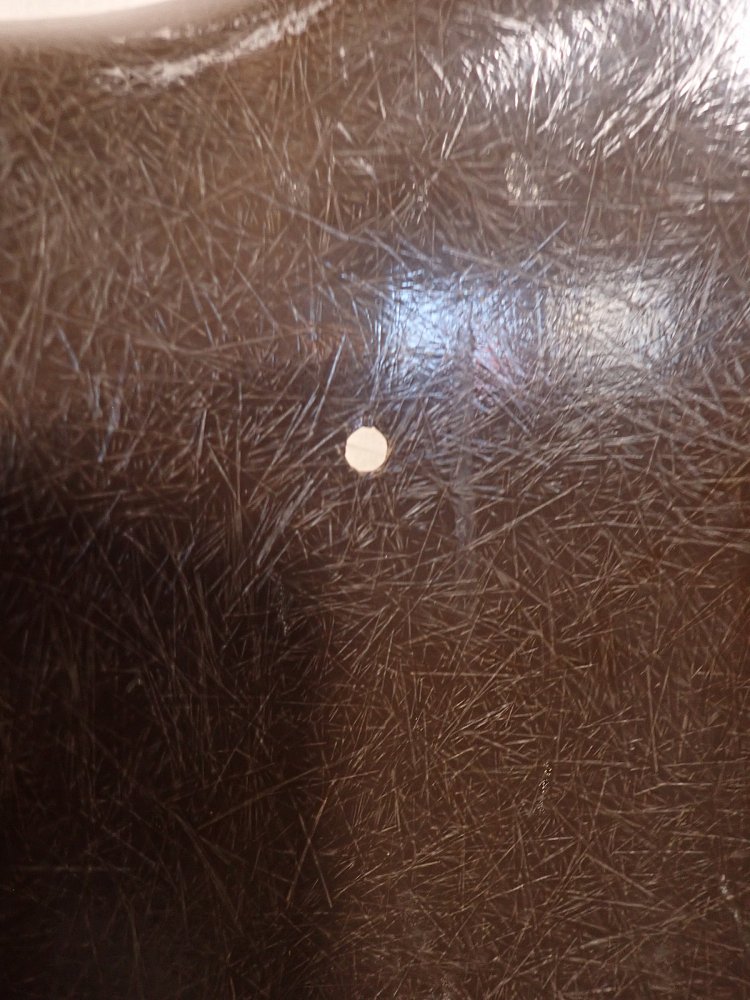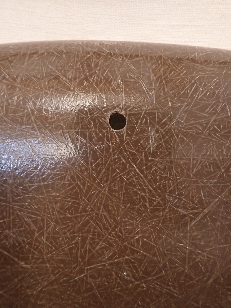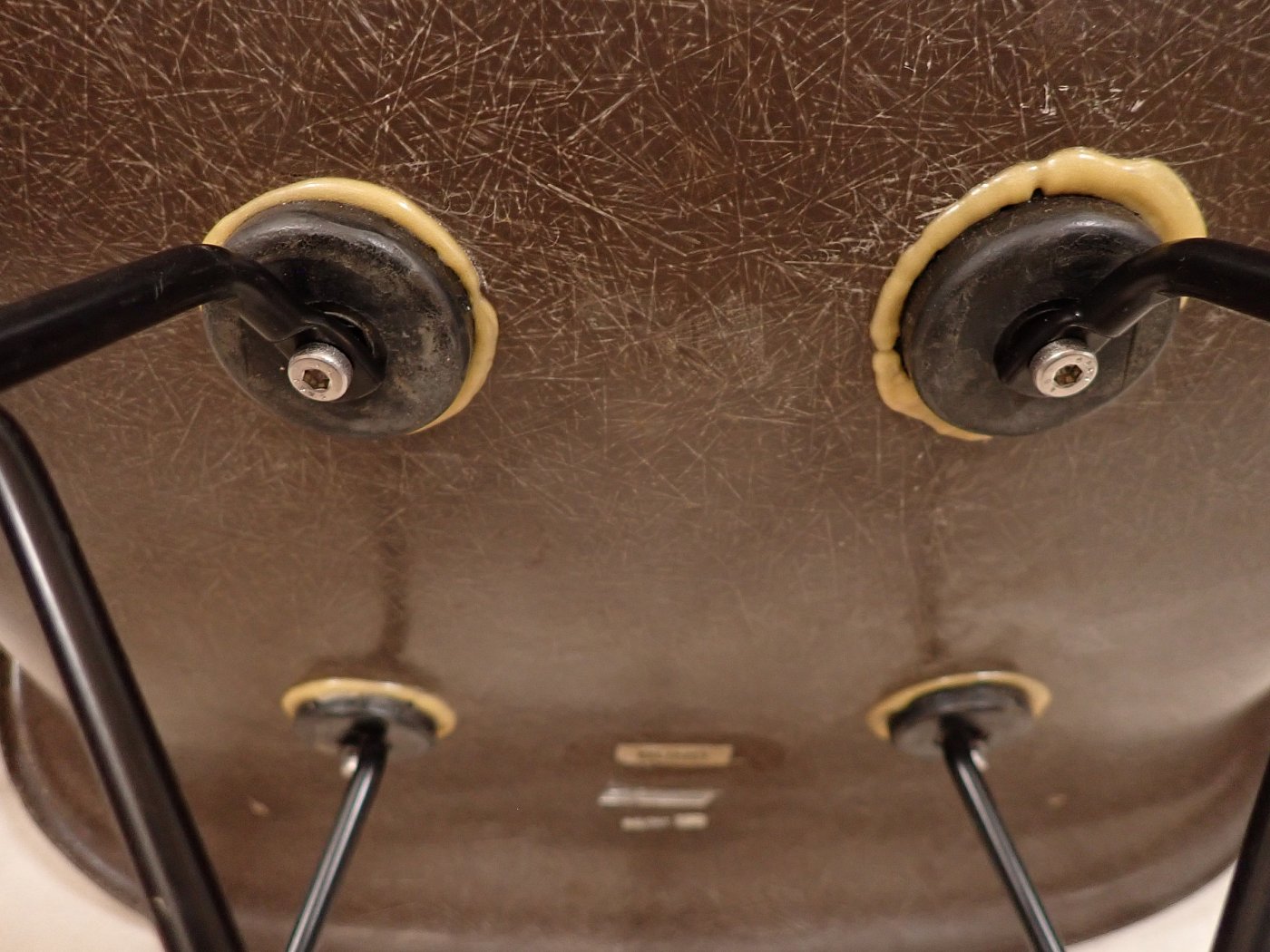 Die Gleiter, die an den Stuhlfüßen angebracht werden fehlen, können aber durch neue ersetzt werden. In der Sitzfläche sind mehrere kleine Löcher gebohrt, vermutlich war dort ein Sitzpolster angebracht. Da Untergestell und Sitzschale getrennt gelagert wurden, sind die Schrauben abhandengekommen, diese wurden durch neue passende Schrauben ersetzt.