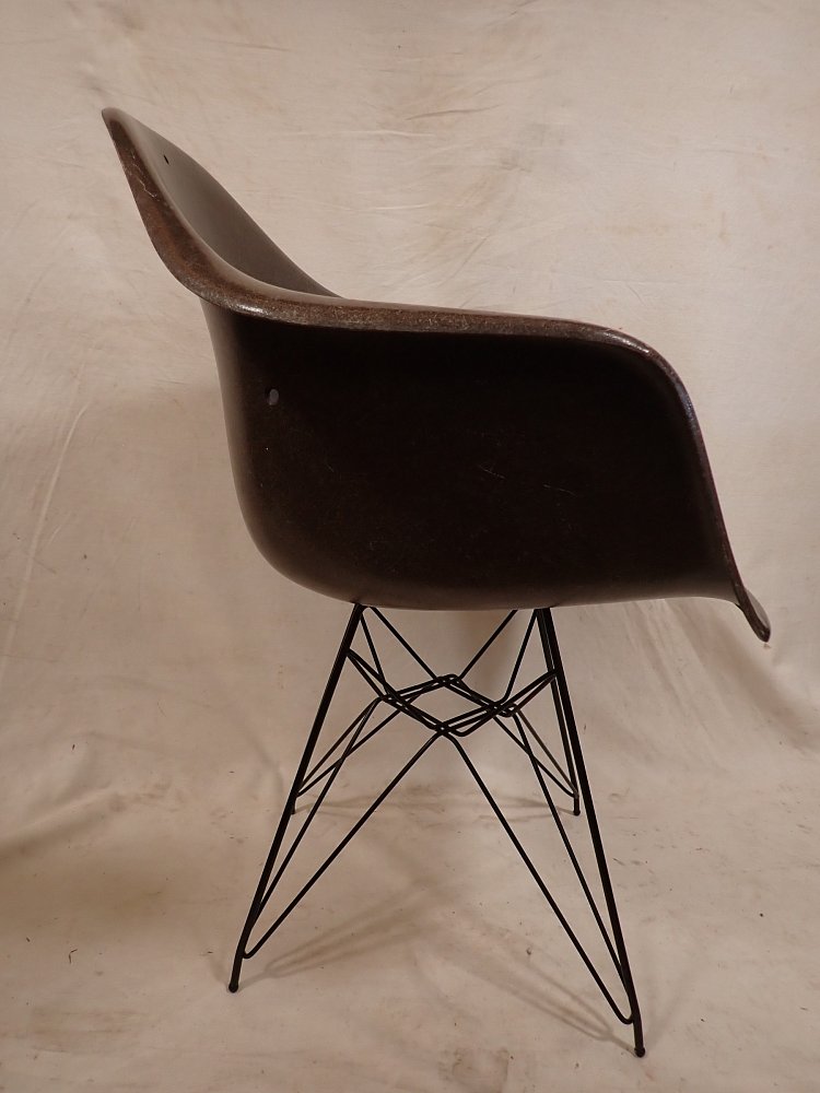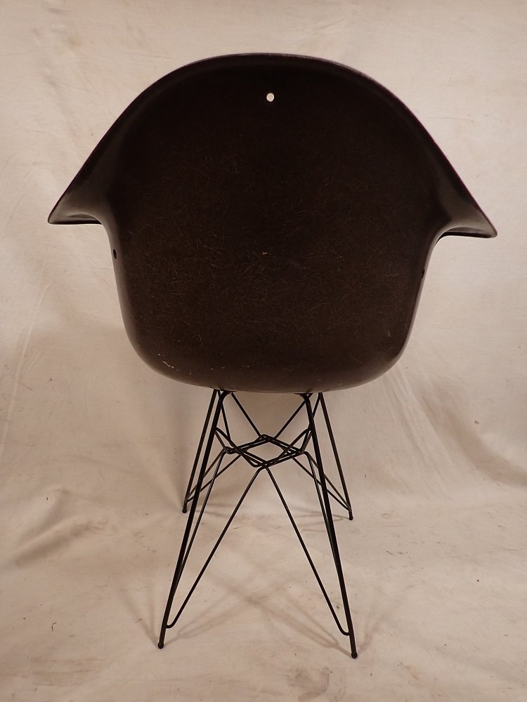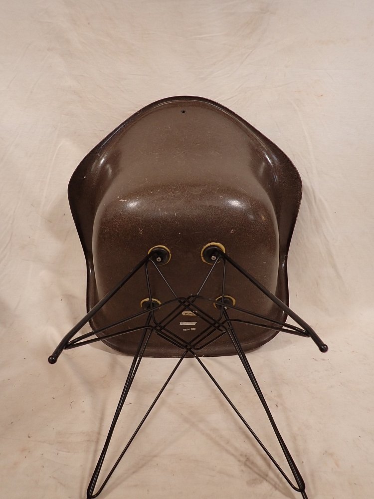 "DAR" ist die Abkürzung für "Dining Height Armchair Rod Base", was Esszimmerstuhl mit Armlehnen und Drahtuntergestell bedeutet. Auf der Unterseite der Schale ist eine Markung in Form eines Aufklebers zu erkennen.