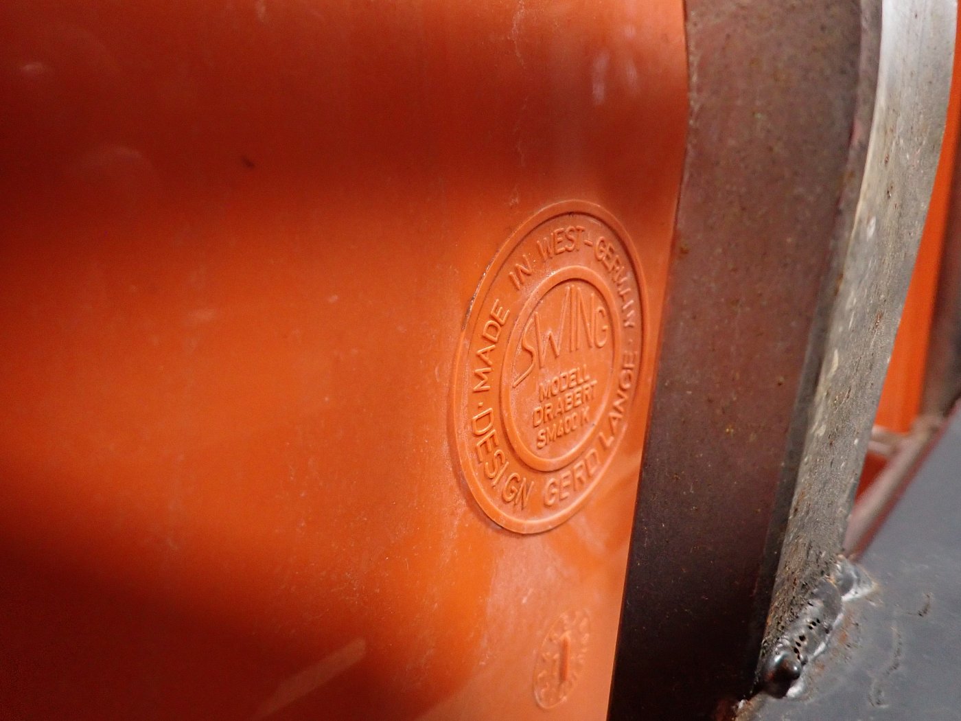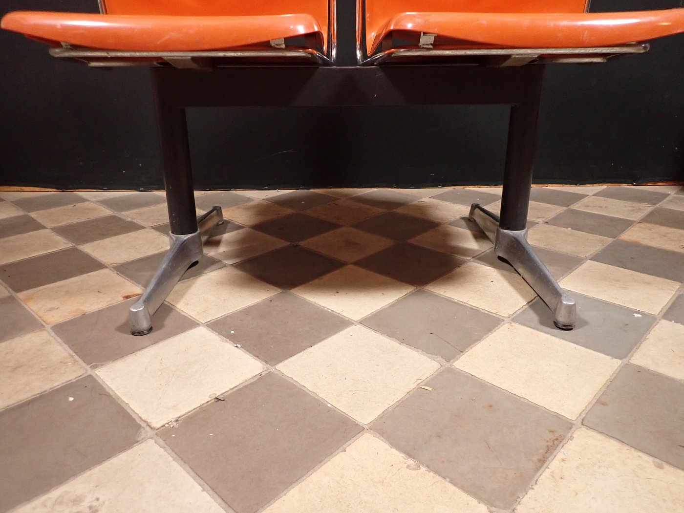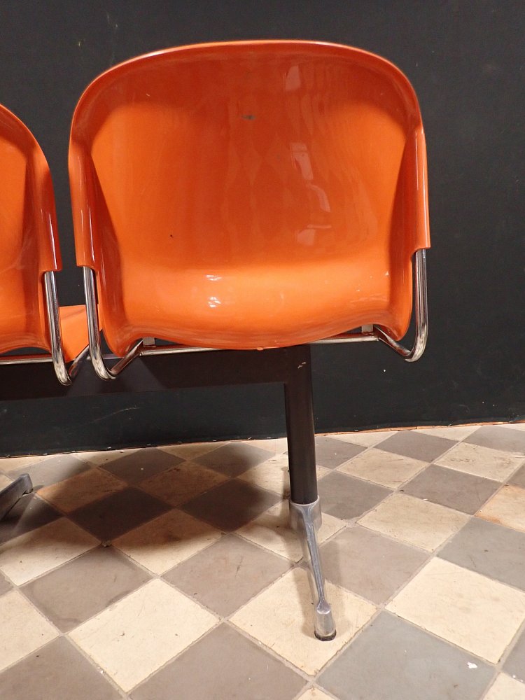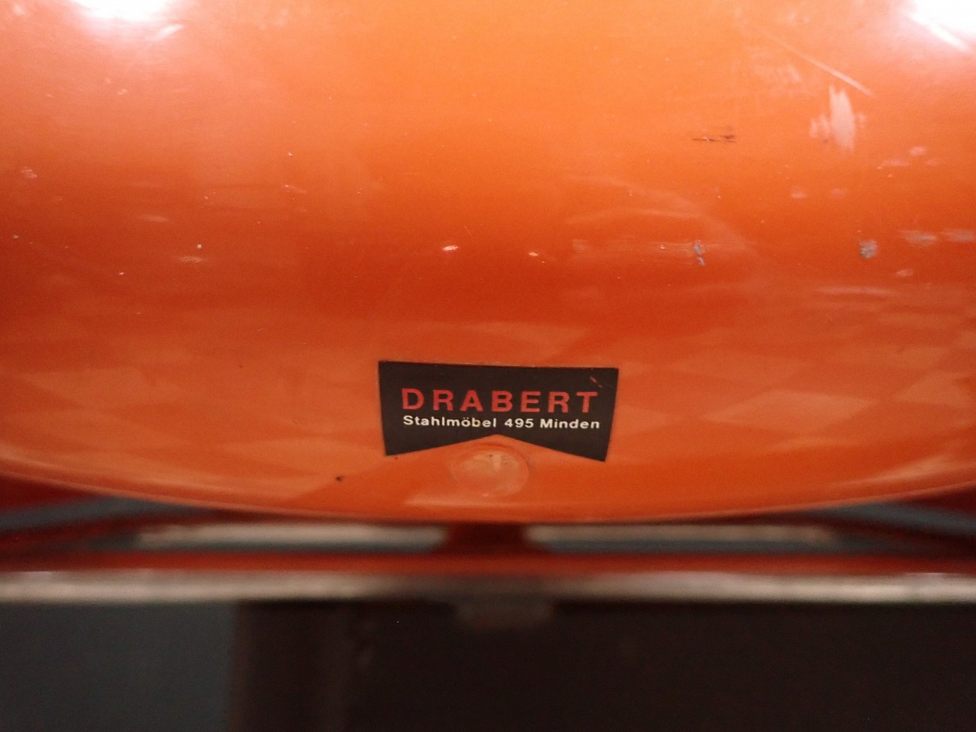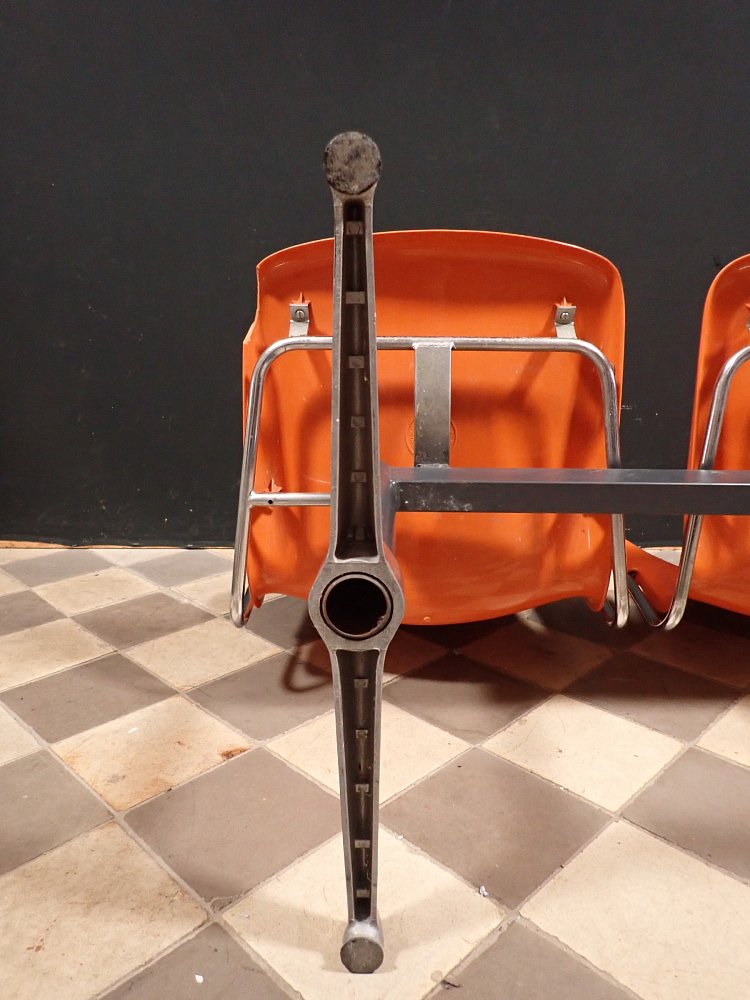 Auf der Rückseite der beiden Sitzschalen ist das Modell der Wartebank "DRABERT SM400 K" eingeprägt. Entworfen wurde das Sitzmöbel in den 70-er Jahren von dem Designer Gerd Lange.