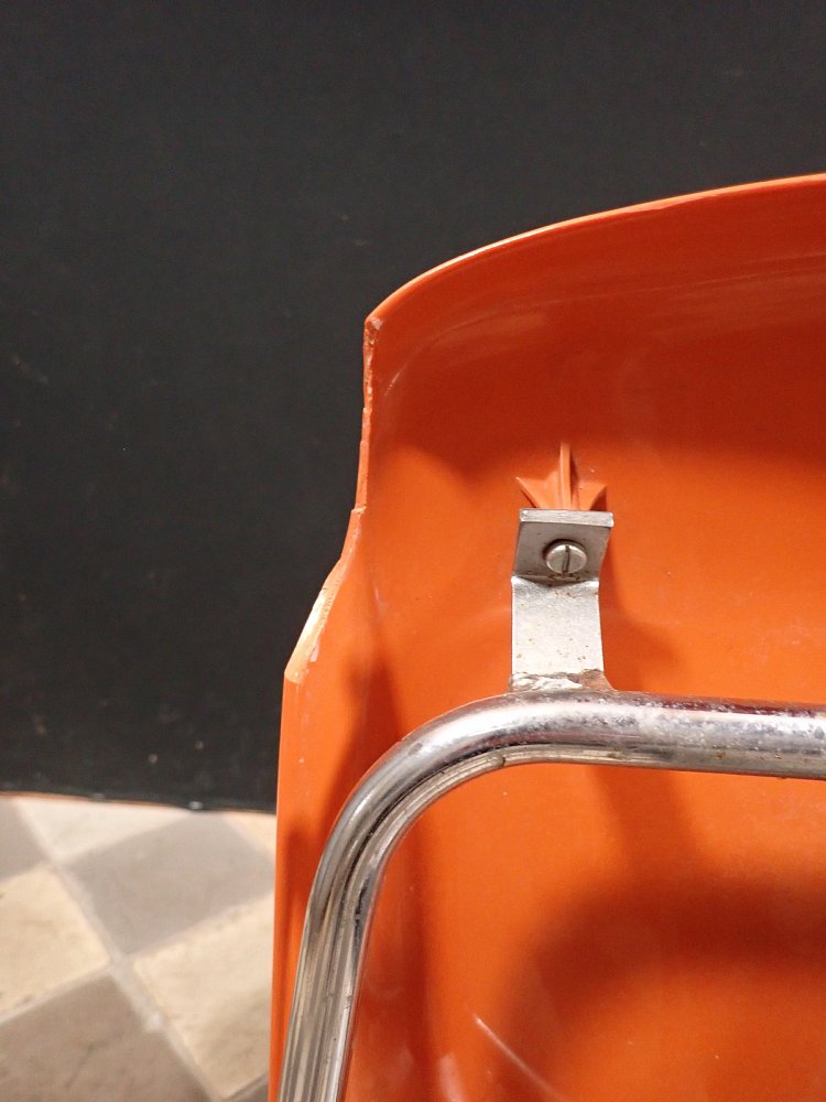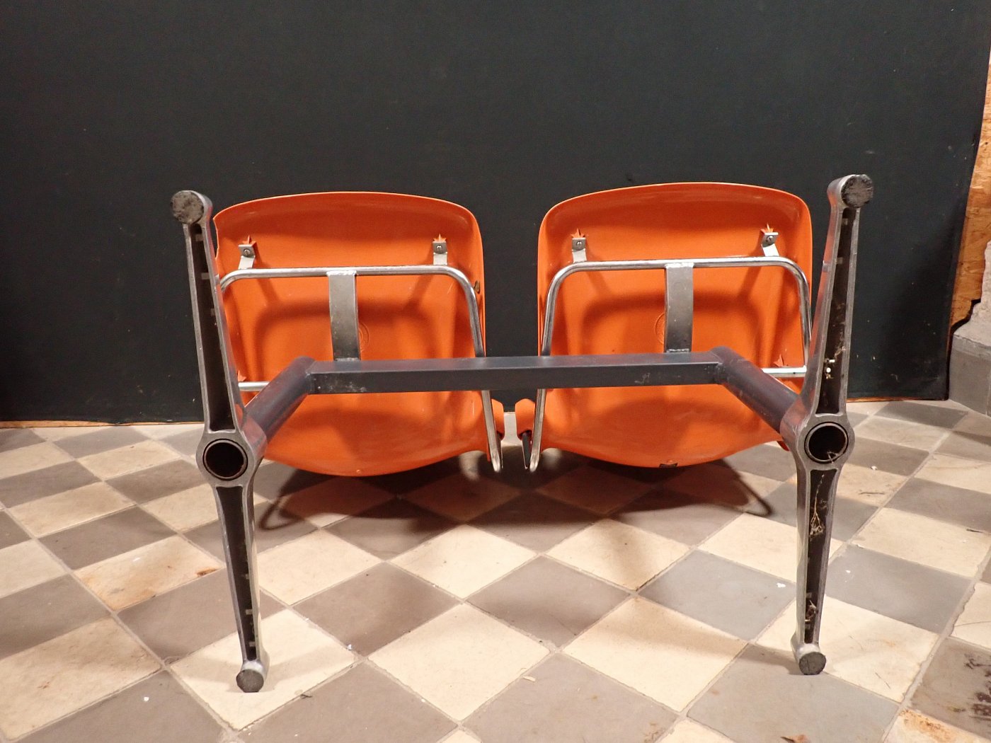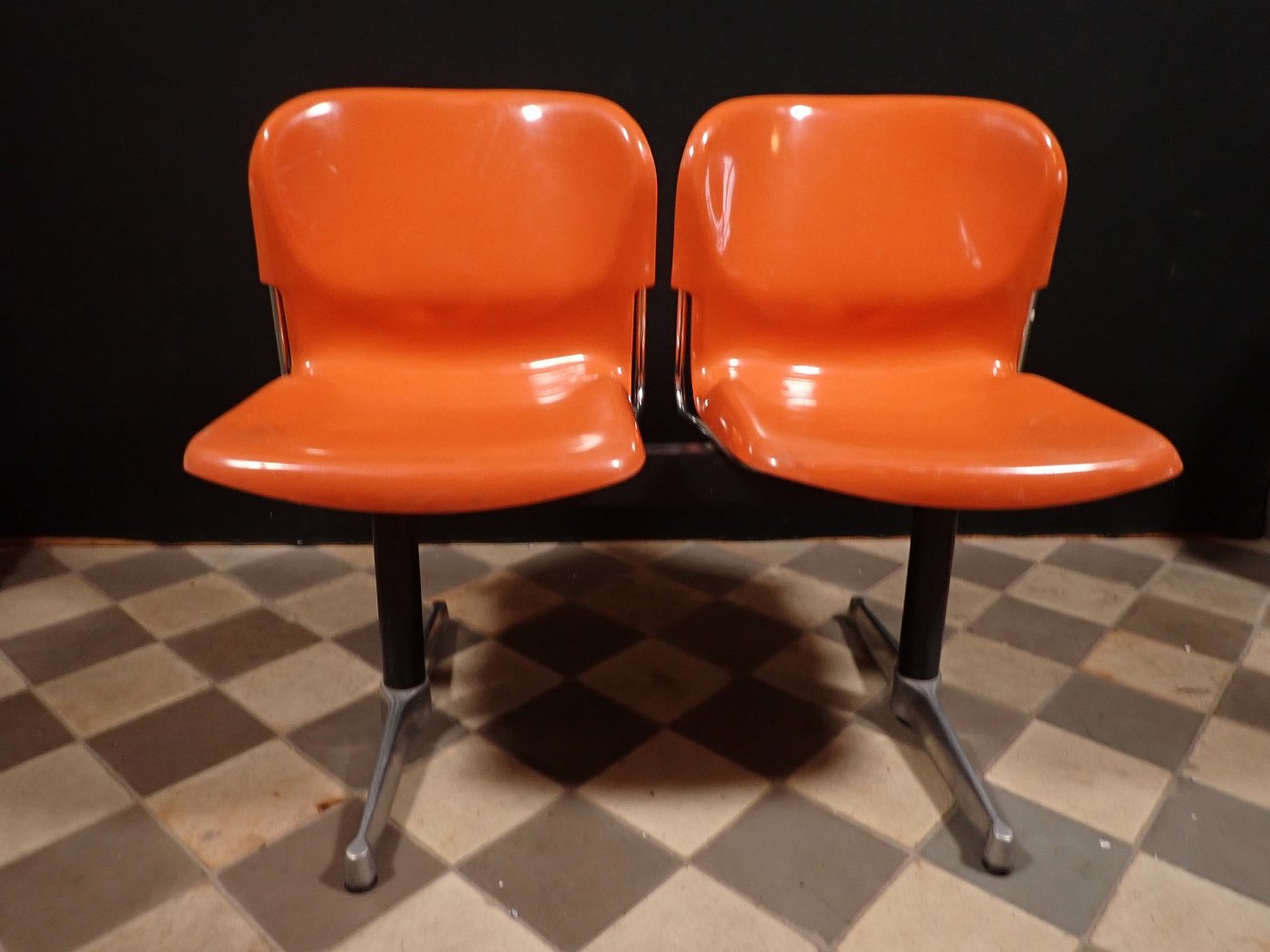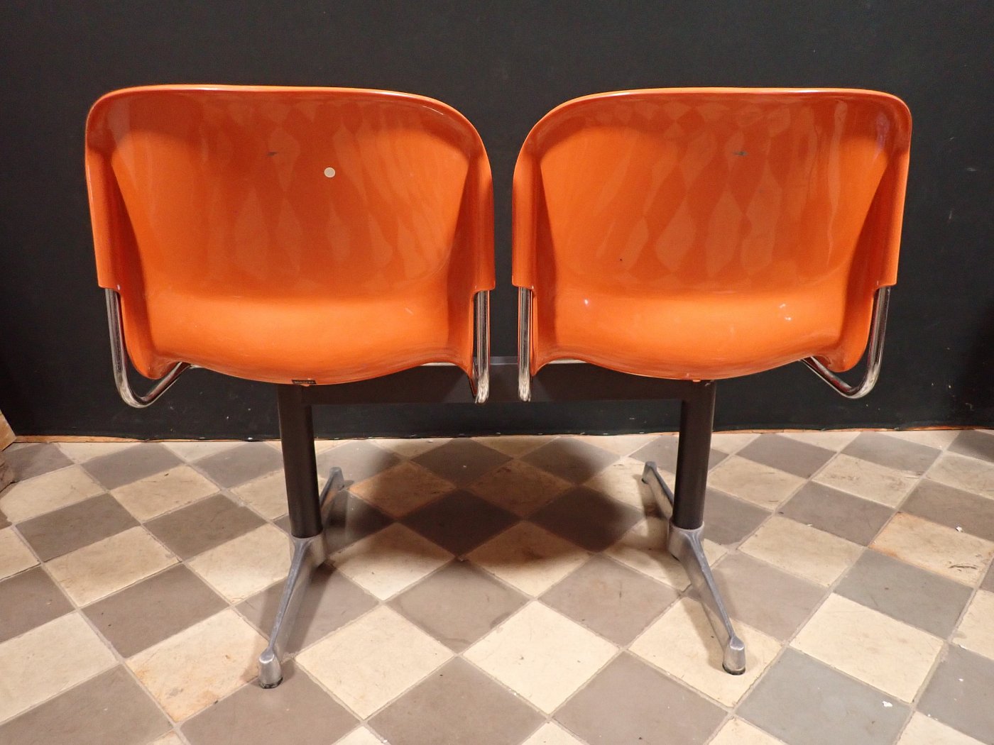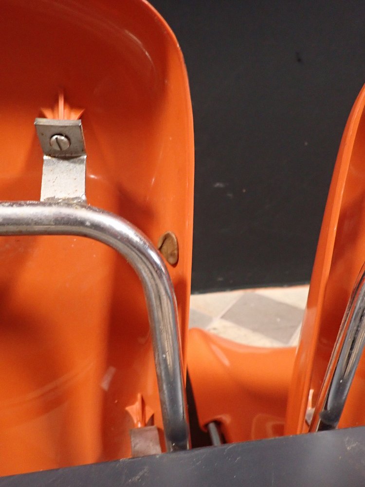 Auf der Rückseite der beiden Sitzschalen ist das Modell der Wartebank "DRABERT SM400 K" eingeprägt. Entworfen wurde das Sitzmöbel in den 70-er Jahren von dem Designer Gerd Lange.