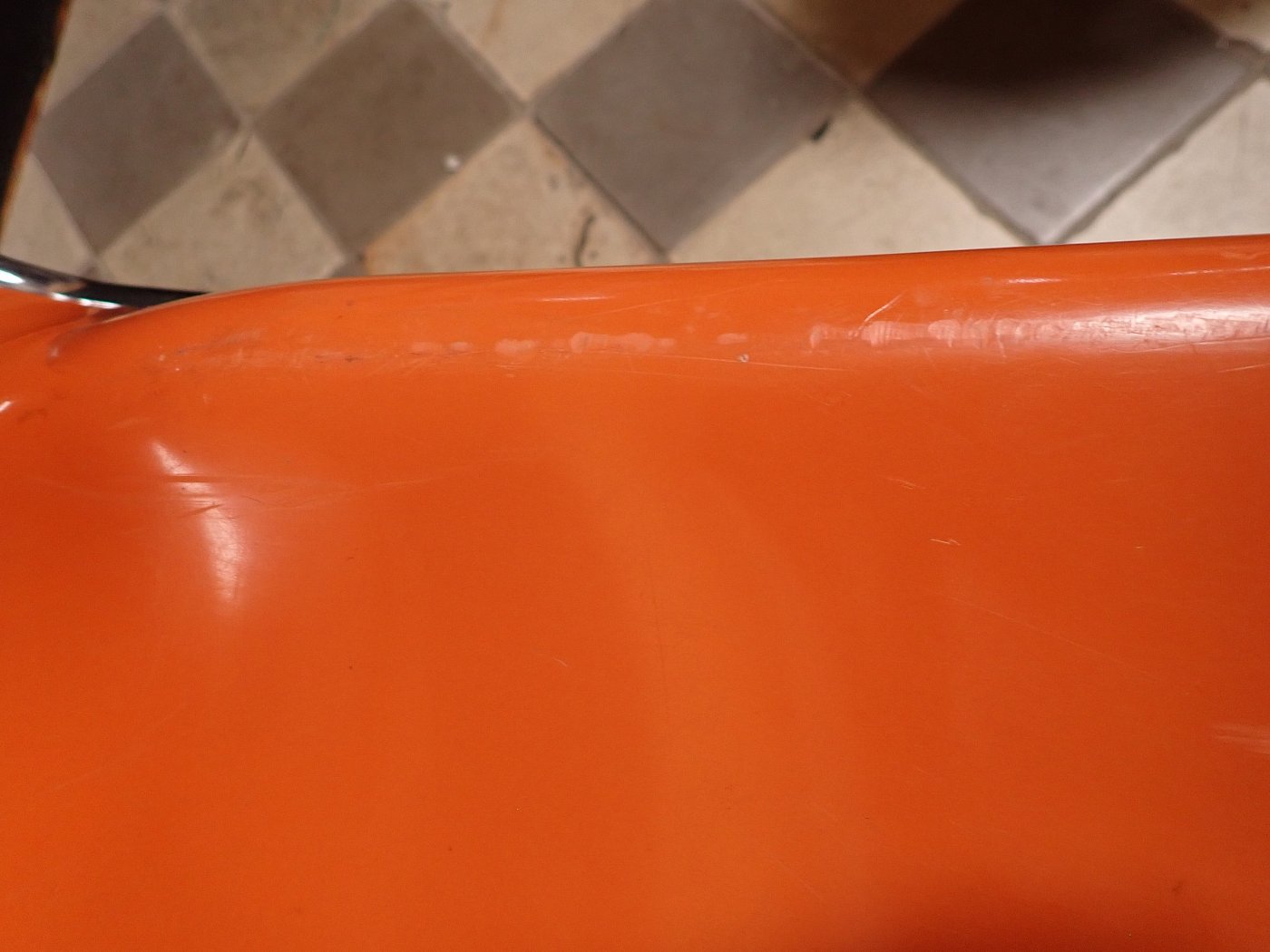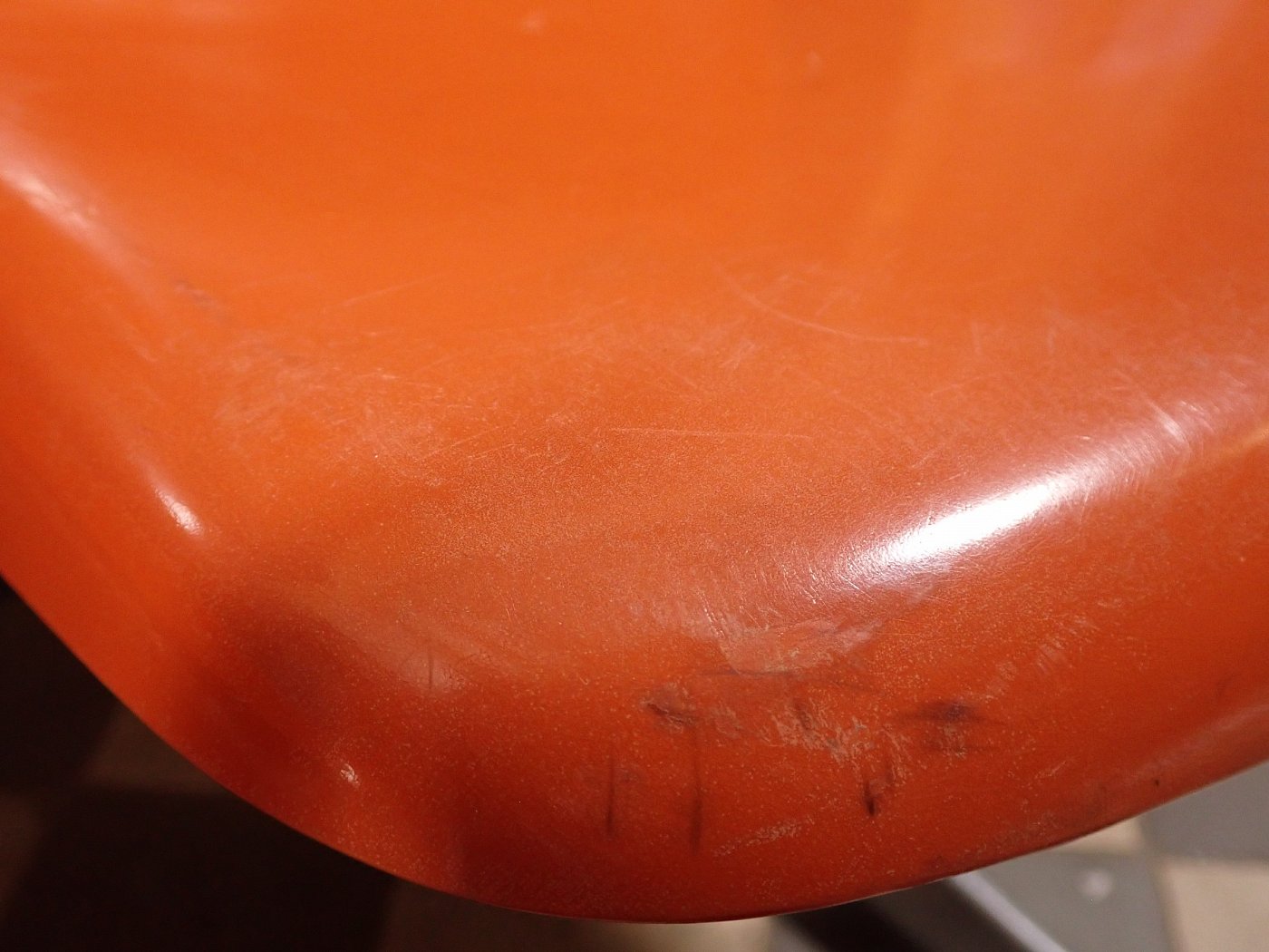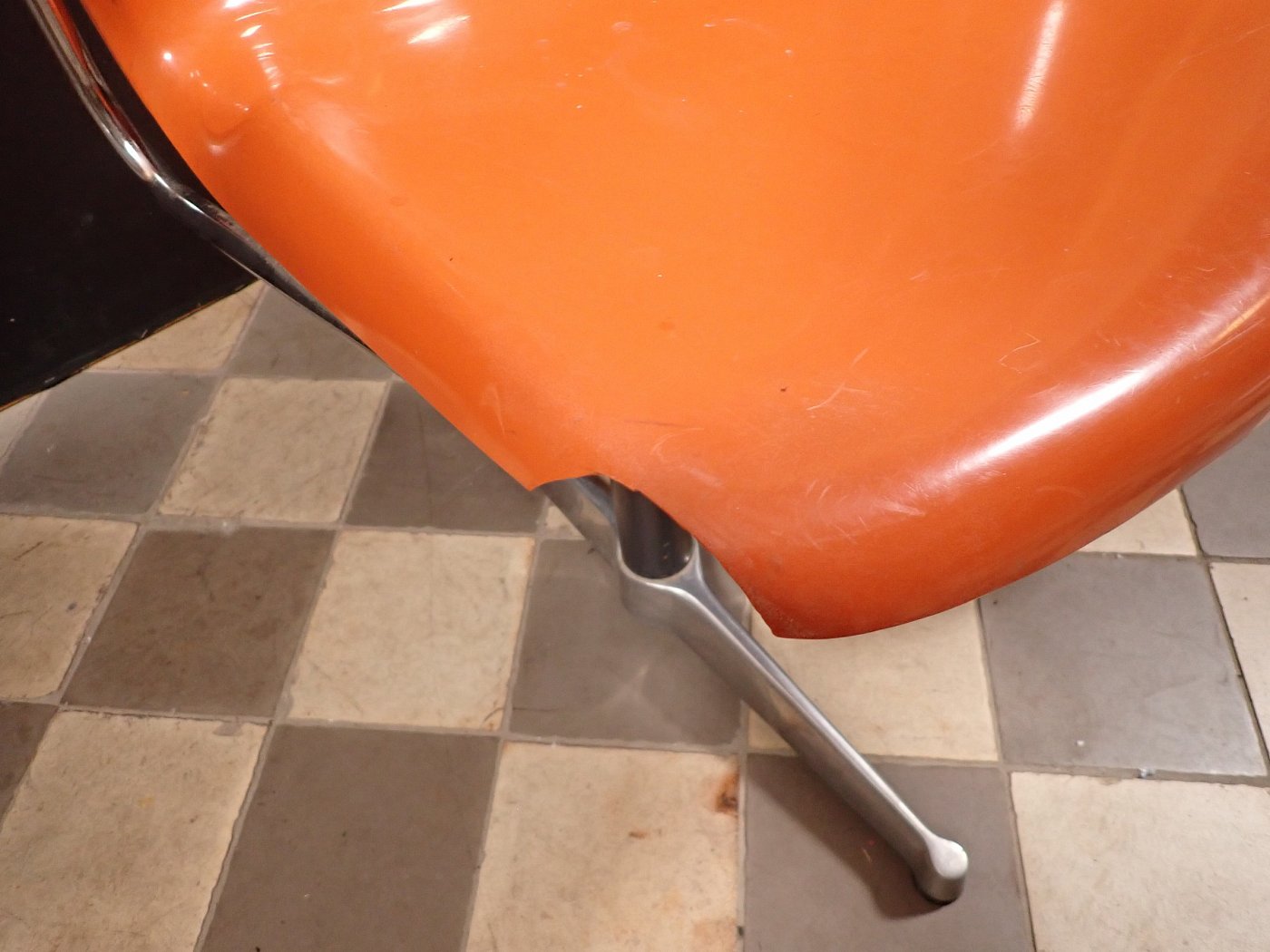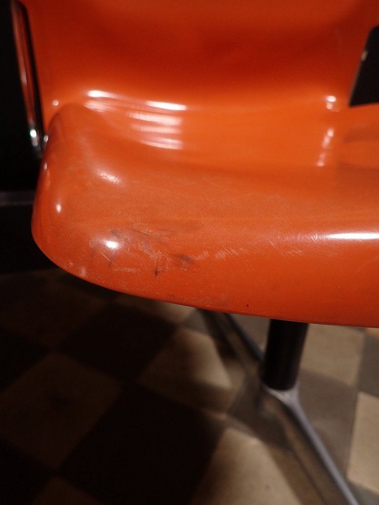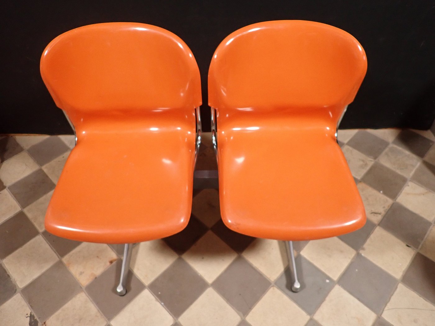 Auf der Rückseite der beiden Sitzschalen ist das Modell der Wartebank "DRABERT SM400 K" eingeprägt. Entworfen wurde das Sitzmöbel in den 70-er Jahren von dem Designer Gerd Lange.