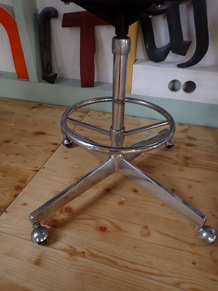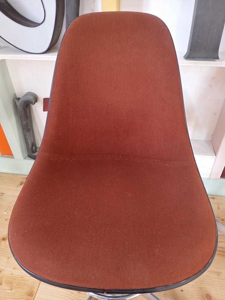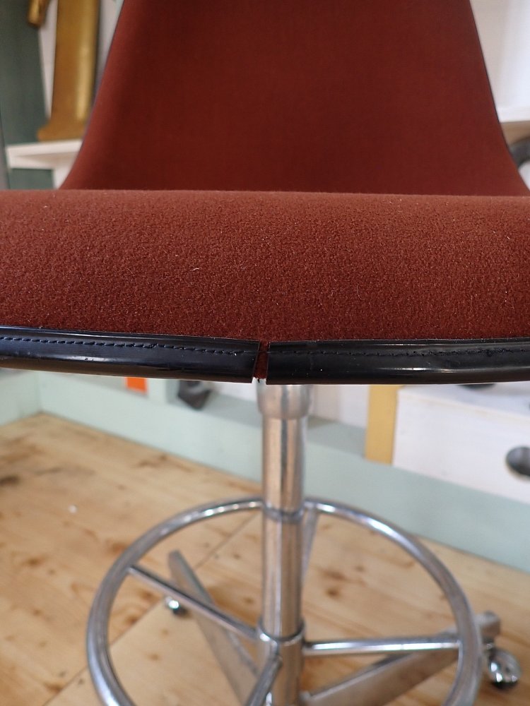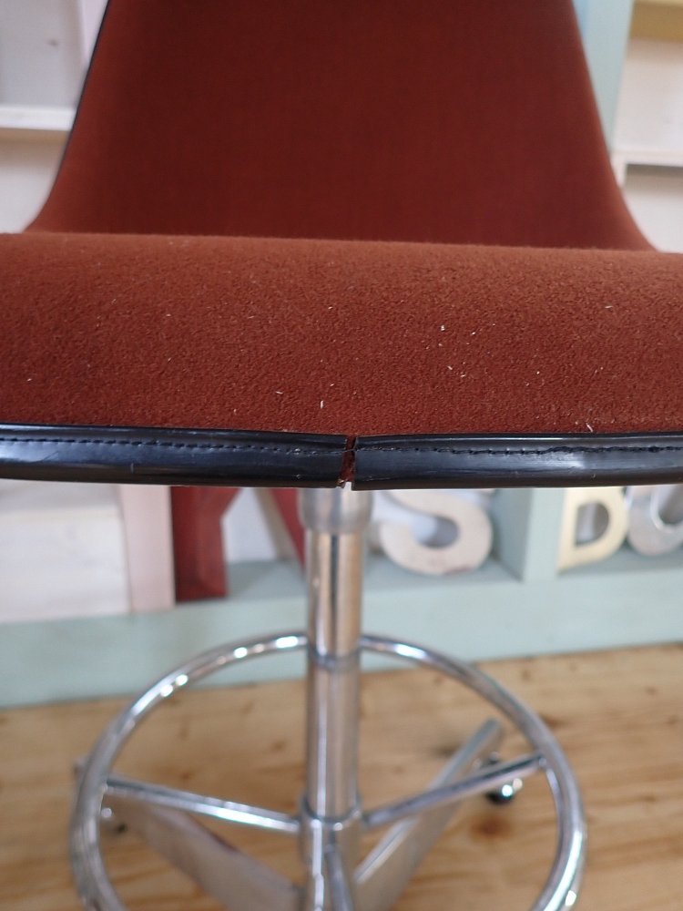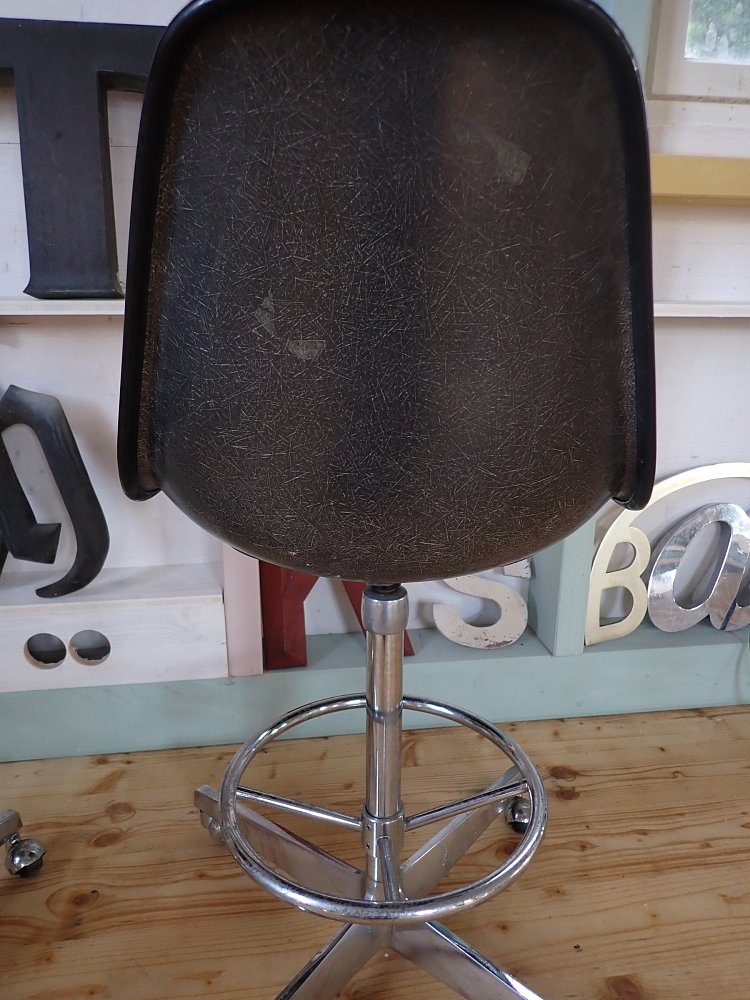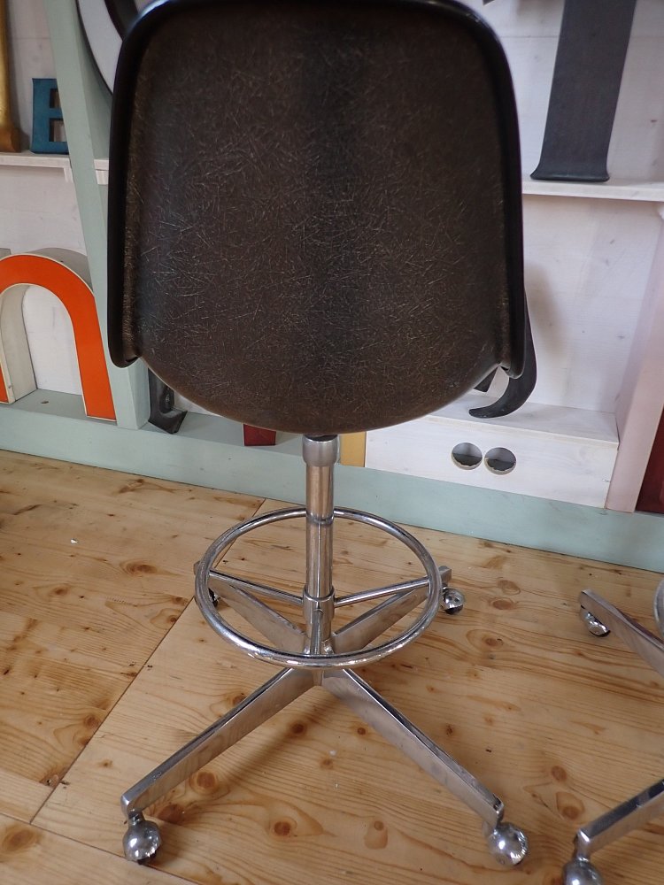Das verchromte Untergestell hat einen Fußablagering, ist durch ein Gewinde höhenverstellbar und hat Rollen. Die Sitzschale besteht aus Fiberglas und ist mit einem braunen gepolsterten Stoff überzogen. Durch die hohe Sitzfläche eignet sich der Stuhl gut an Thekenbereichen oder im Büro.