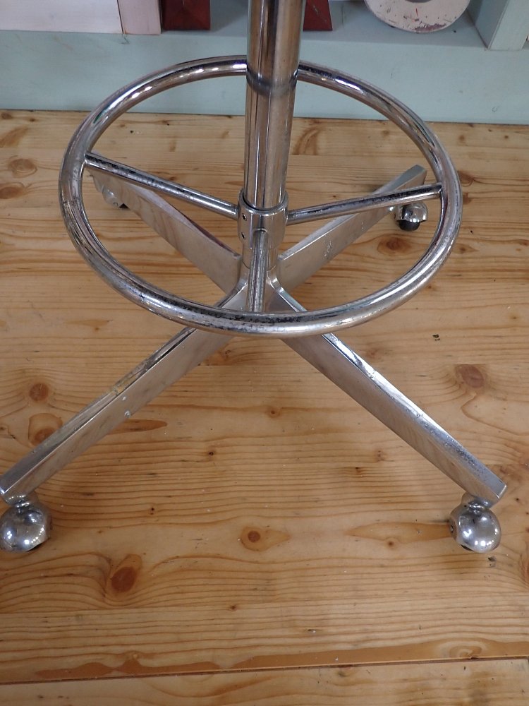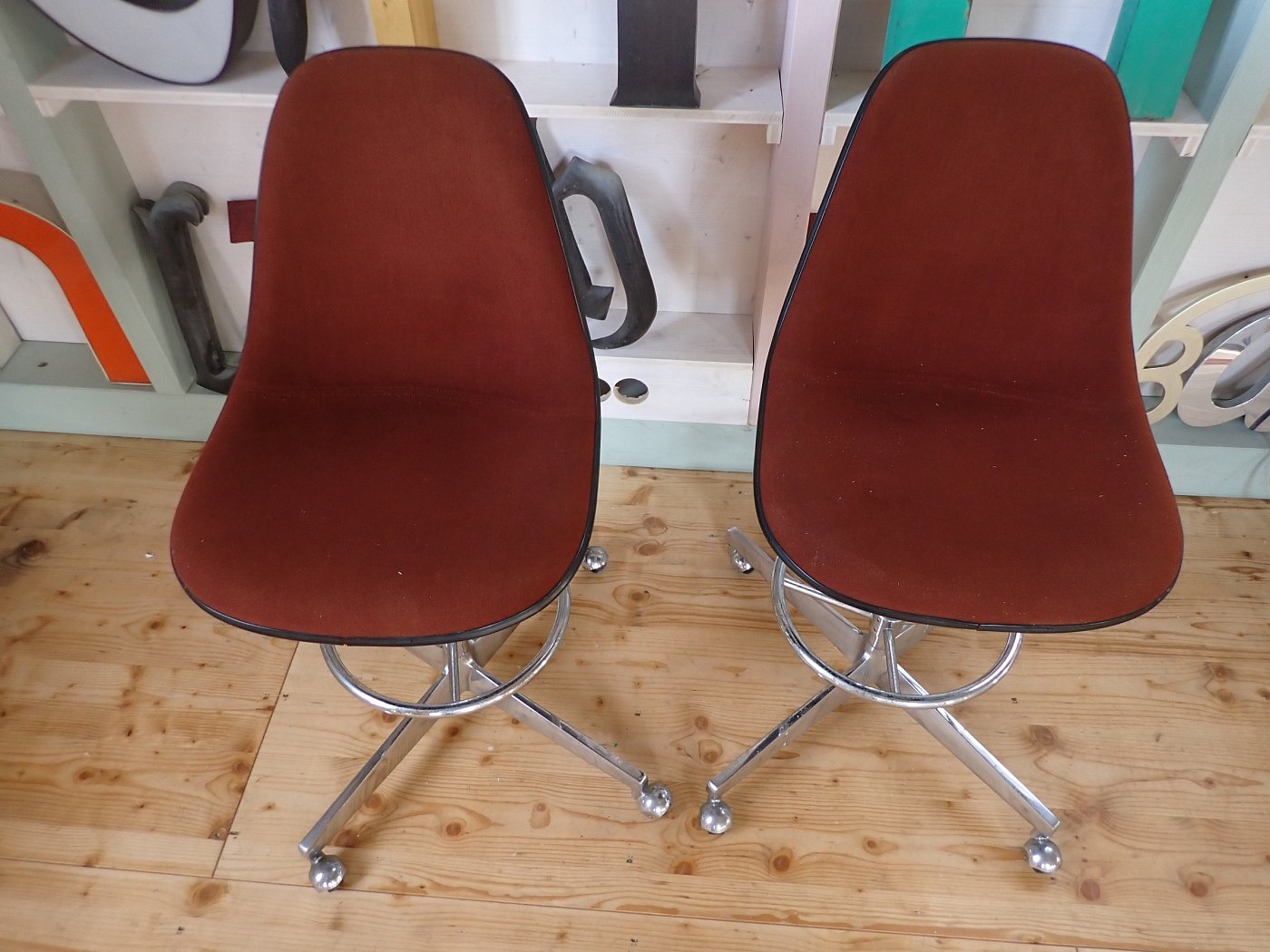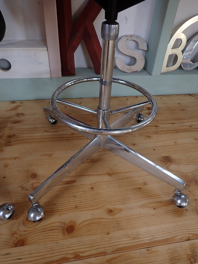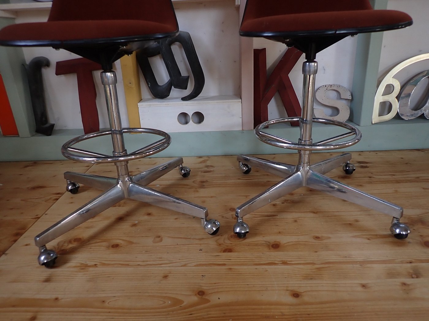 Das verchromte Untergestell hat einen Fußablagering, ist durch ein Gewinde höhenverstellbar und hat Rollen. Die Sitzschale besteht aus Fiberglas und ist mit einem braunen gepolsterten Stoff überzogen. Durch die hohe Sitzfläche eignet sich der Stuhl gut an Thekenbereichen oder im Büro.