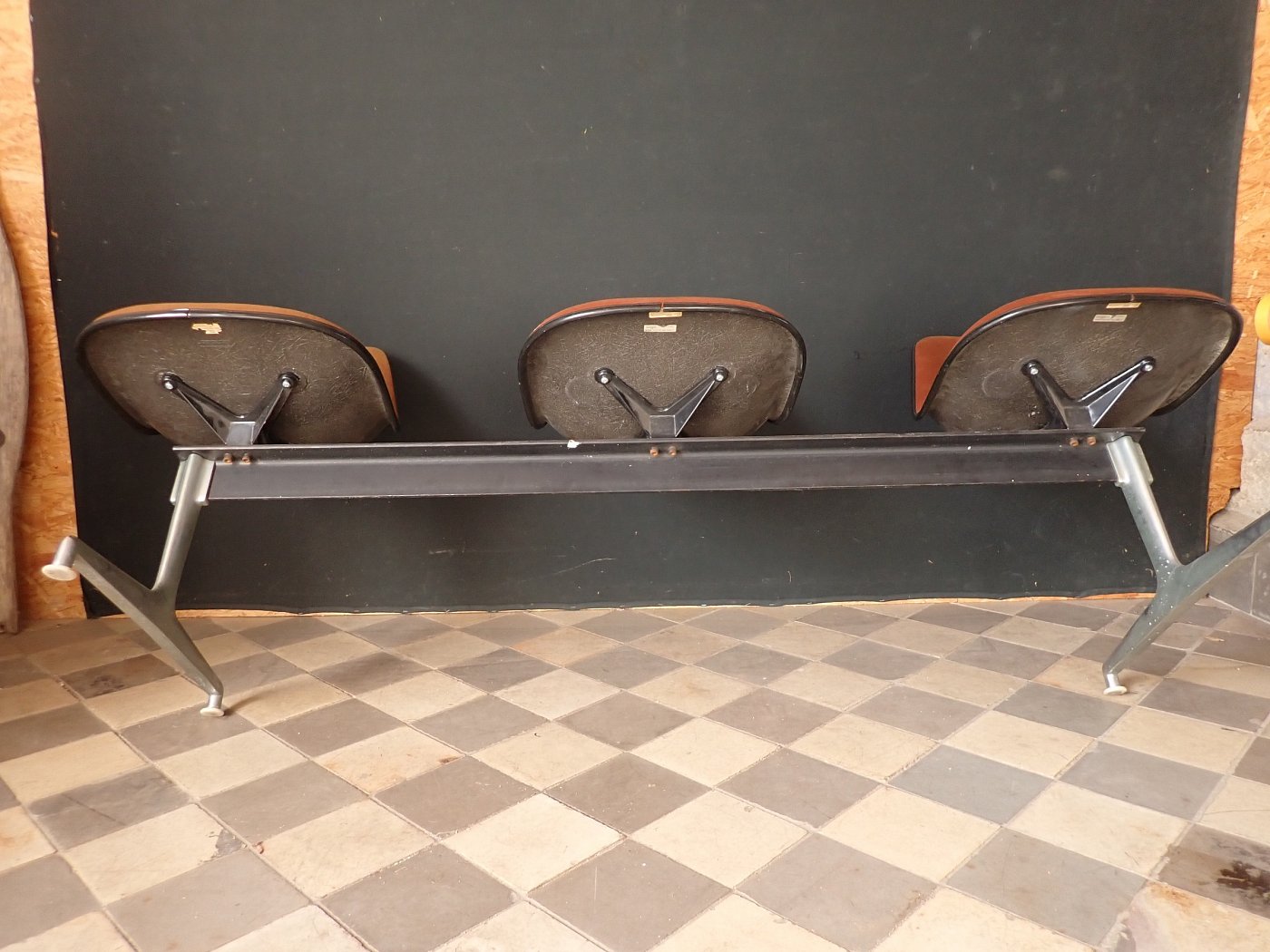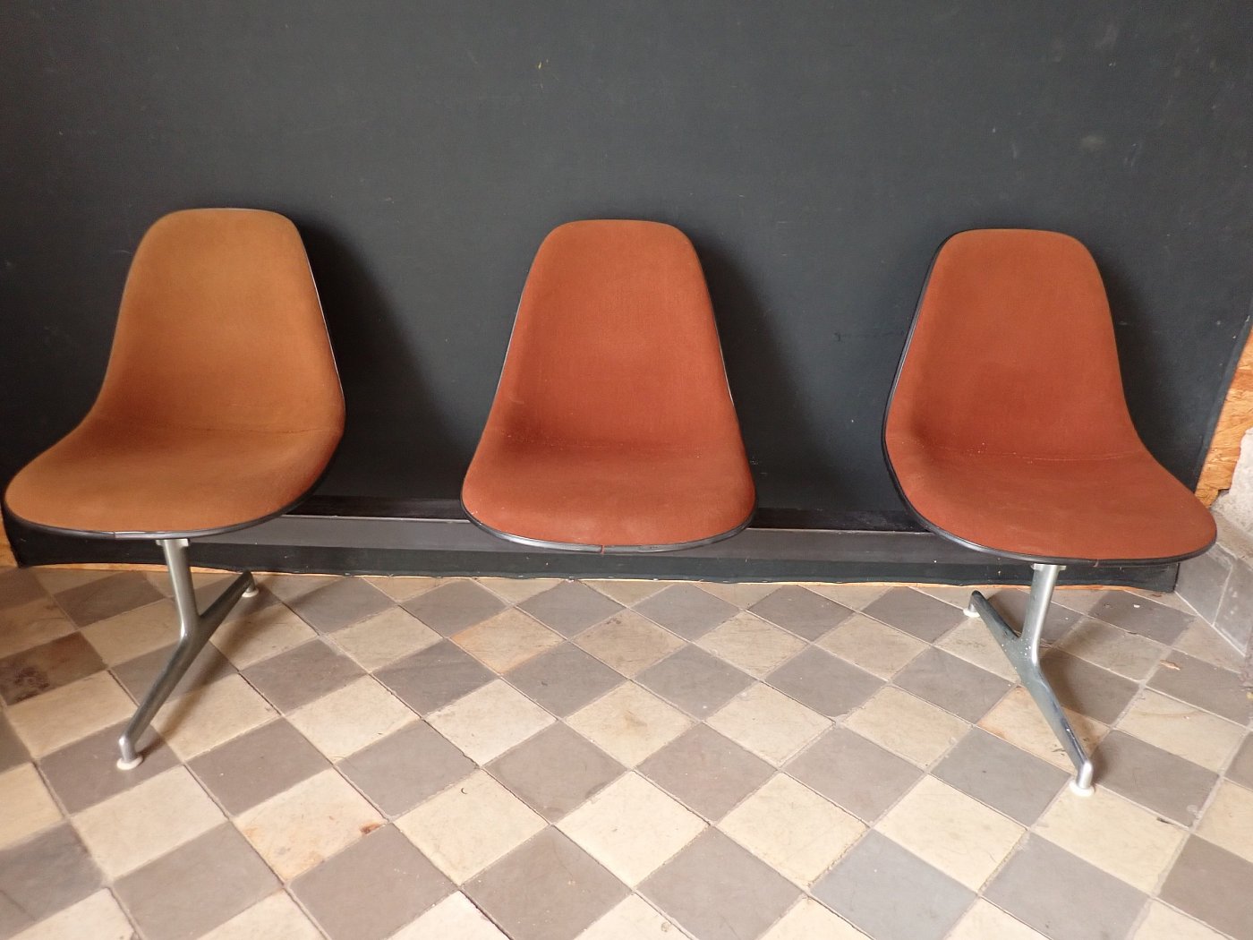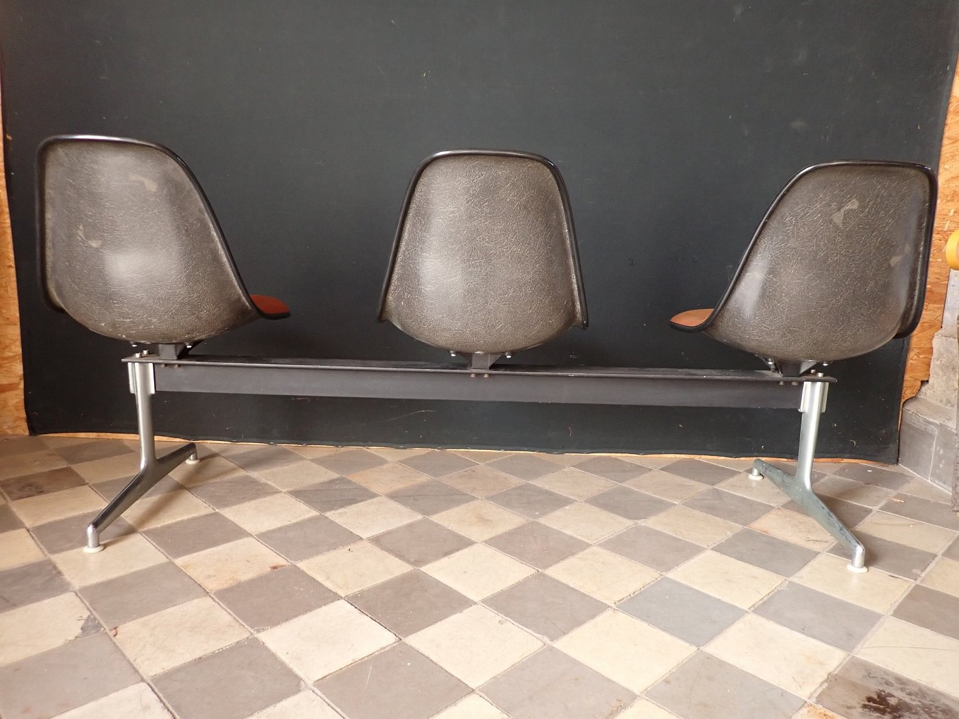 Zwei der drei Sitzschalen wurden von Hermann Miller produziert, und die einzelne etwas hellere Sitzschale wurde schon von Vitra produziert. Vermutlich sind die Sitzschalen nicht die Originale angebrachten Schalen. Da die Sitzschalen getrennt von dem Untergestell gelagert wurden, sind die vier Originalschrauben pro Stuhl nicht mehr dabei, diese wurden durch neue passende Schrauben ersetzt. Die Sitzschalen befinden sich in einem guten Zustand, auch wenn die Sitzbank übliche Gebrauchsspuren aufweist.