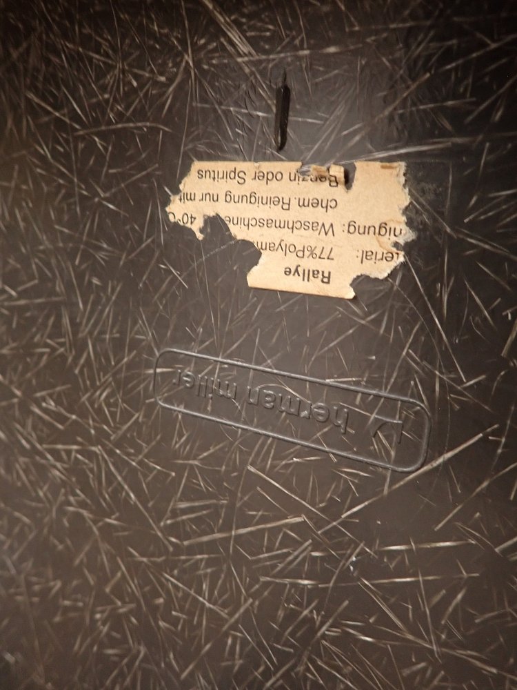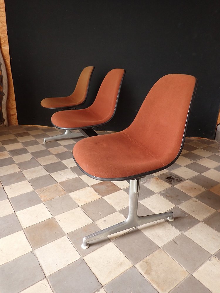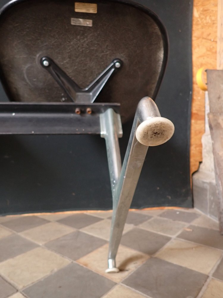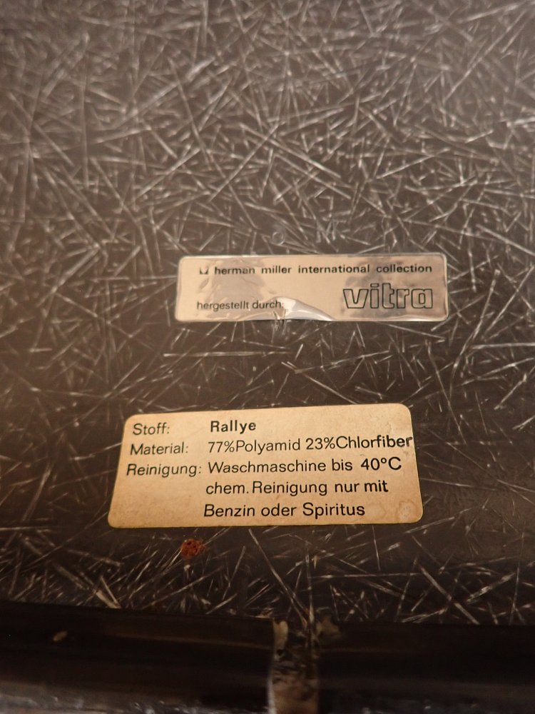 Zwei der drei Sitzschalen wurden von Hermann Miller produziert, und die einzelne etwas hellere Sitzschale wurde schon von Vitra produziert. Vermutlich sind die Sitzschalen nicht die Originale angebrachten Schalen. Da die Sitzschalen getrennt von dem Untergestell gelagert wurden, sind die vier Originalschrauben pro Stuhl nicht mehr dabei, diese wurden durch neue passende Schrauben ersetzt. Die Sitzschalen befinden sich in einem guten Zustand, auch wenn die Sitzbank übliche Gebrauchsspuren aufweist.