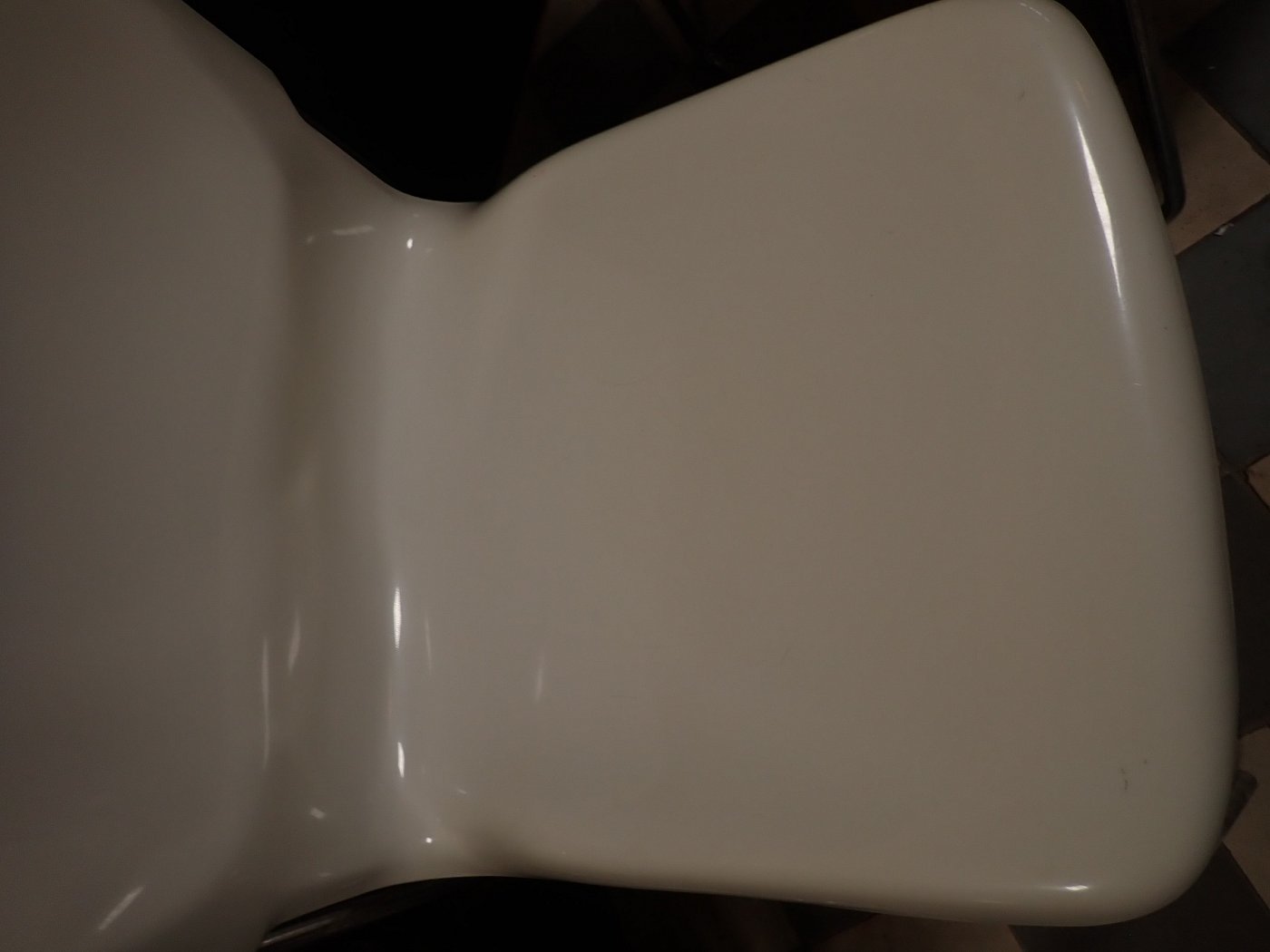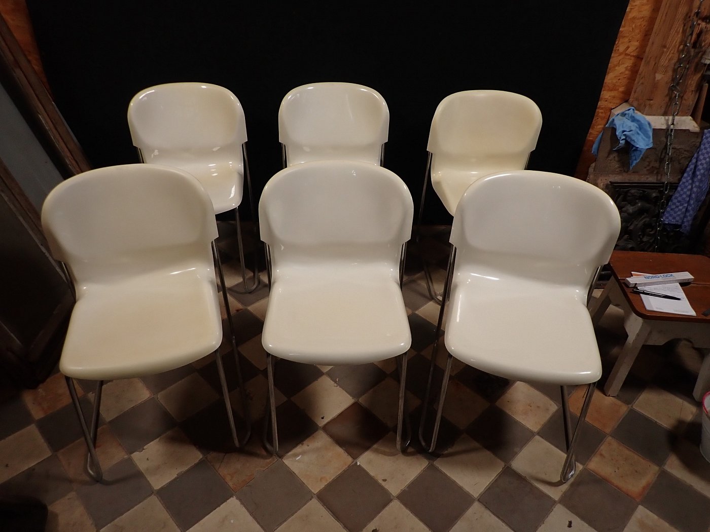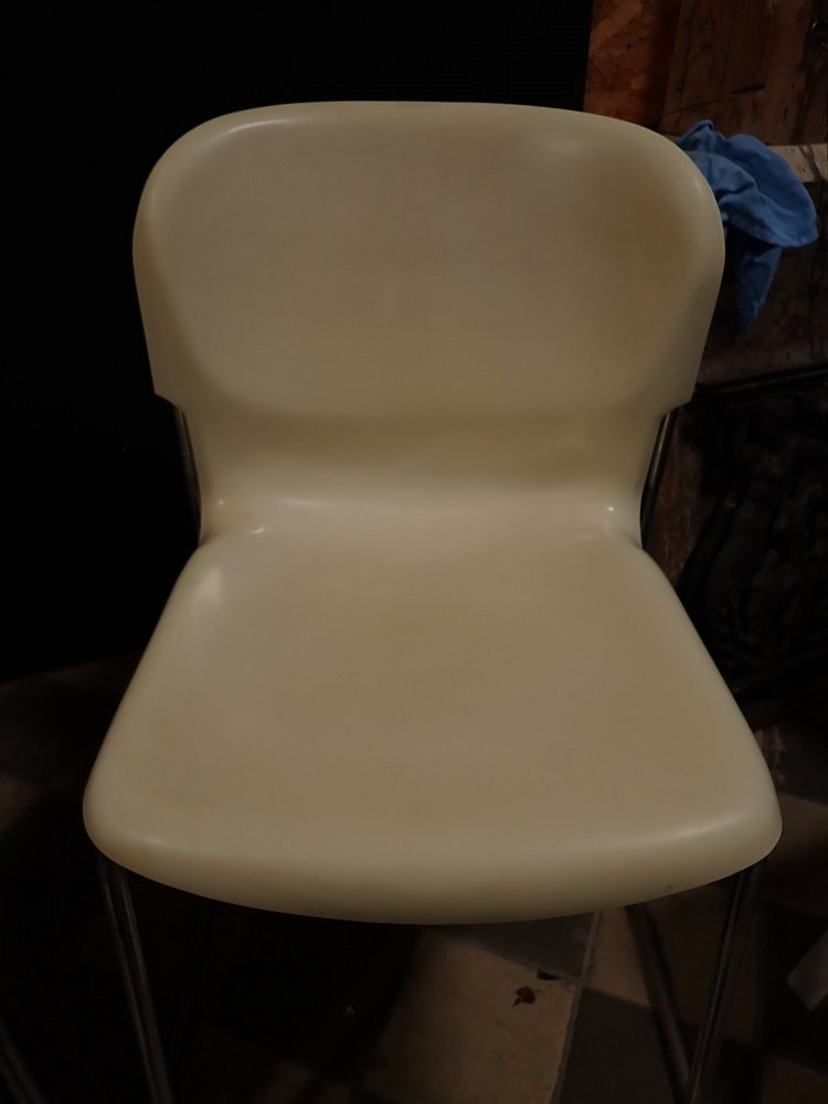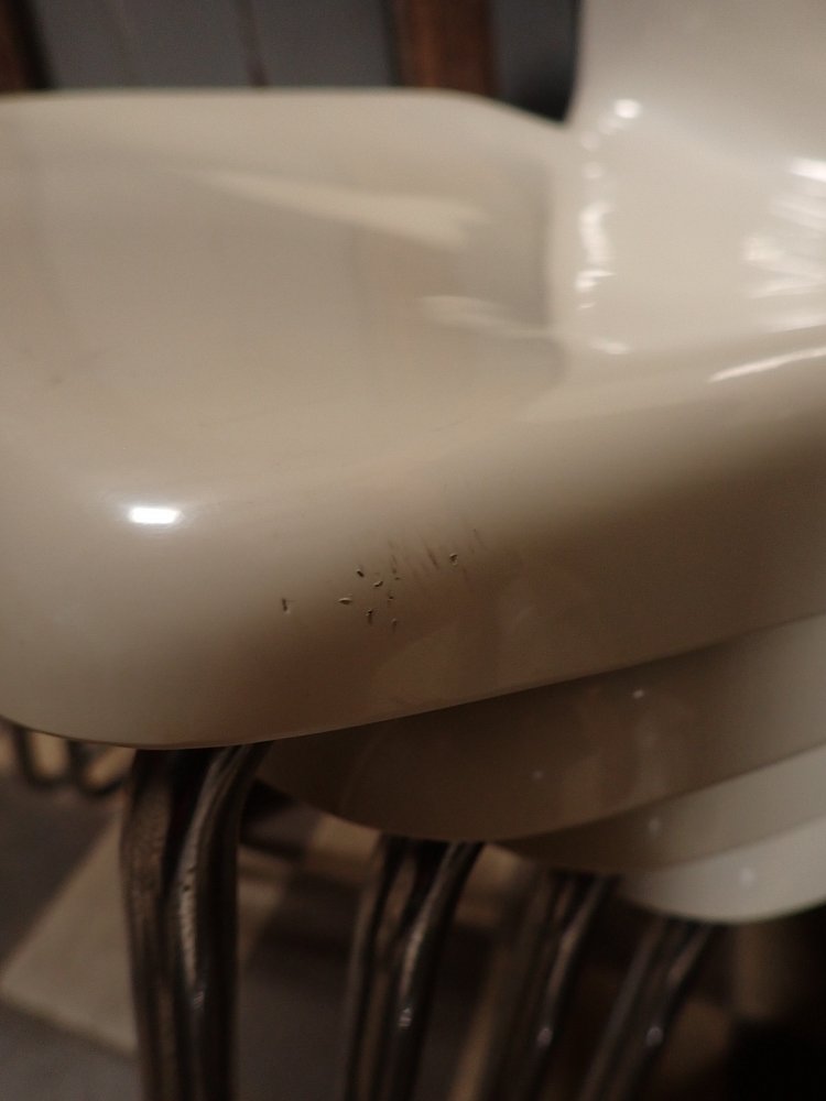 Es sind leichte Kratzer und Farbschrammen auf den Stühlen zu erkennen. Stellenweiße sind die Sitzschalen gelblich ausgebleicht.