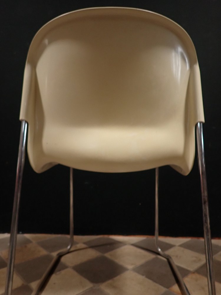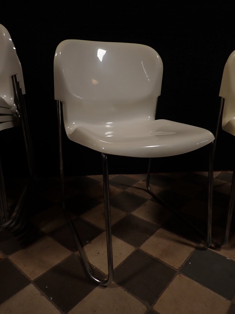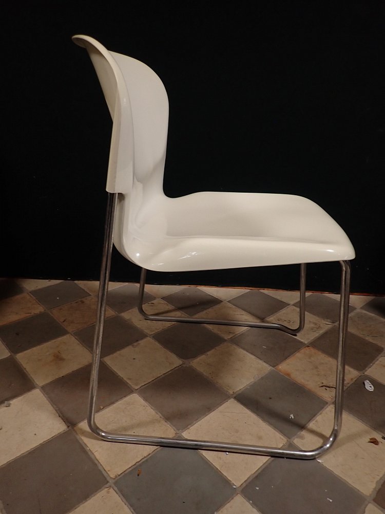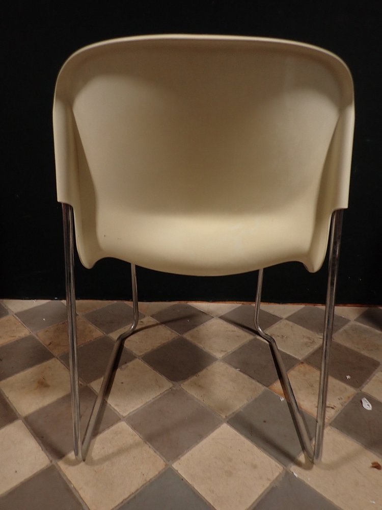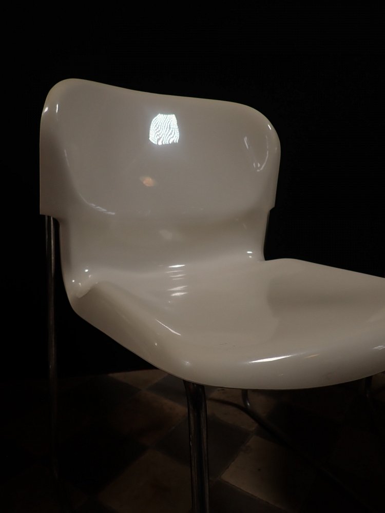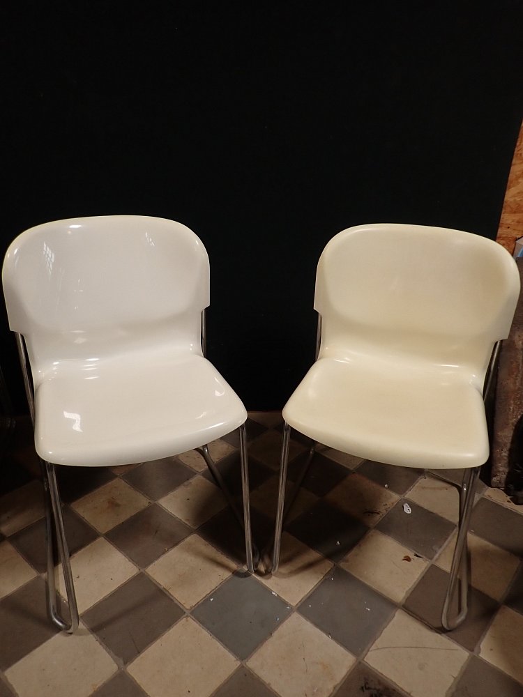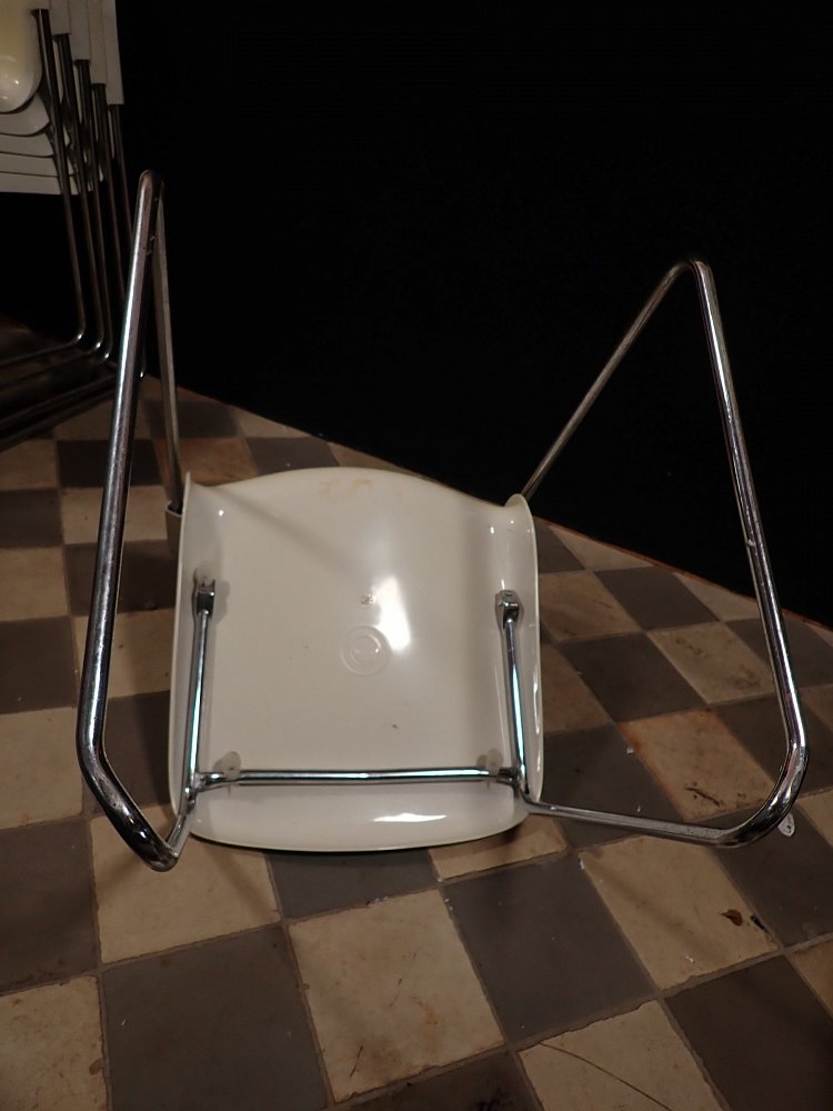 Die Stühle haben eine cremeweiße Kunststoffsitzschale die auf Metallfüßen steht. Die Sitzschale hat eine außergewöhnliche aber bequeme Sitzfläche. Auf die Unterseite sind die Stühle mit "Made in West-Germany Design Gerd Lange" gemarkt.