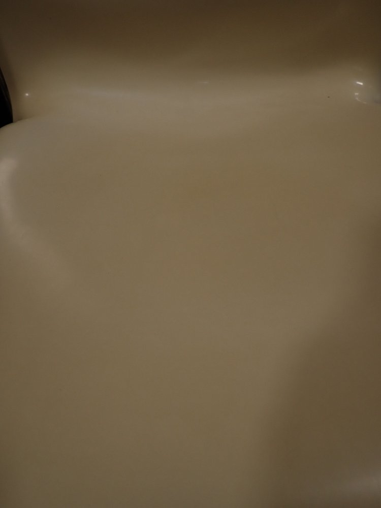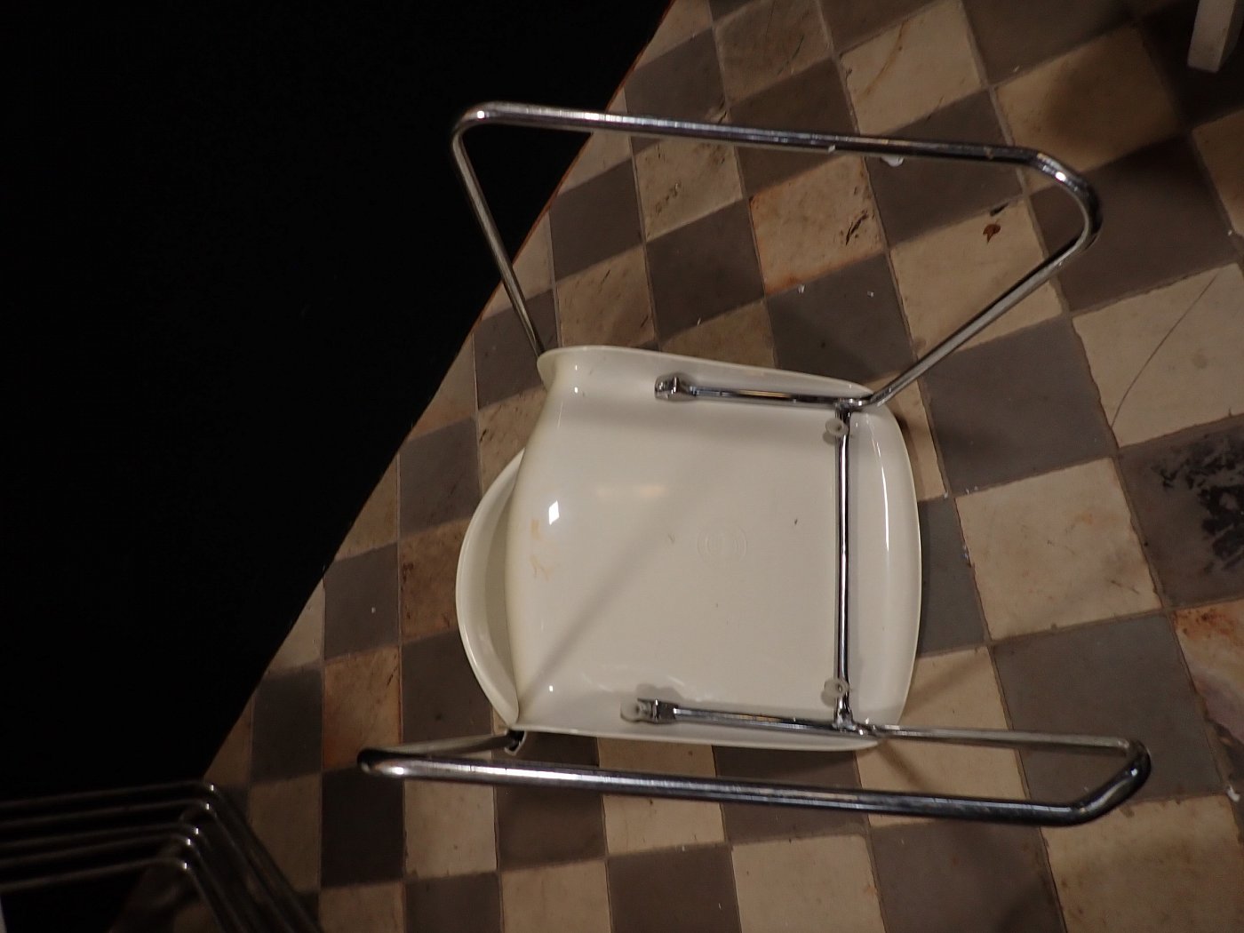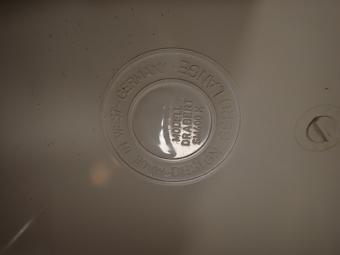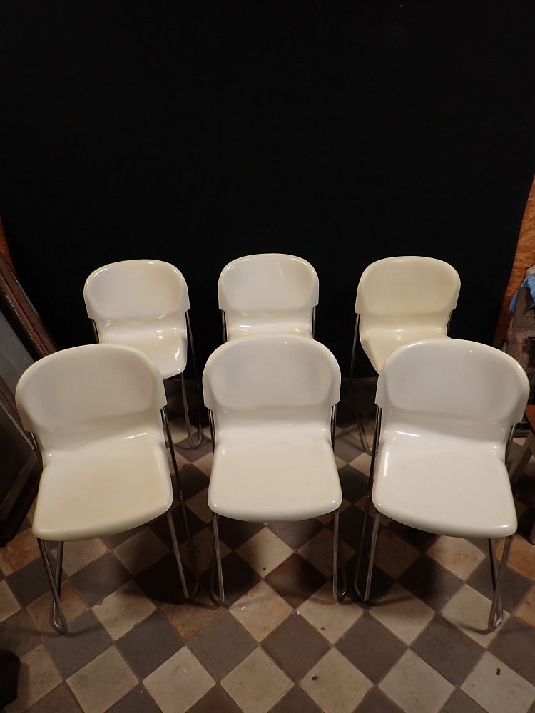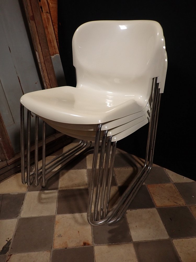Die Stühle haben eine cremeweiße Kunststoffsitzschale die auf Metallfüßen steht. Die Sitzschale hat eine außergewöhnliche aber bequeme Sitzfläche. Auf die Unterseite sind die Stühle mit "Made in West-Germany Design Gerd Lange" gemarkt.