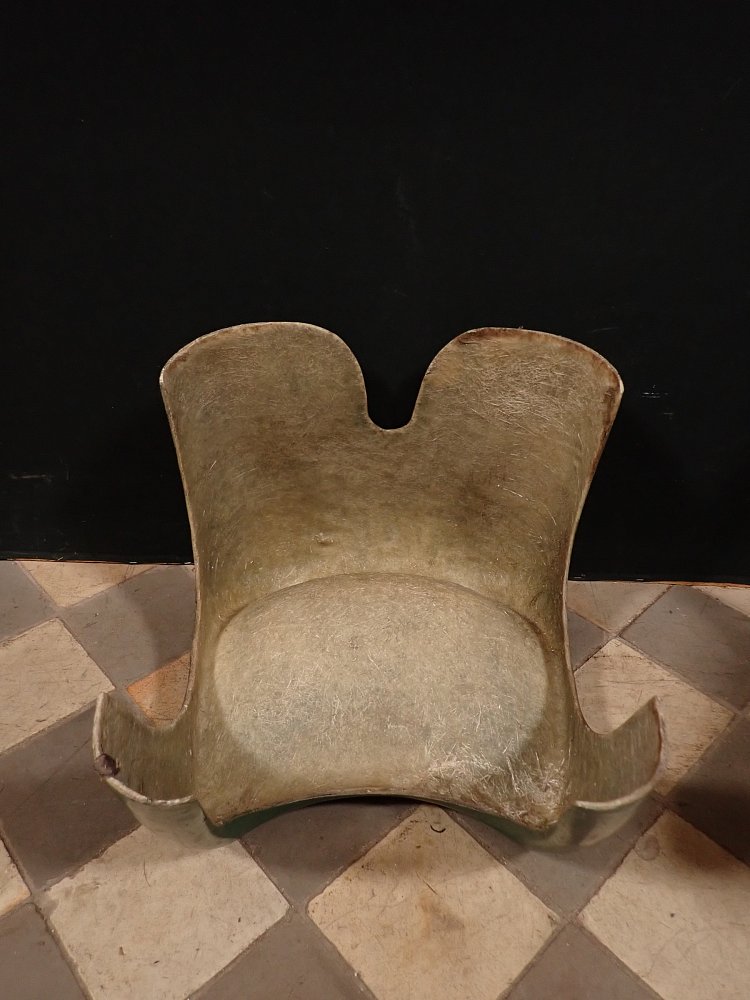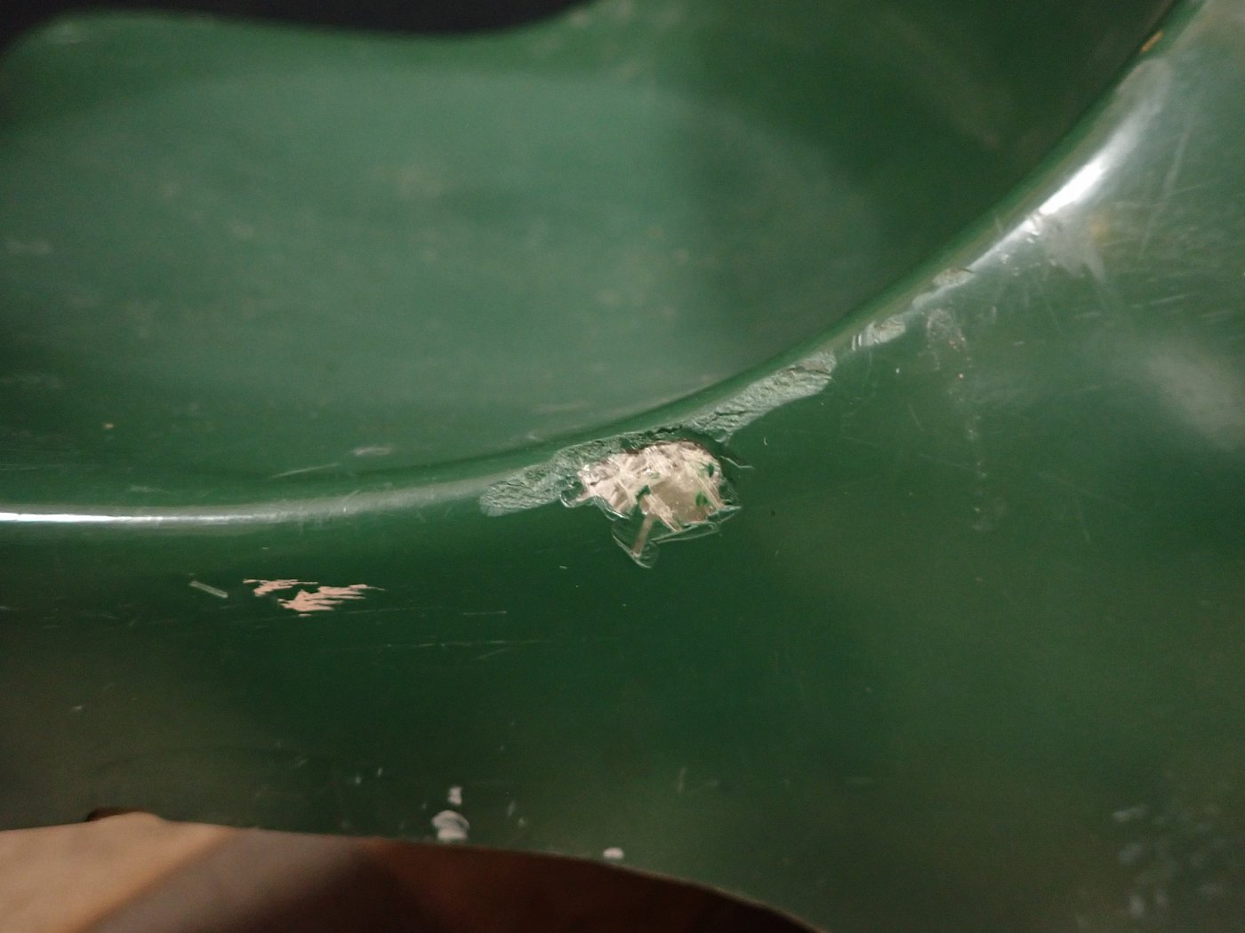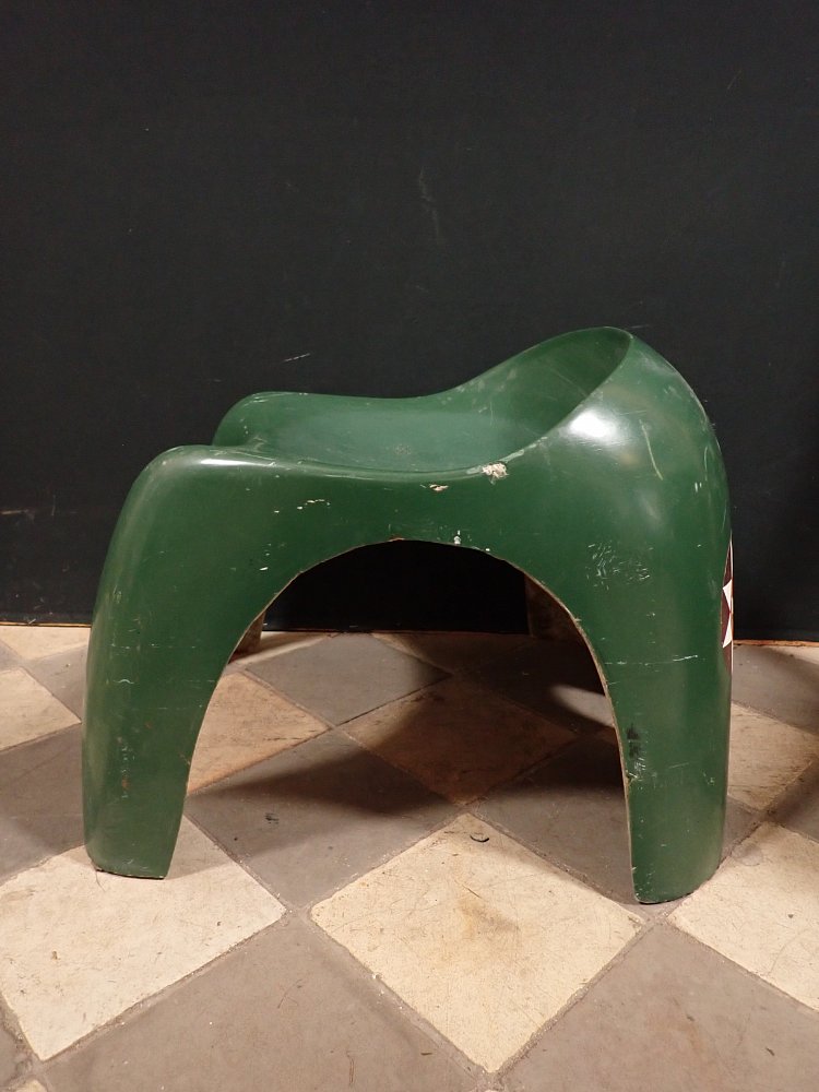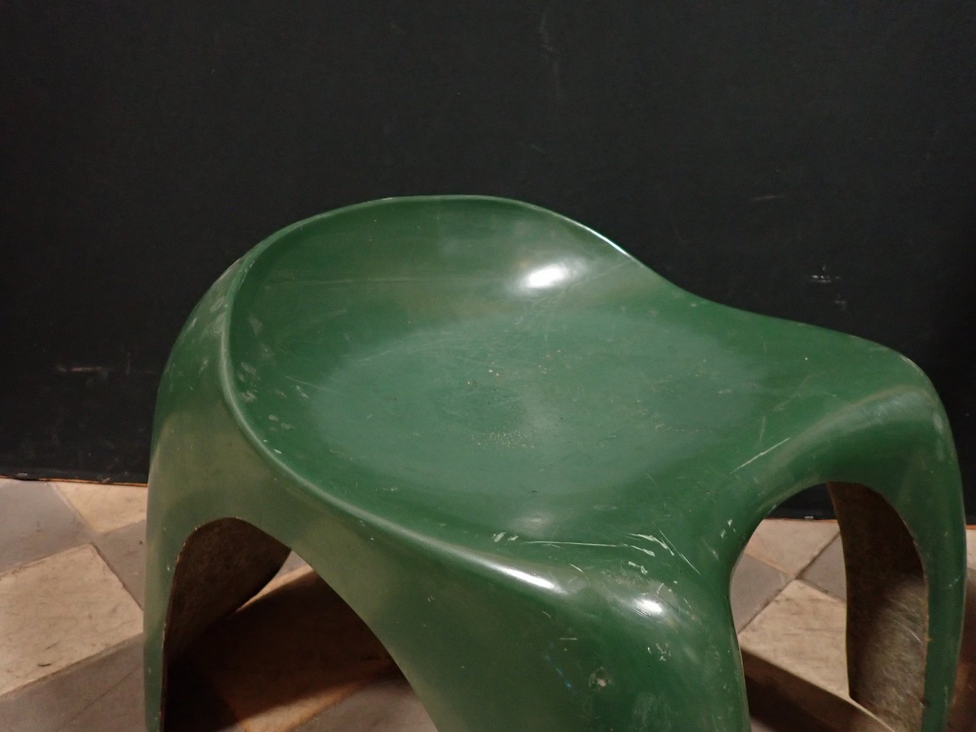Der grüne Hocker wurde offensichtlich intensiv genutzt, zumindest hat die Oberfläche zahlreiche Kratzer und Schrammen. Auf der Unterseite ist die Basis des Hockers - das Fiberglas zu sehen.