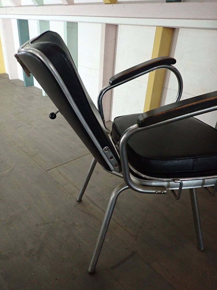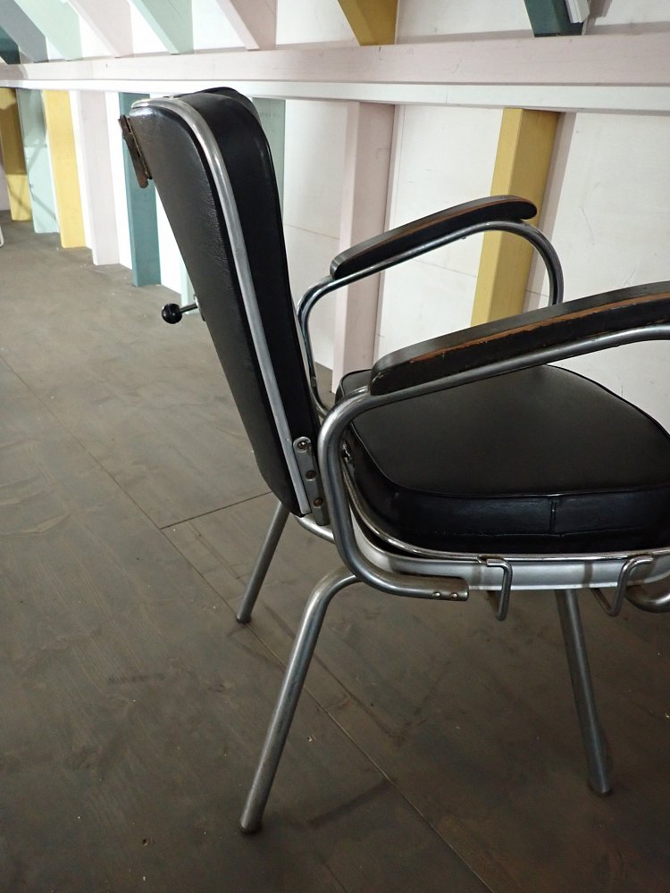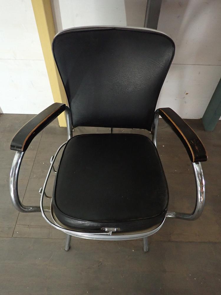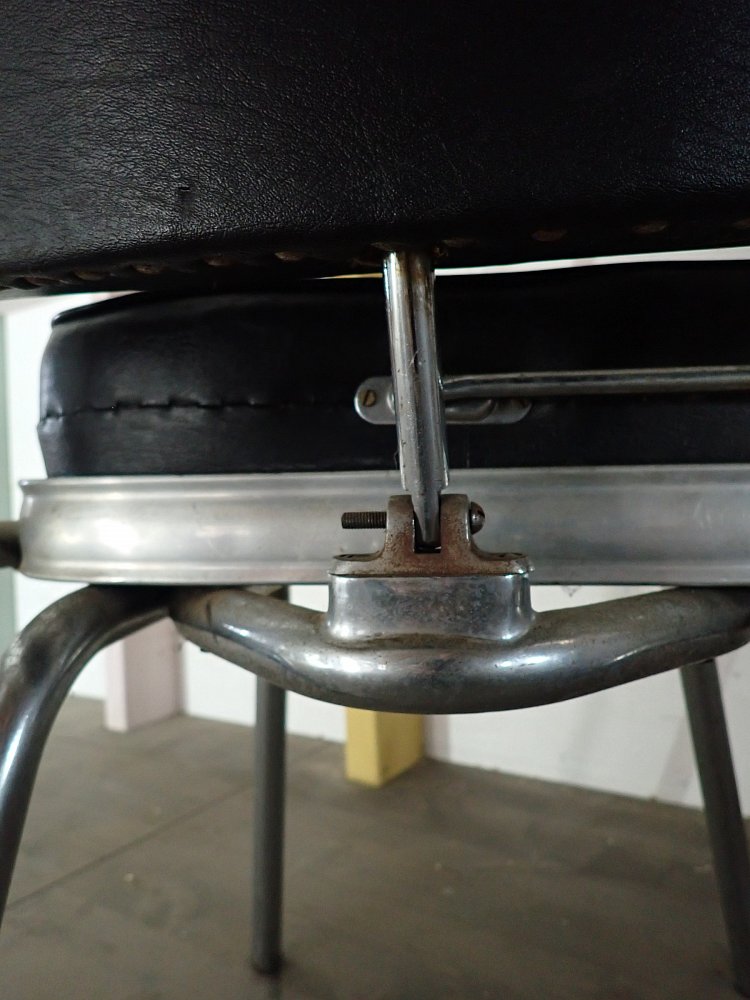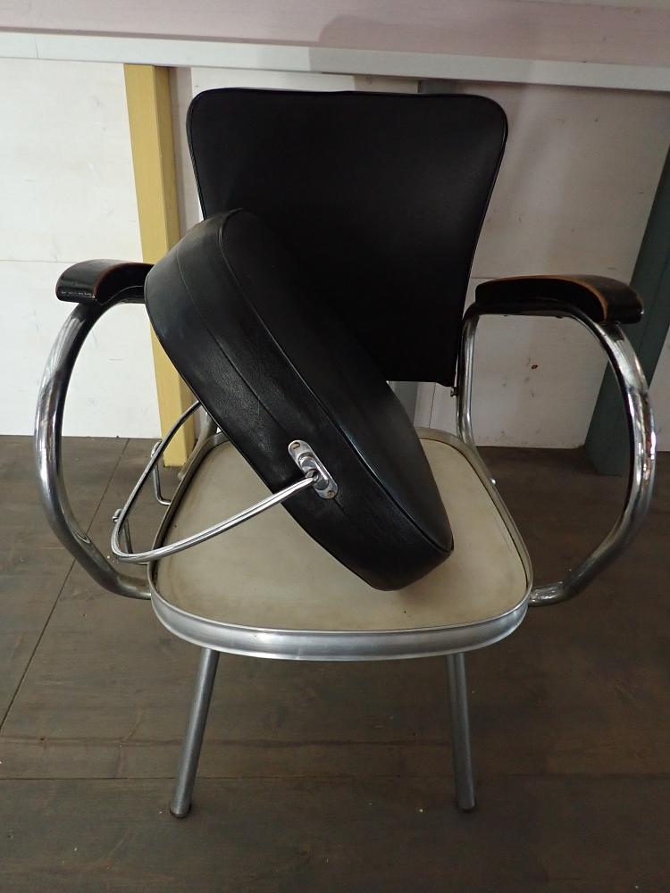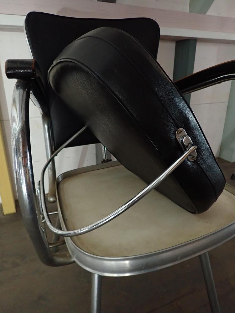 Der Friseurstuhl hat eine Verstellbare Lehne, welche durch einen Hebel an der Rückenlehne bedient werden kann. Eine Vorrichtung für eine Kopfstütze ist vorhanden, die dazugehörige Kopfstütze allerdings nicht. Die Besonderheit an dem Friseurstuhl ist die Sitzfläche, die man wenden kann, vermutlich um abgeschnittenes Haar einfacher entfernen zu können. Der Bezug des Stuhls besteht aus Kunstleder.