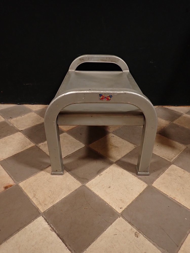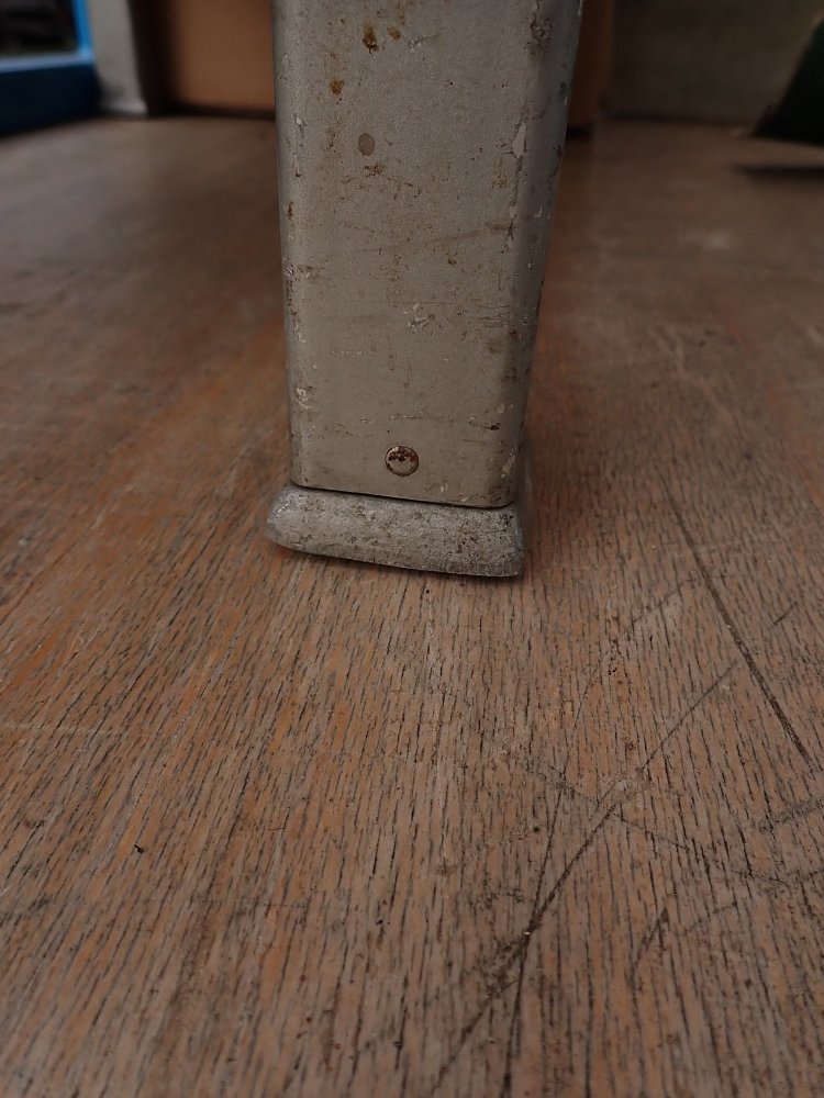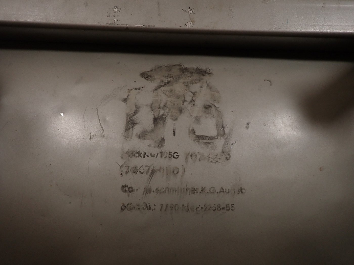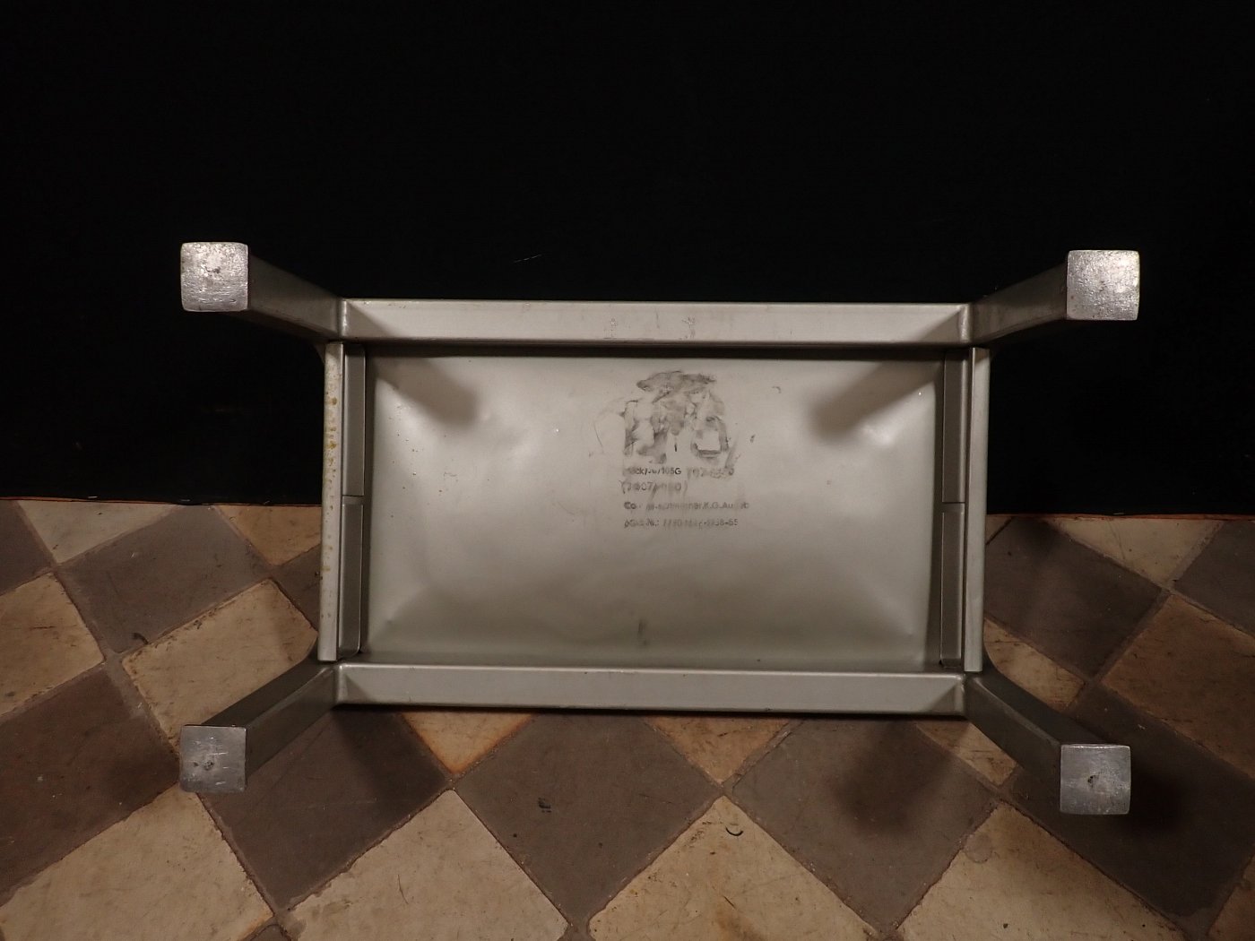Auf der Unterseite sind die Reste eines alten Stempels zu sehen. Bei der Recherche über den Hocker haben wir einen ähnlichen gefunden, der auf der Unterseite ebenso gemarkt ist und den Aufdruck US Army besitzt.
