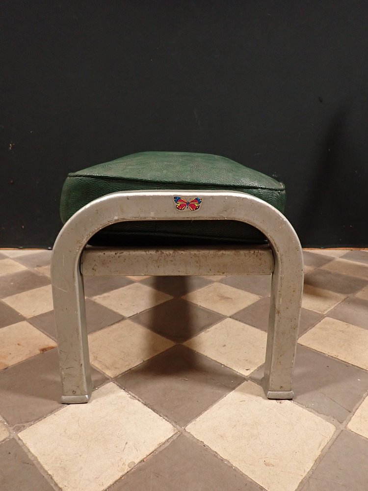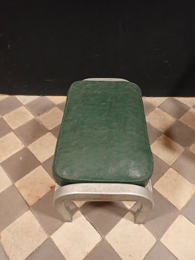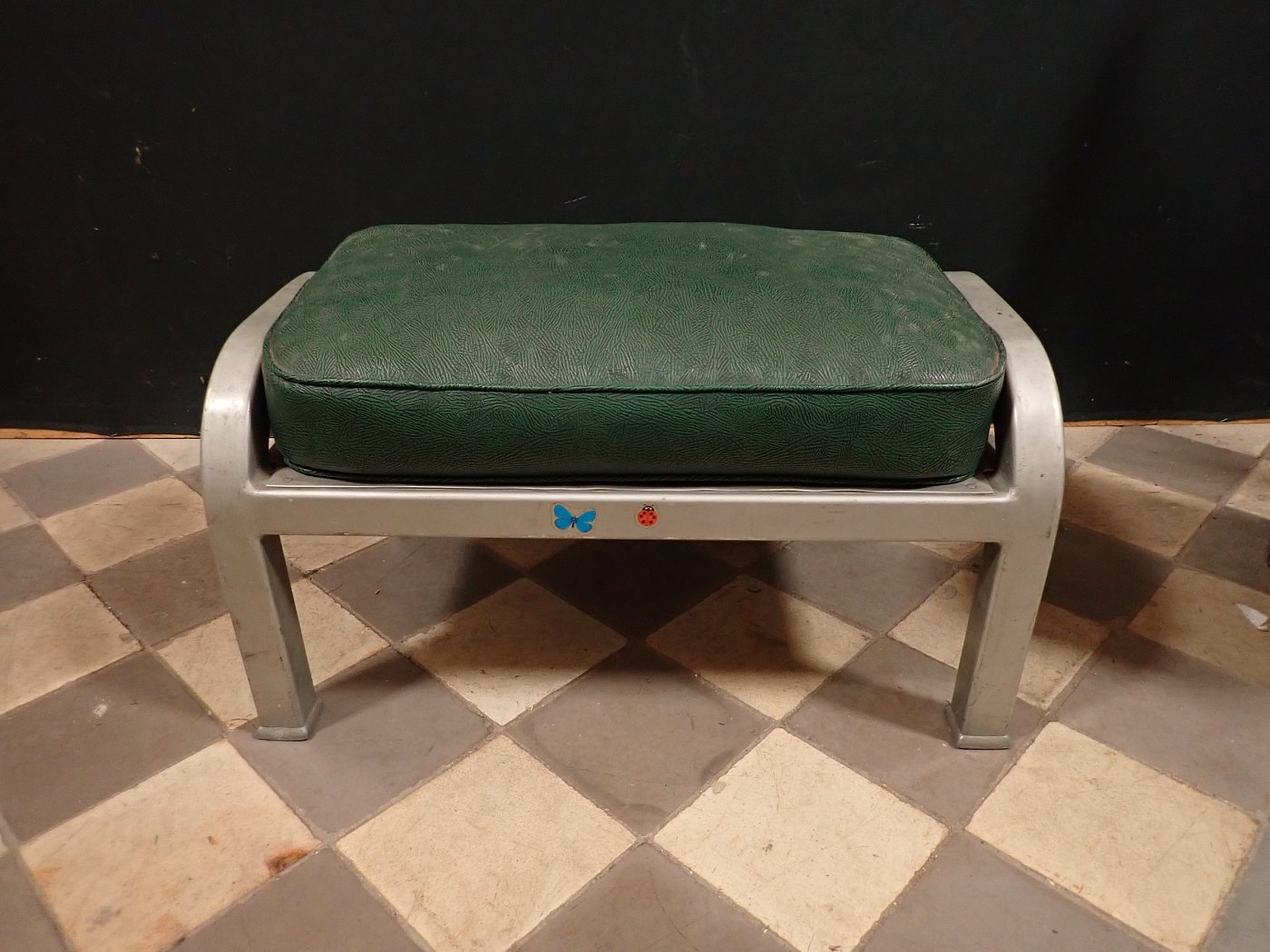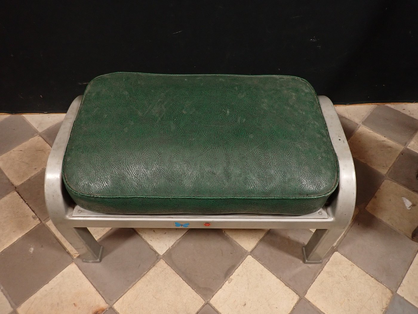 Der kleine Hocker ist mit einem dicken, herausnehmbaren Polster aus grünem Kunstleder ausgestattet.