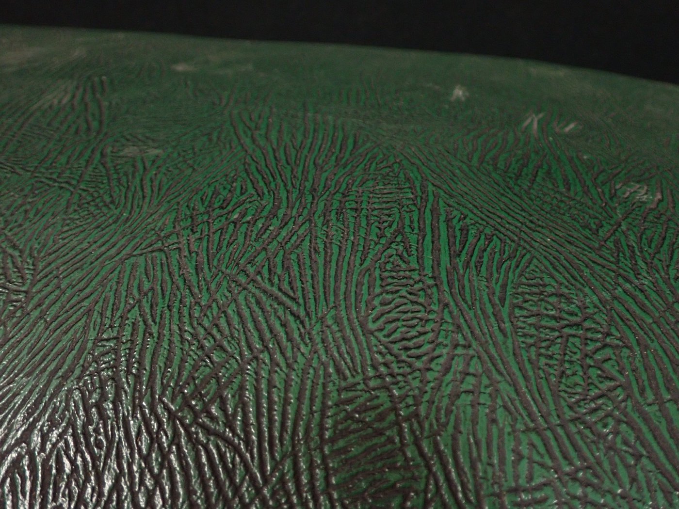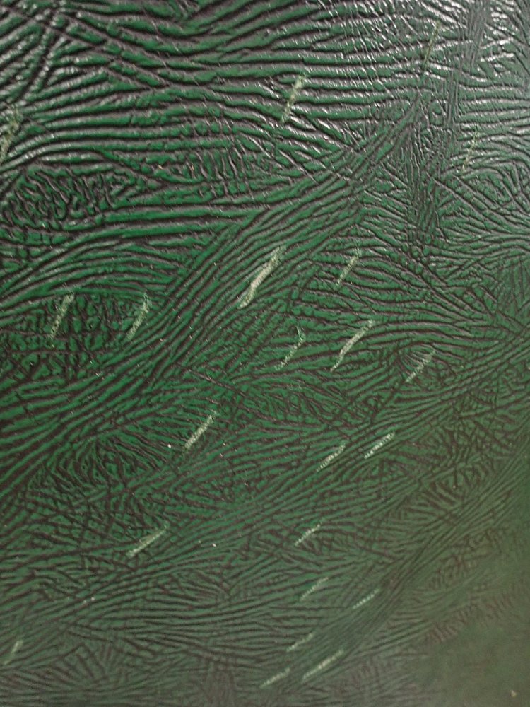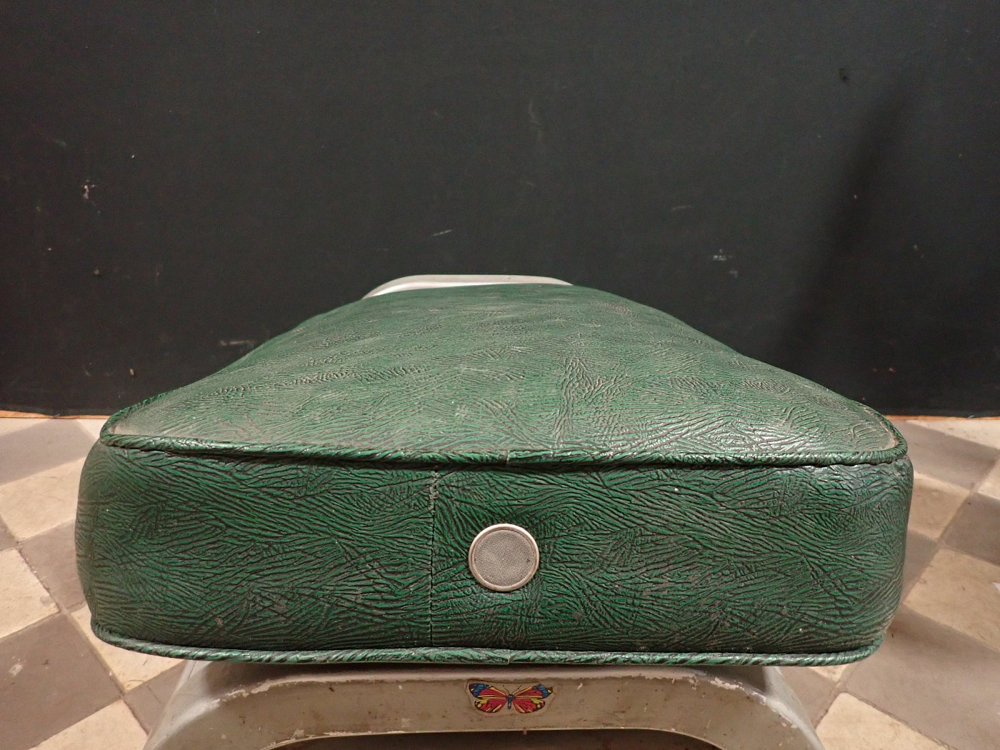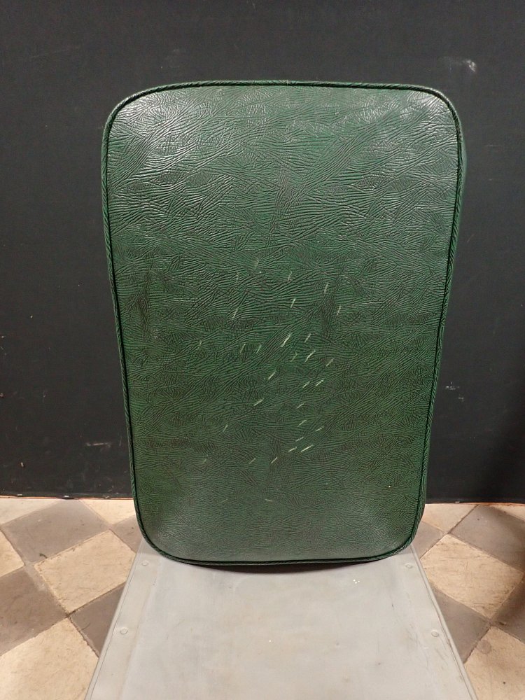 Der kleine Hocker ist mit einem dicken, herausnehmbaren Polster aus grünem Kunstleder ausgestattet.